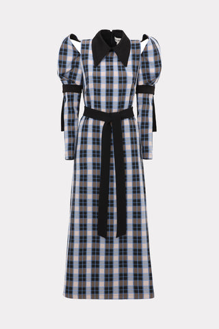 Stylish Cold Shoulder Long Sleeve Dress With Belt Blue Check