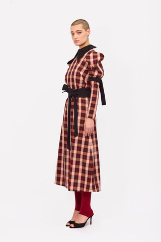 Stylish Cold Shoulder Long Sleeve Dress With Belt Red Check