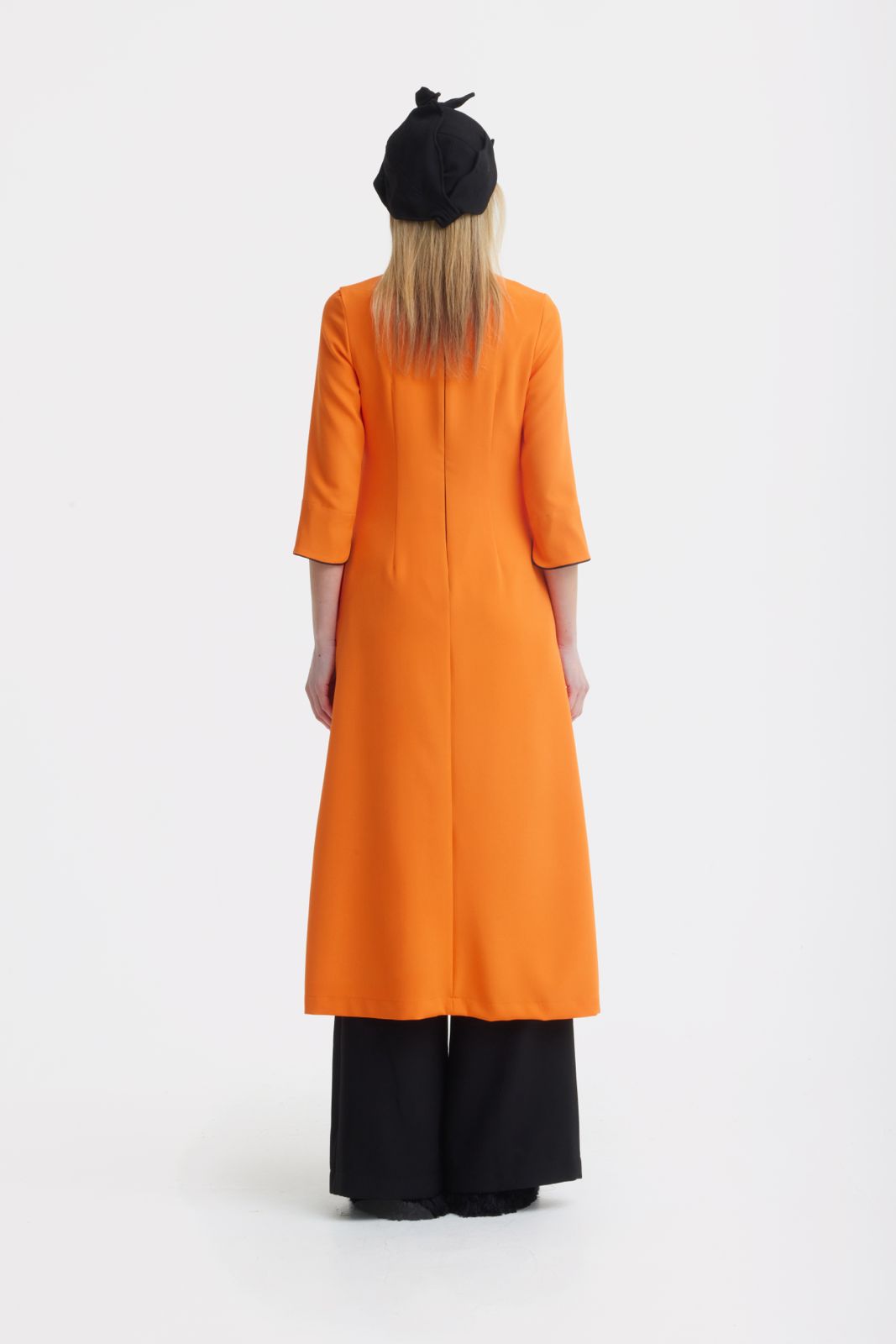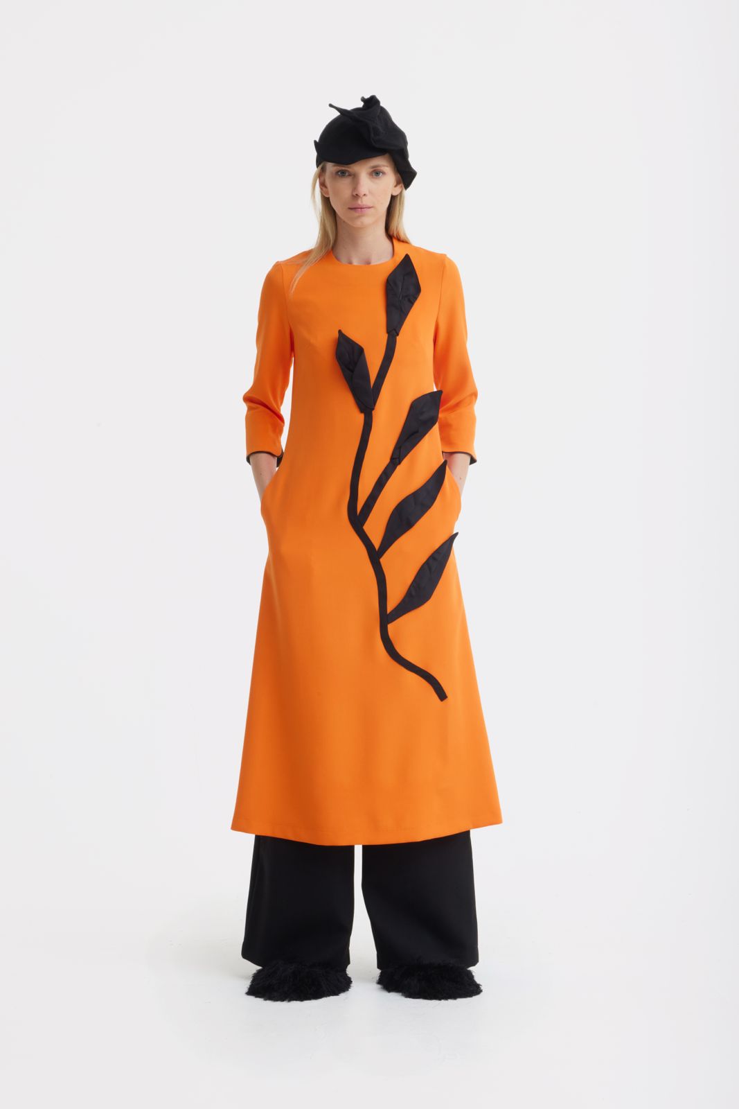 A wearable work of art. This ankle-length orange dress features a sculptural black appliqué inspired by botanical forms, turning clean tailoring into visual poetry. Crafted from medium-weight suiting viscose with a hint of stretch, it offers structure with comfort. The semi-fitted silhouette and ¾ sleeves balance modern simplicity with creative refinement. Finished with a hidden back zipper and turned-up cuffs, it’s a perfect expression of Julia Allert’s philosophy: art, craftsmanship, and individuality in harmony.