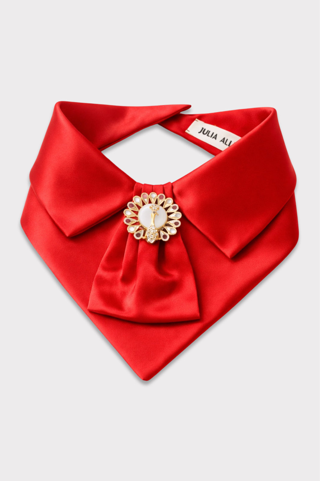 Detachable design · Satin finish · Structured collar · Draped jabot front · Decorative brooch detail · Red