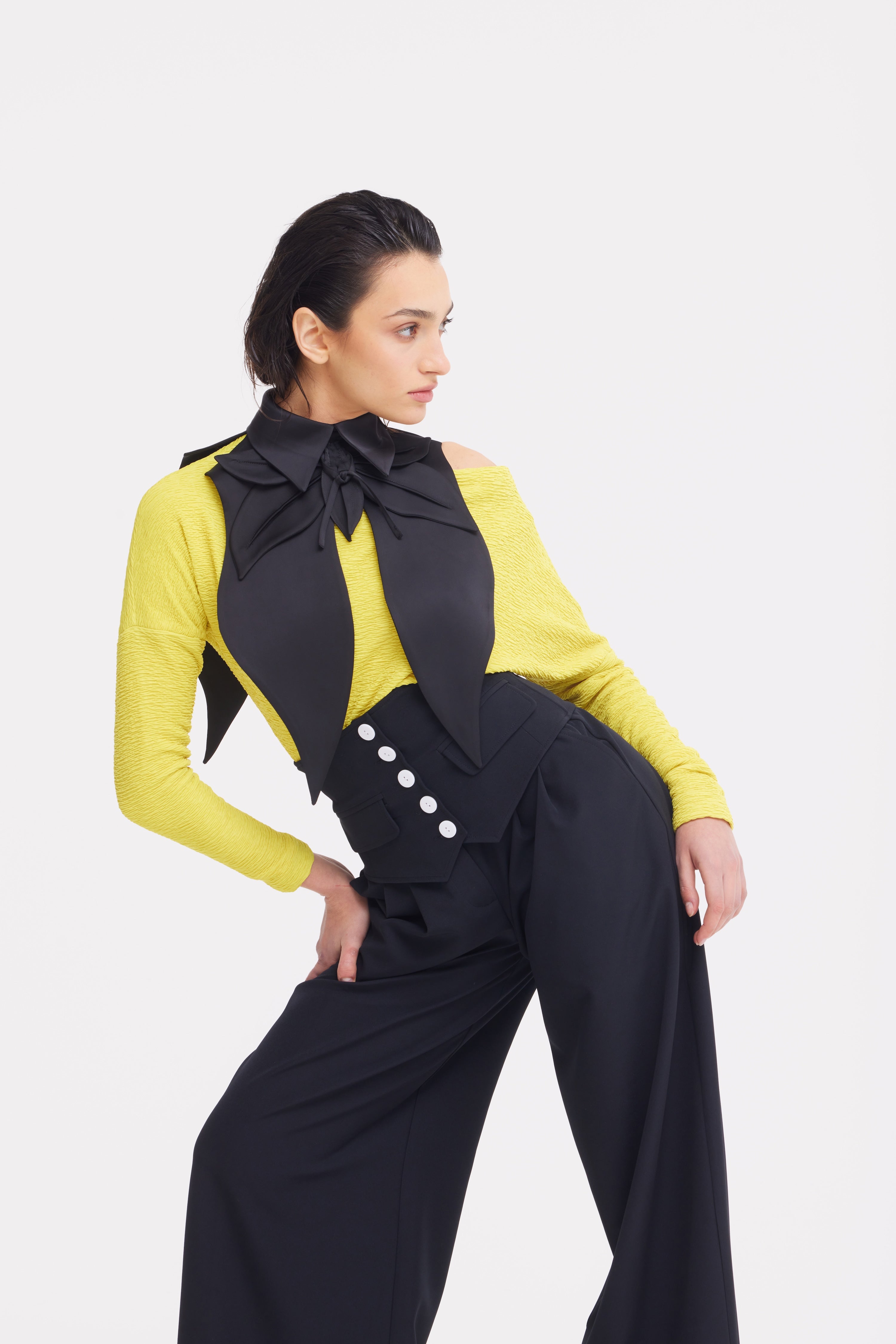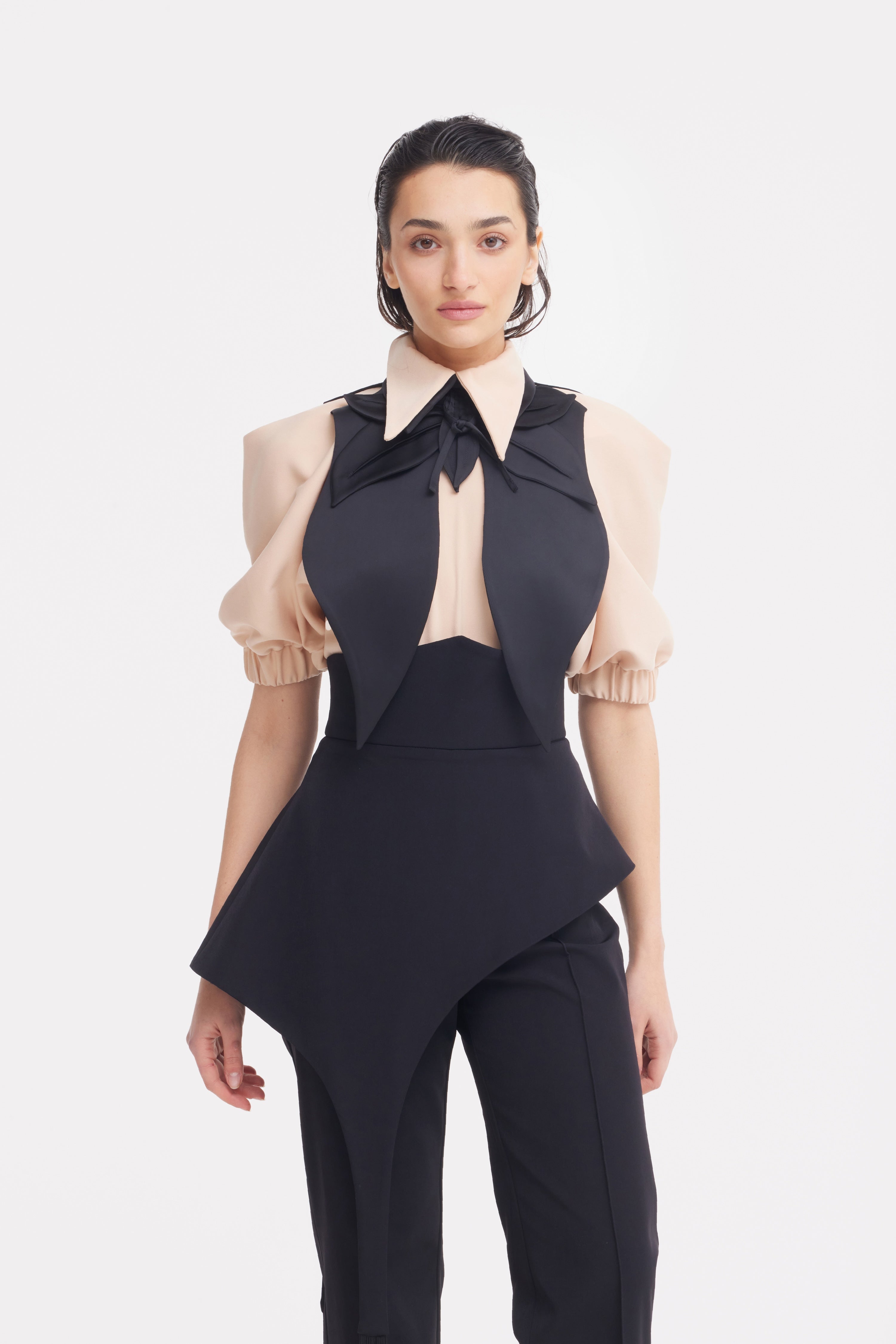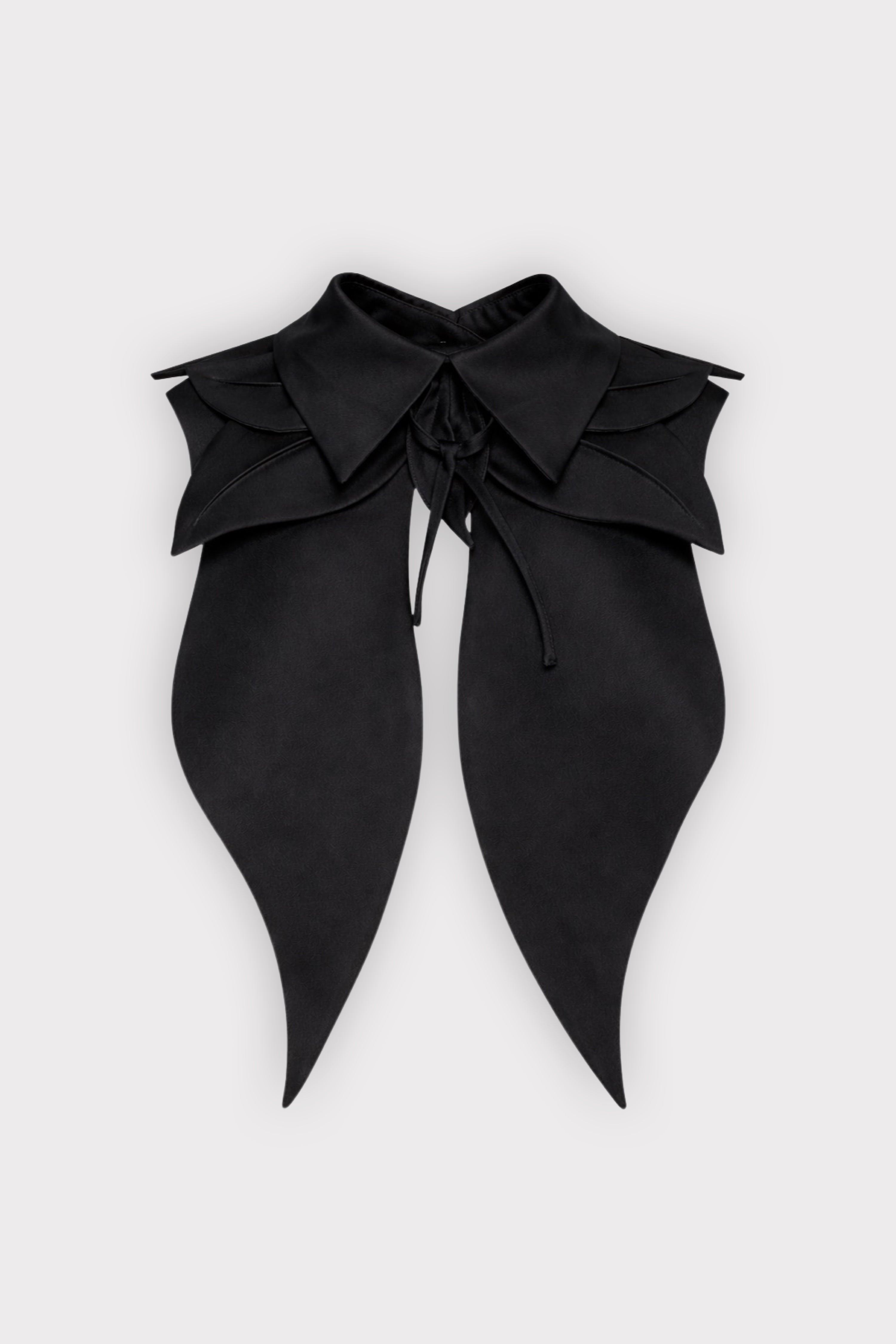 A bold reinterpretation of classic tailoring through sculptural form. Crafted from smooth satin, this oversized bib collar features layered, petal-like panels that extend over the shoulders, creating a strong architectural silhouette. The pointed collar and adjustable tie closure add structure and versatility, allowing the piece to frame the neckline with precision.