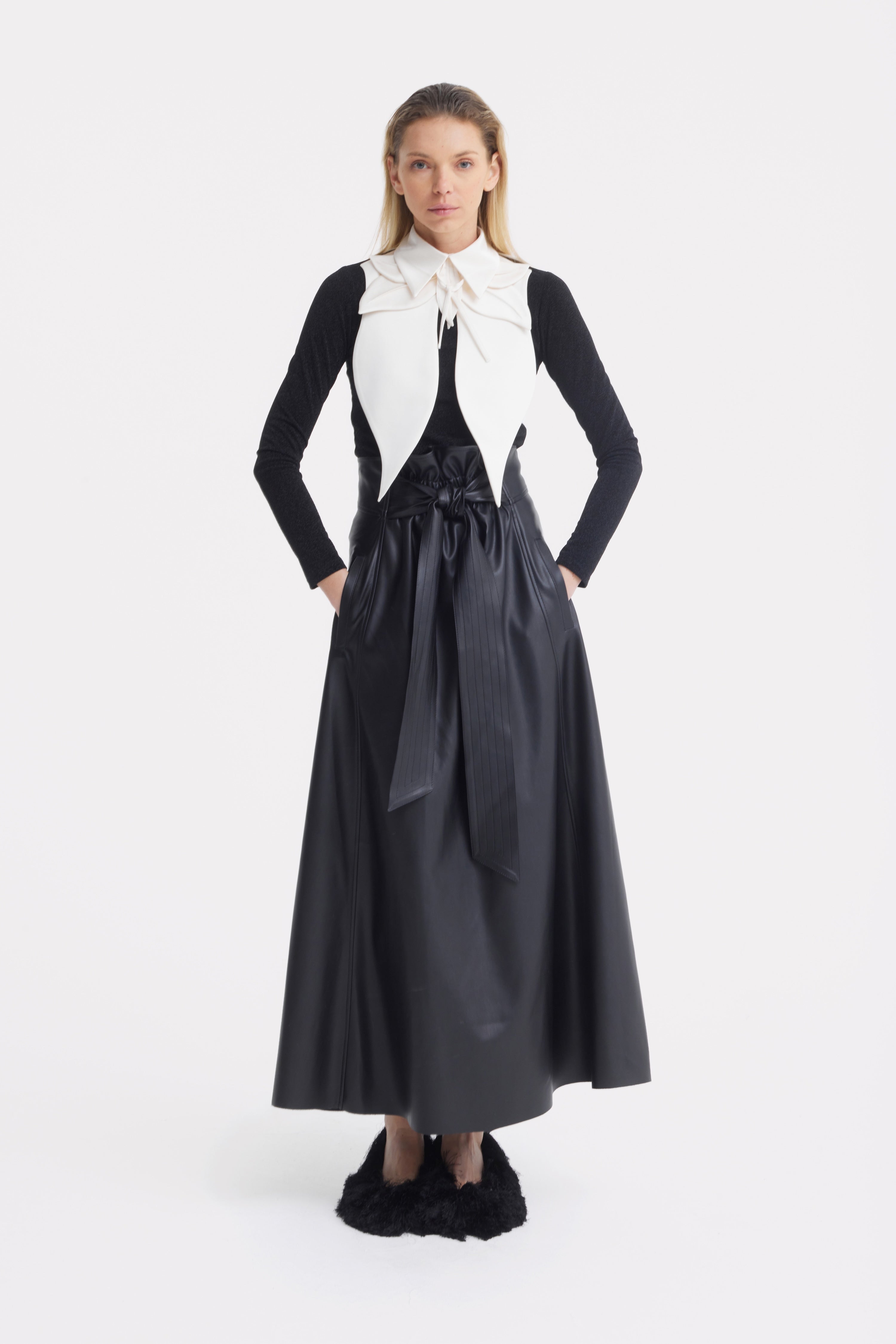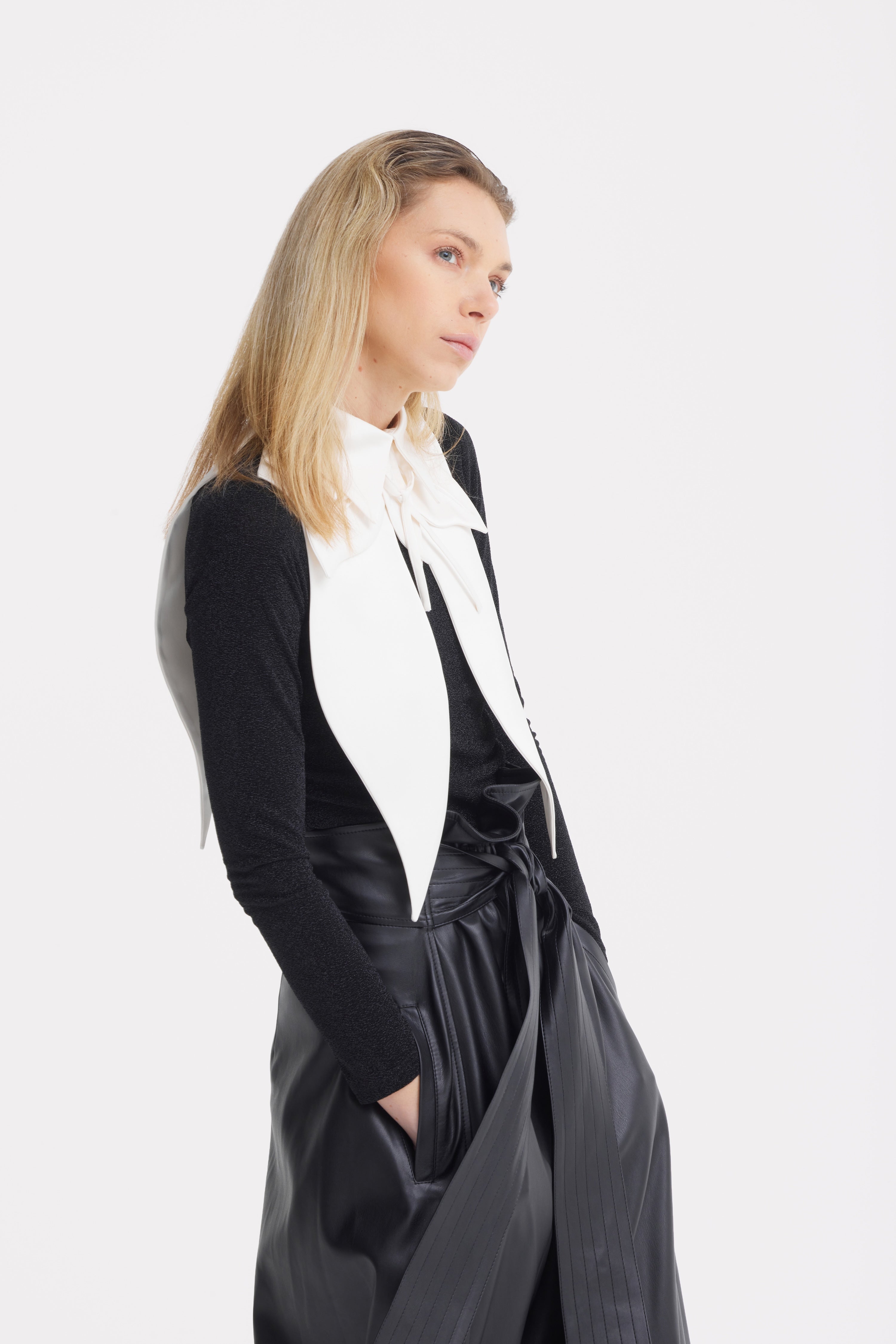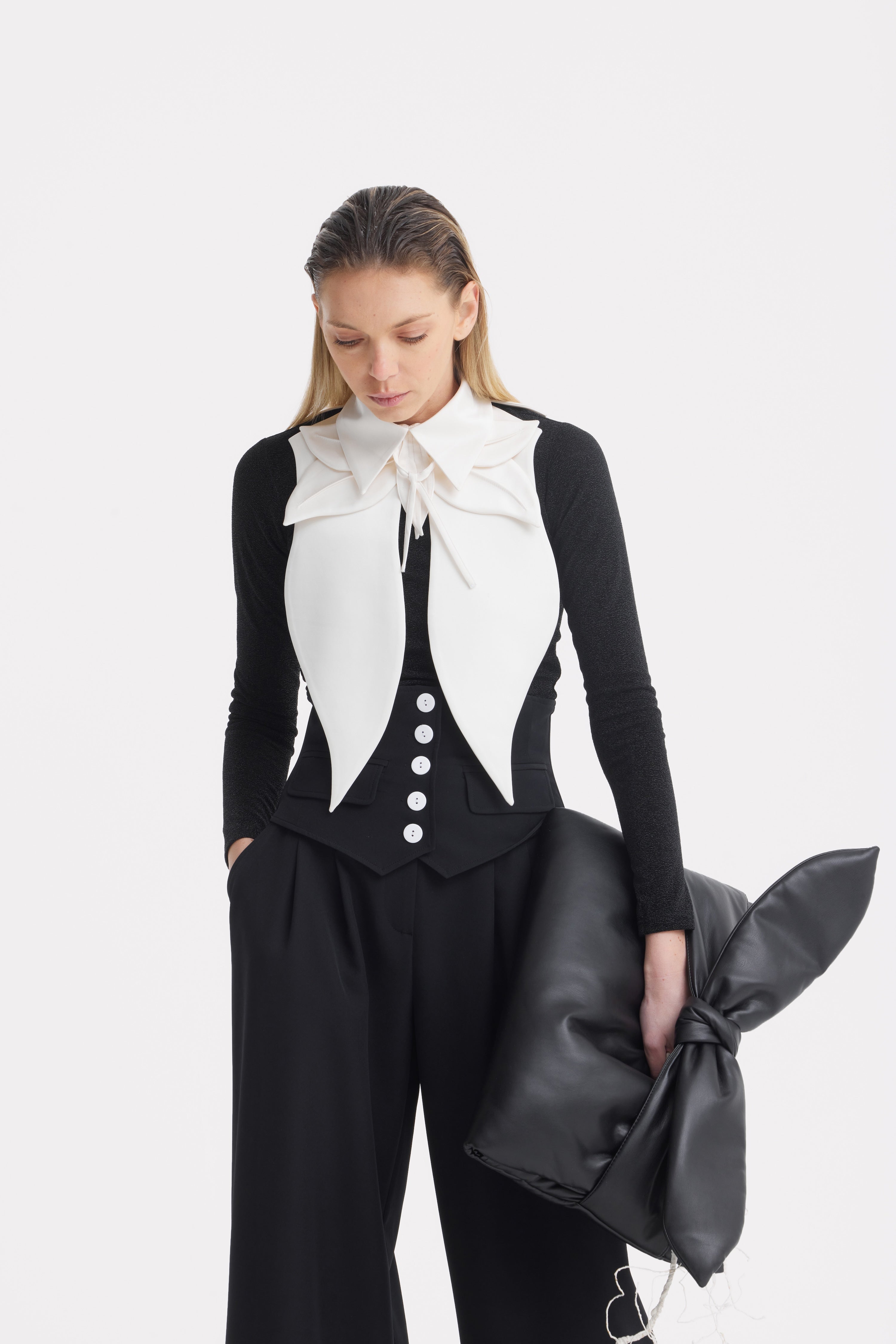 A statement accessory designed to redefine classic tailoring through sculptural form. Crafted from smooth satin, this oversized bib collar features layered, petal-like panels that cascade softly over the shoulders, creating an architectural yet fluid silhouette. The pointed collar and adjustable tie closure add structure and versatility, allowing the piece to frame the neckline with precision.