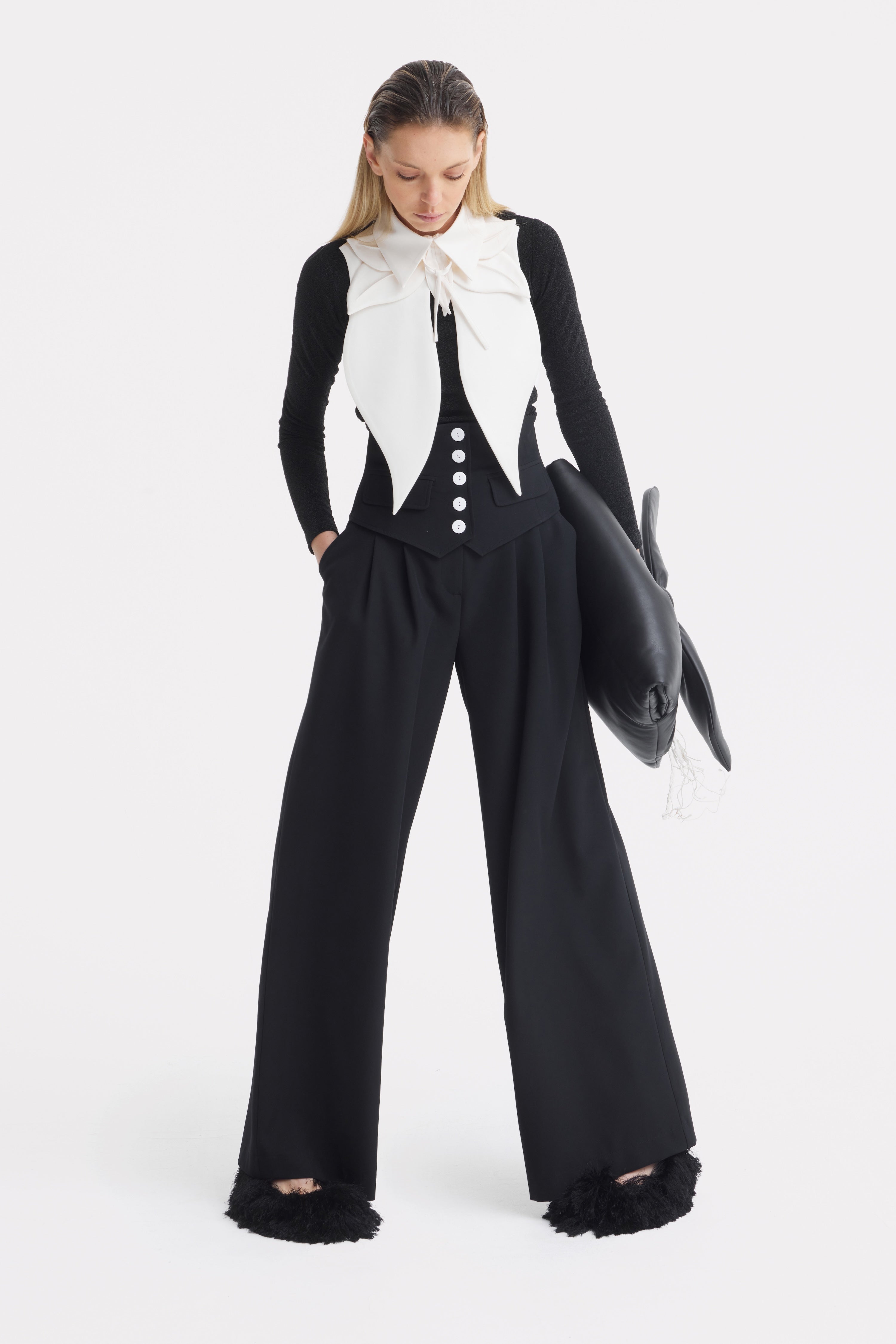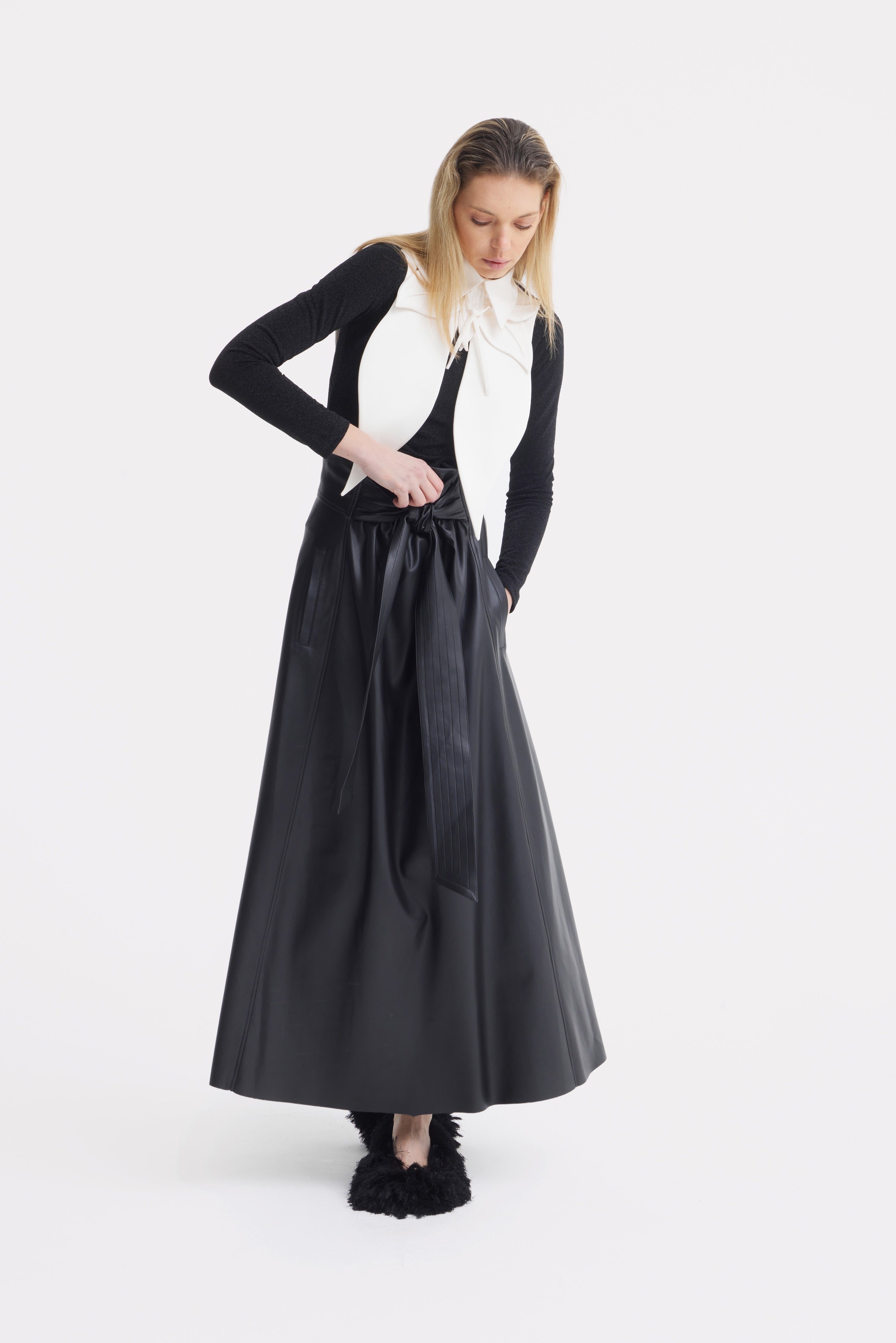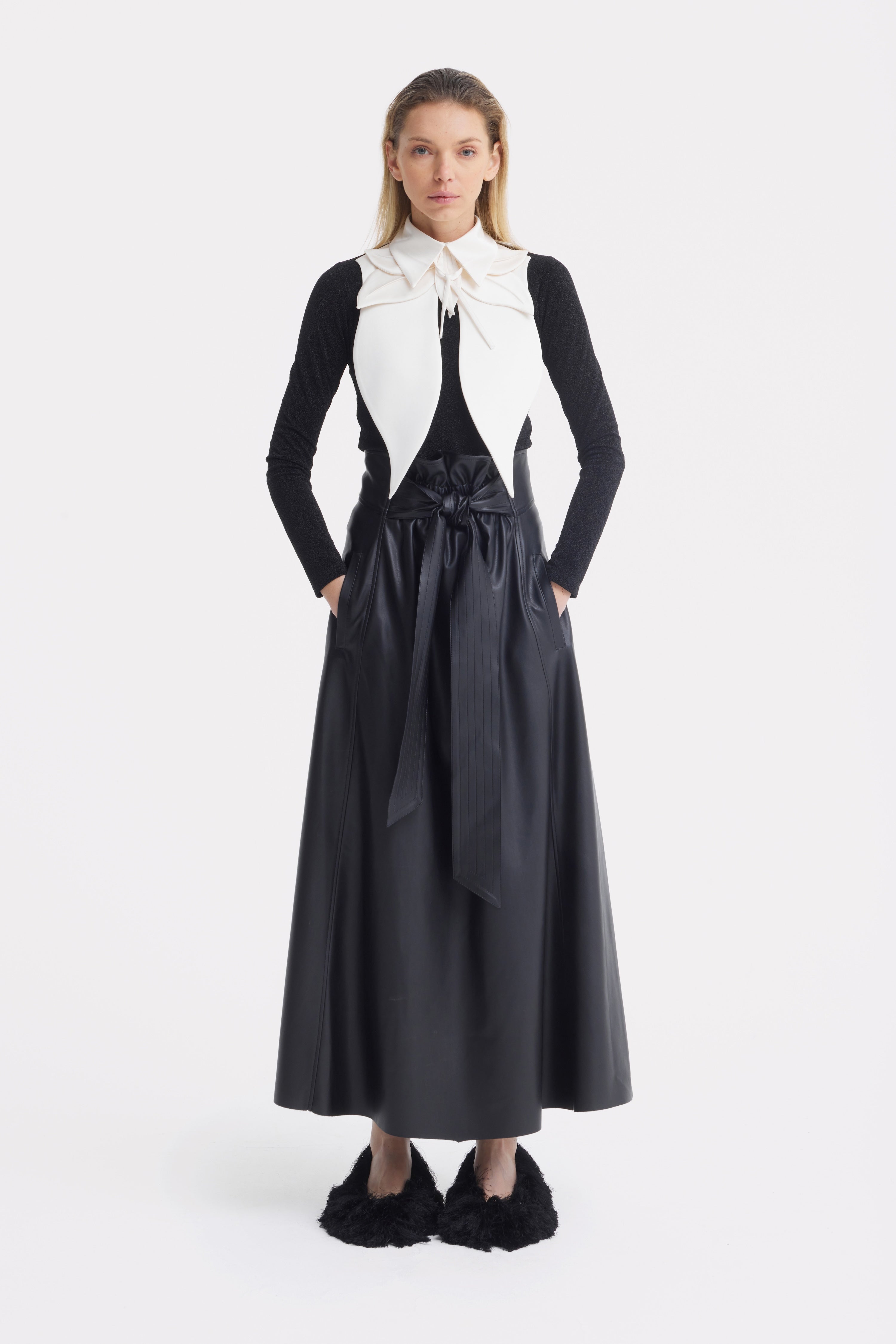 A statement accessory designed to redefine classic tailoring through sculptural form. Crafted from smooth satin, this oversized bib collar features layered, petal-like panels that cascade softly over the shoulders, creating an architectural yet fluid silhouette. The pointed collar and adjustable tie closure add structure and versatility, allowing the piece to frame the neckline with precision.