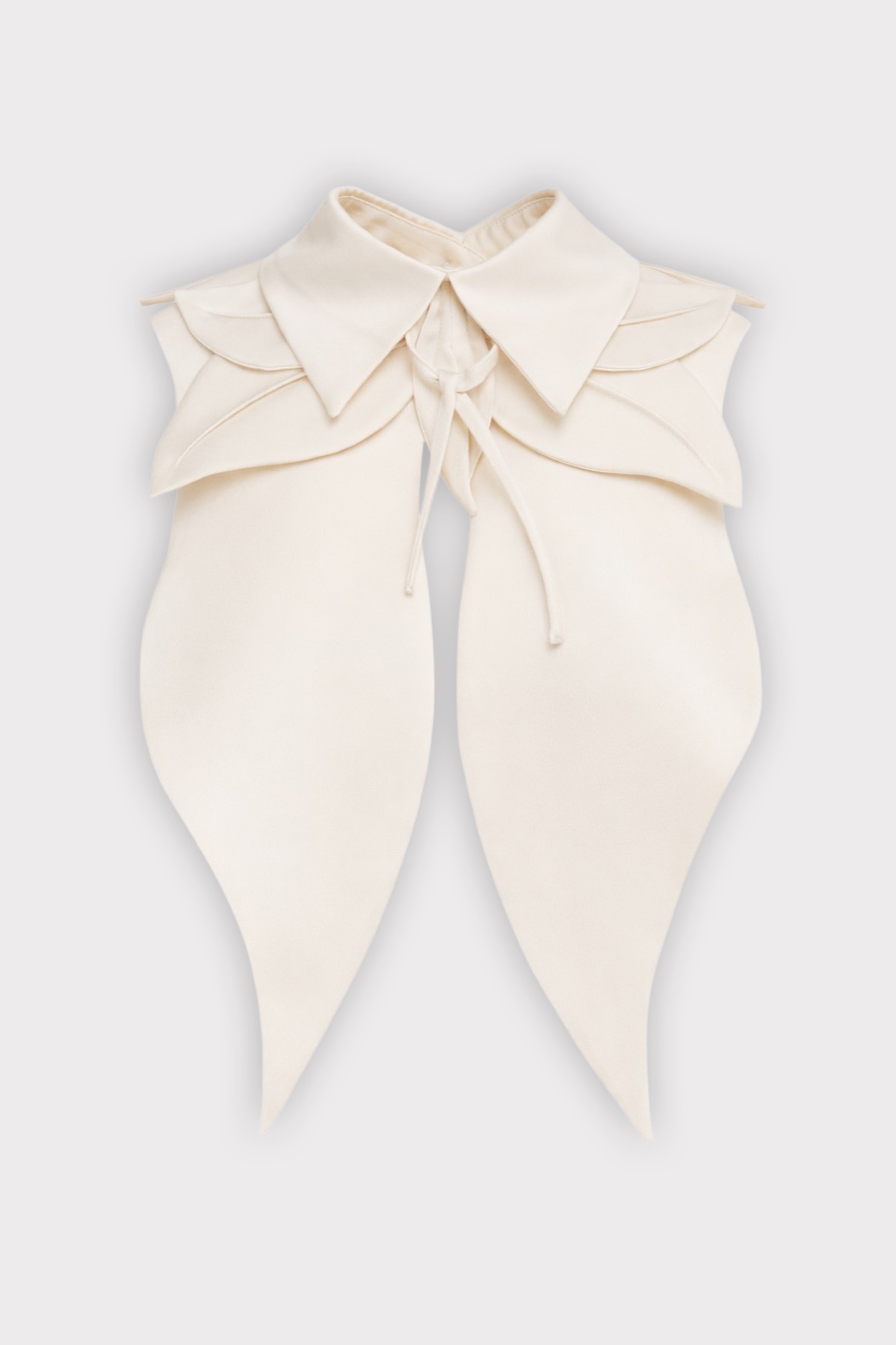 Decorative collar · Satin fabric · Oversized sculptural design · Layered panels · Adjustable tie closure · Ivory