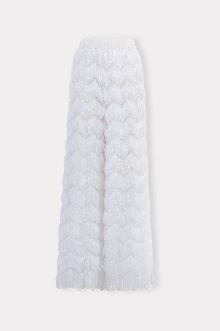 A modern interpretation of elegance in motion. These white palazzo pants are defined by cascading layers of textured fringe that move with sculptural fluidity. Designed with a wide-leg silhouette and soft internal lining, they offer both comfort and refined structure. The elastic waistband ensures effortless wear, while the bold texture makes each step a statement. Handcrafted in Europe, these pants merge ease with avant-garde design, perfect for evening occasions, curated wardrobes, or standout street style.