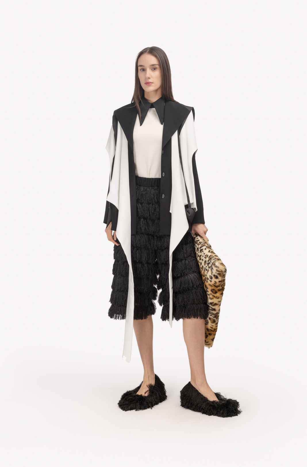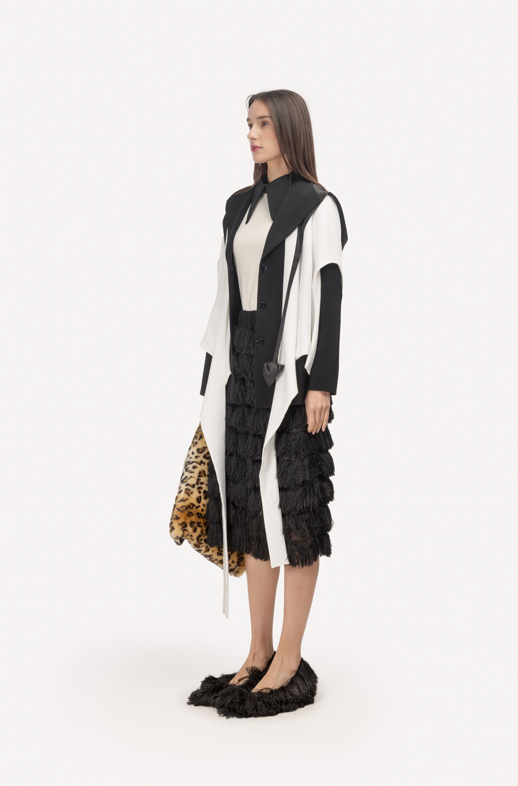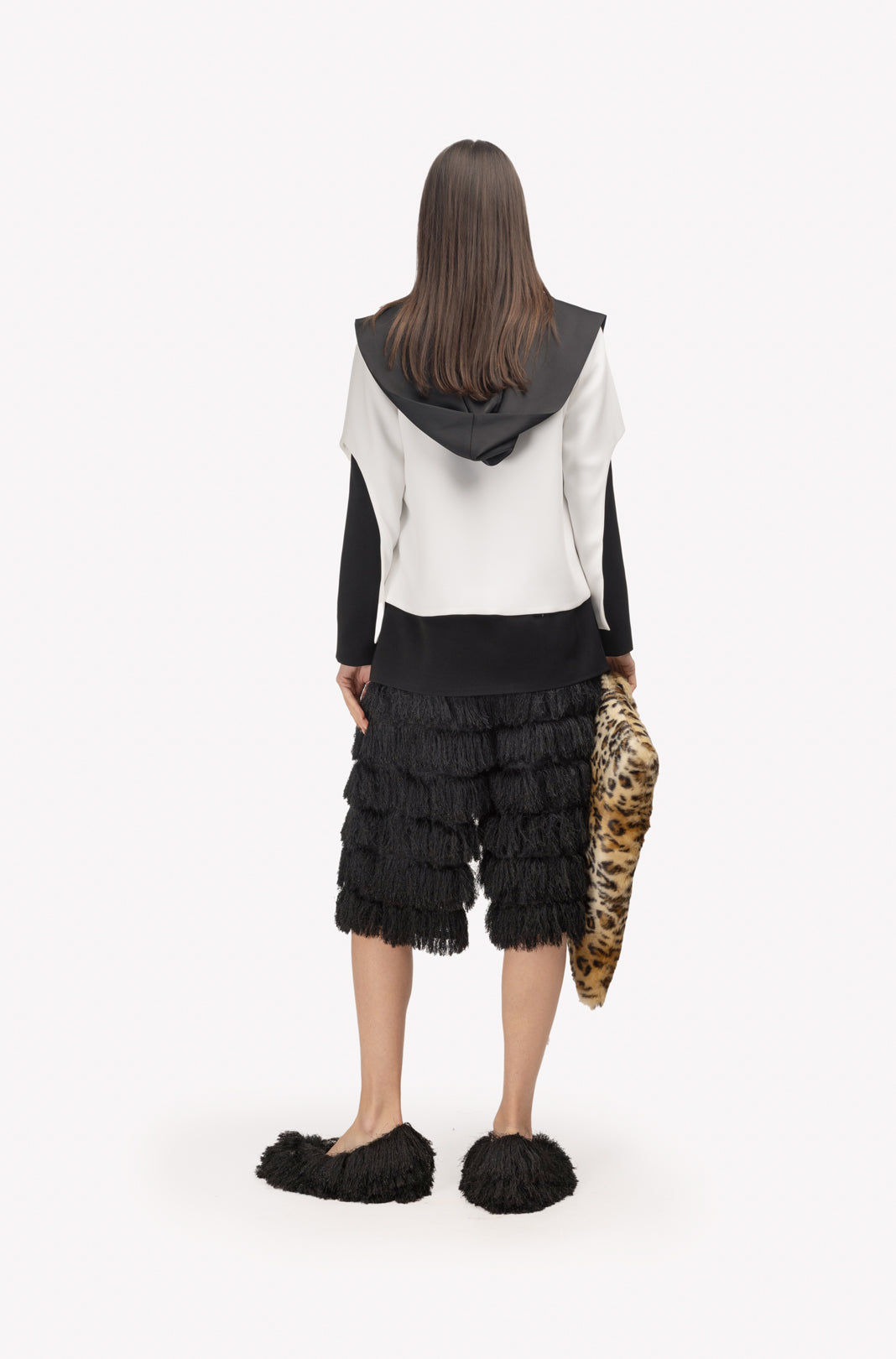 An architectural approach to evening dressing. These black Bermuda shorts reinterpret movement through texture, crafted from a structured base layered with sculptural fringe. Each row is meticulously hand-applied to create rhythmic dimension and fluid motion. The elastic waistband and soft lining provide comfort and stability, while the below-knee length adds a modern edge. A statement of controlled volume and refined craftsmanship, these shorts embody Julia Allert’s signature balance between structure and softness.
