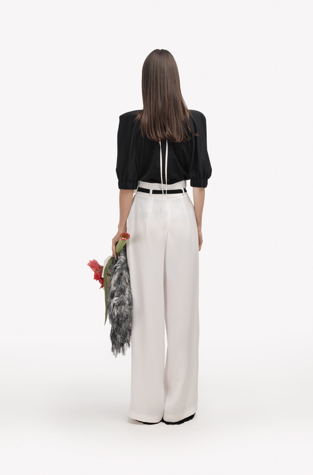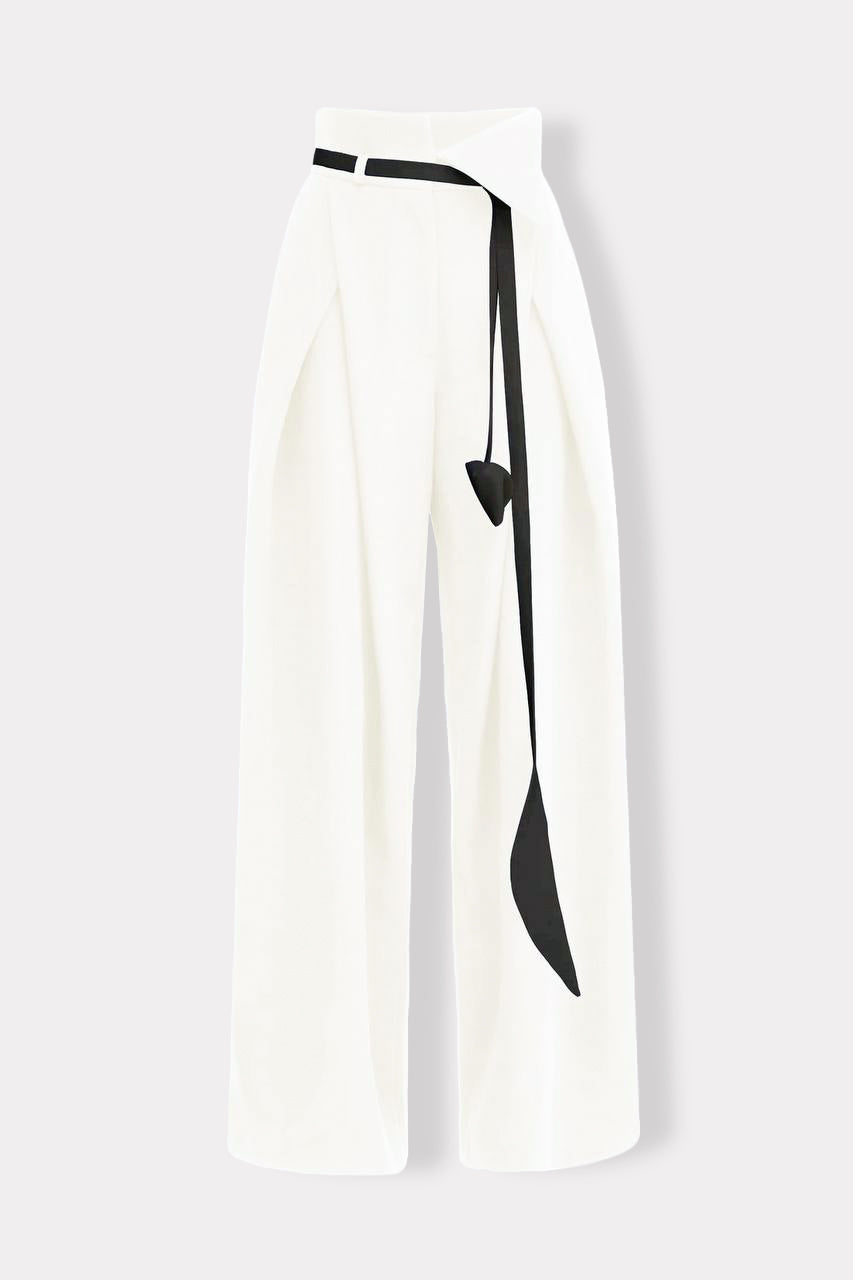 Sculptural yet fluid. These wide-leg ivory trousers feature architectural side folds and a crisp silhouette that elongates the form. Designed with an asymmetric waistband and a black contrast belt finished with a sculptural leaf tip, they offer a refined take on bold dressing. Cut from structured suiting fabric and ethically made in Europe, these trousers blend function, comfort, and artistic detail for statement looks with minimal effort.
