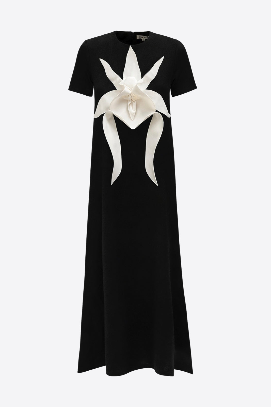 A striking blend of minimalism and sculptural expression. This ankle-length knit dress is crafted from smooth, structured knit fabric that falls cleanly along the body, creating a refined elongated silhouette. The design is elevated by a bold ivory floral appliqué at the front, adding depth, contrast, and a couture-inspired focal point.