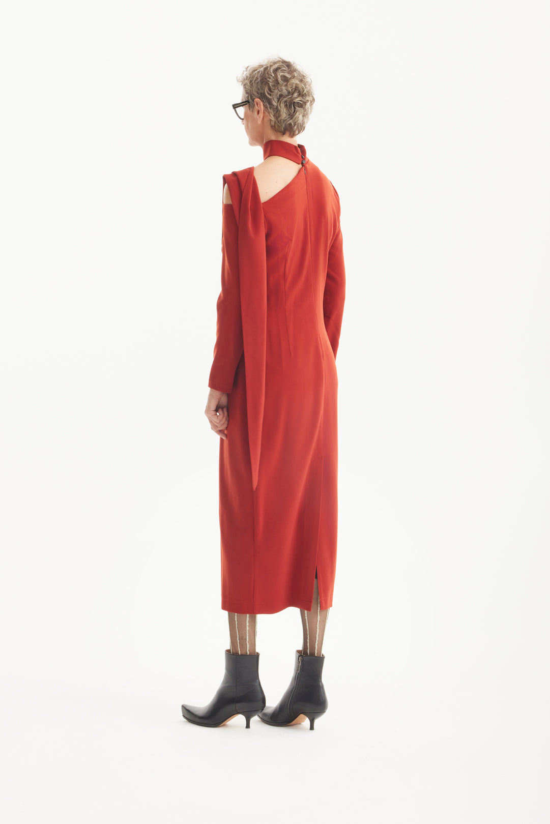 Step into understated elegance with this Elegant Evening Open Shoulder Midi Dress in Terracotta. Designed to captivate, this chic midi dress features a unique asymmetrical silhouette with a bold diagonal drape, leaving one shoulder beautifully exposed for a striking and modern look.