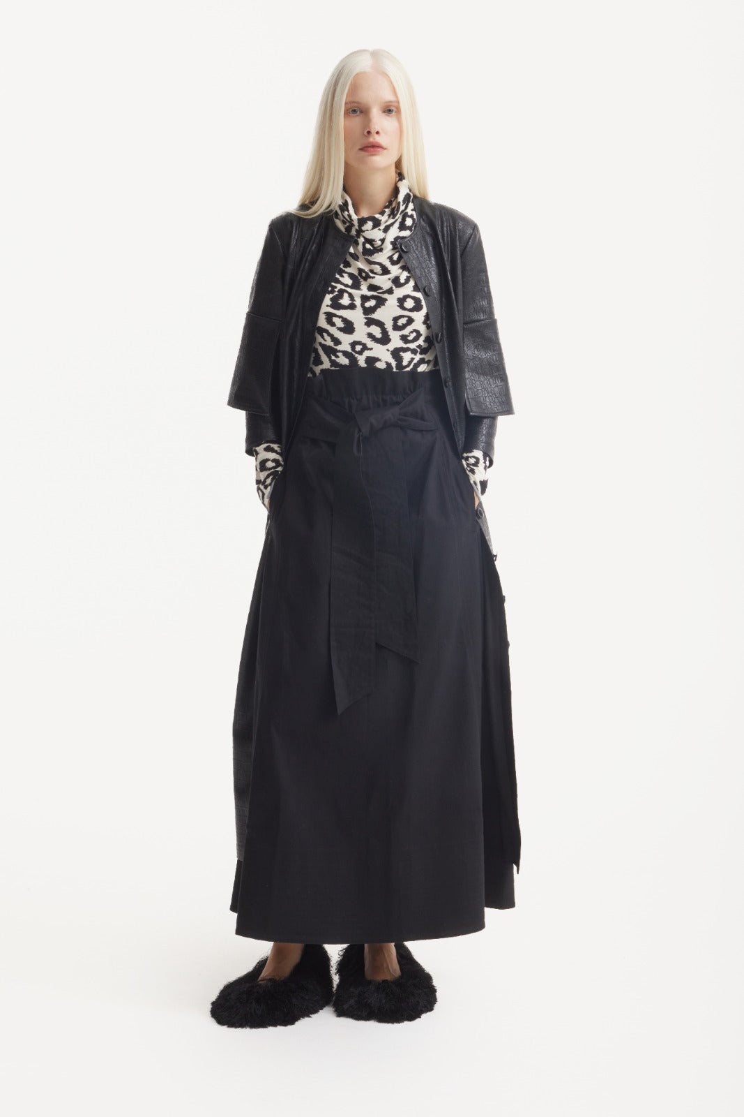 Command attention with this statement dress in embossed faux leather. Cut in a midi length with a sleek column silhouette, it features a full-length button front and sharp structured shoulders that bring a bold architectural edge. The croc texture adds a layer of tactile intrigue, playing with light and shadow across its surface. Fitted through the waist and hips, it balances power and elegance with precision. Whether worn as a standalone piece or layered under outerwear, this dress delivers a confident, fashion-forward presence — ideal for eveningwear, gallery events, or refined urban styling.