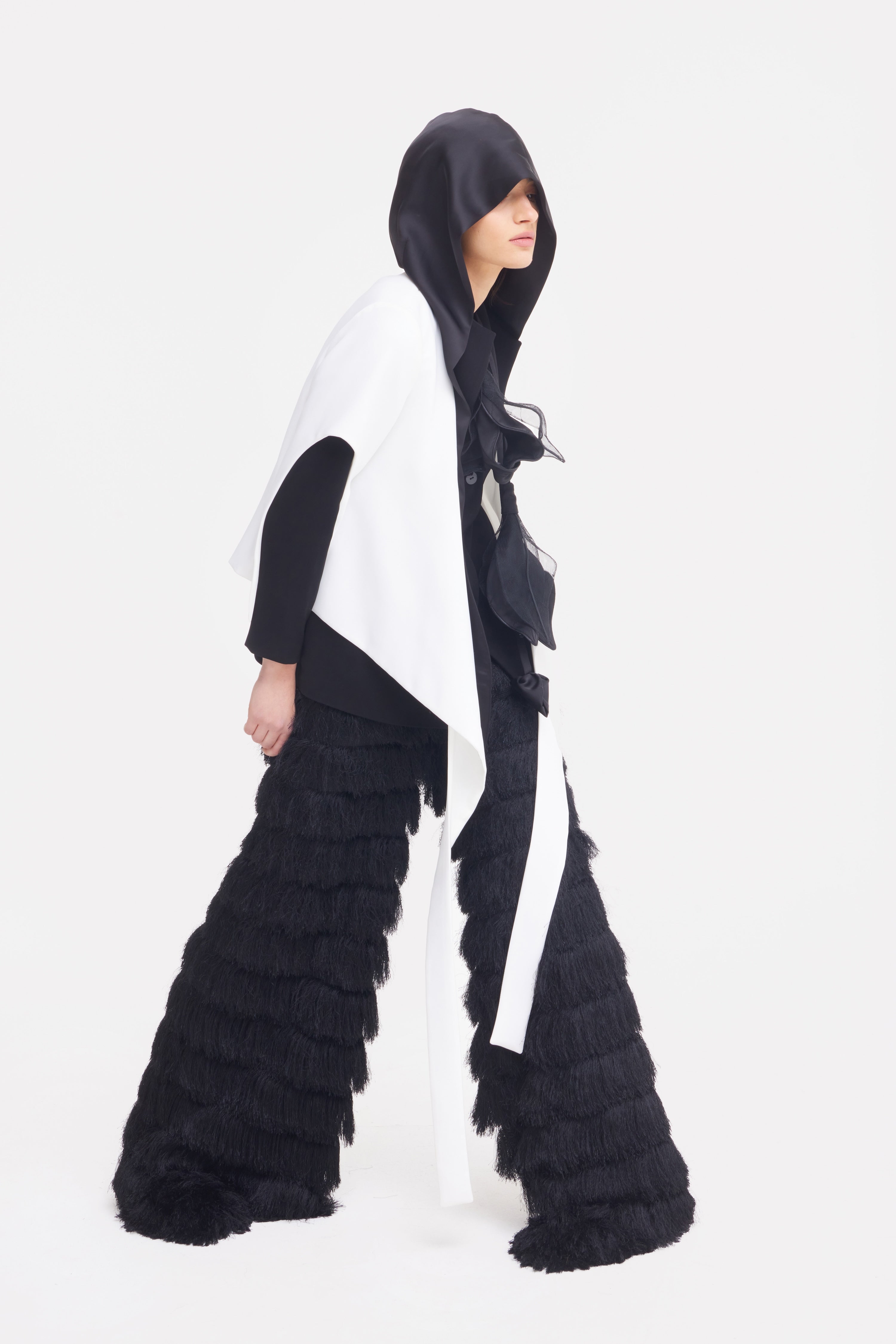 A statement of structure and duality. This black-and-white layered blazer redefines tailoring with its asymmetric draped panels and elongated lapels. The deconstructed silhouette blends sharp geometry with soft fluidity, creating a bold architectural look. Crafted from premium suiting fabric with a smooth inner finish, it offers both comfort and visual impact. Ethically made in Europe, this piece brings together artful design and refined craftsmanship — ideal for modern power dressing or evening sophistication.
