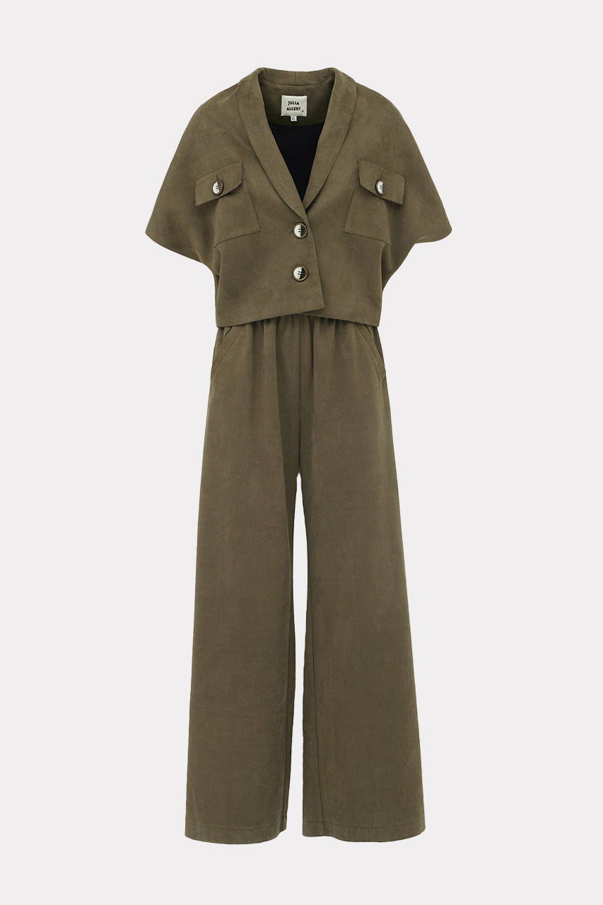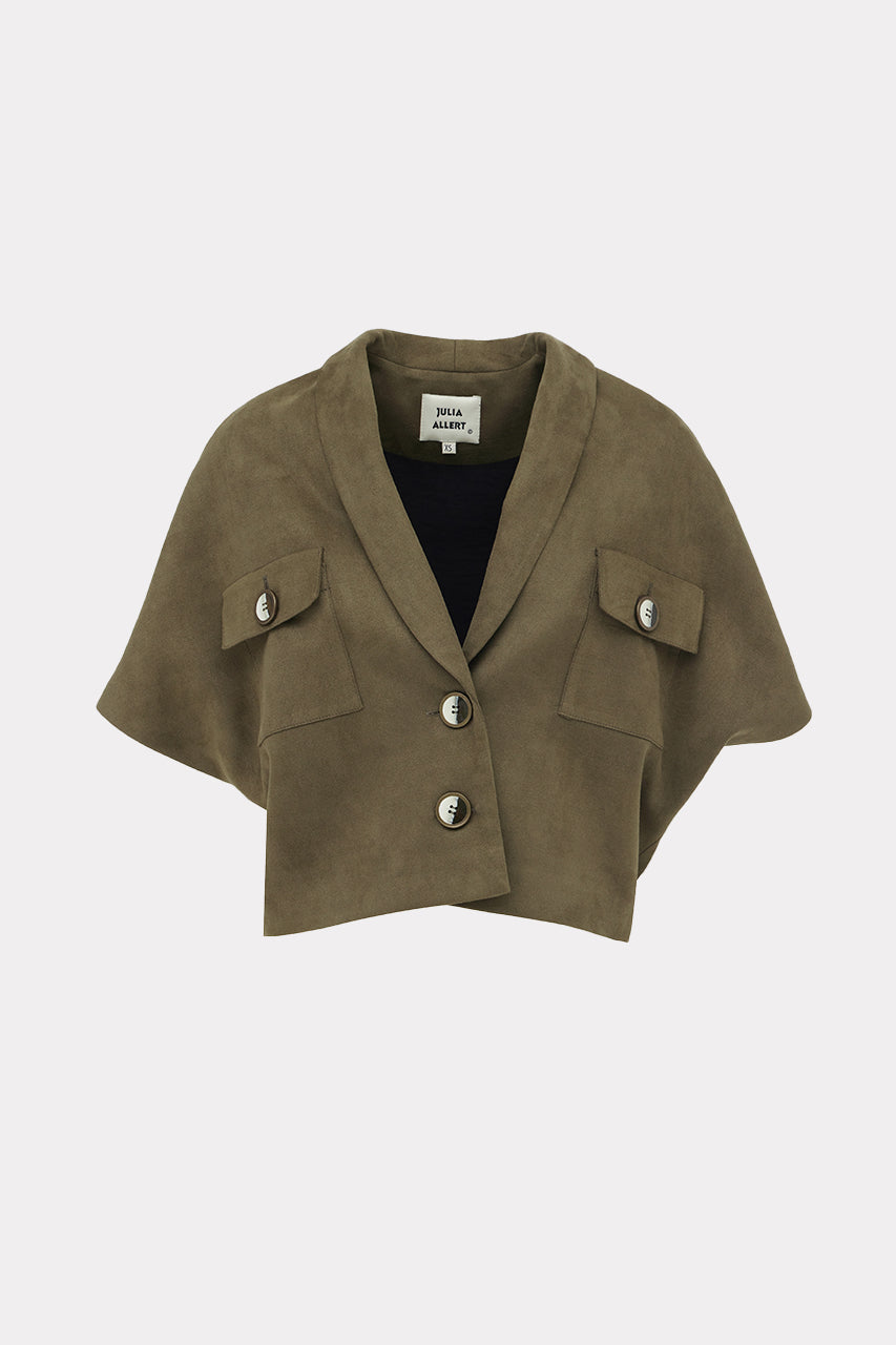 A sculptural cropped blazer crafted from soft suede in a refined olive-khaki tone. A modern essential with architectural clarity. The clean shawl collar frames the neckline with subtle elegance, while the short sleeves and tailored cut create a structured, feminine silhouette. Delicate chest pocket details elevate the design, balancing minimalism with sophistication.