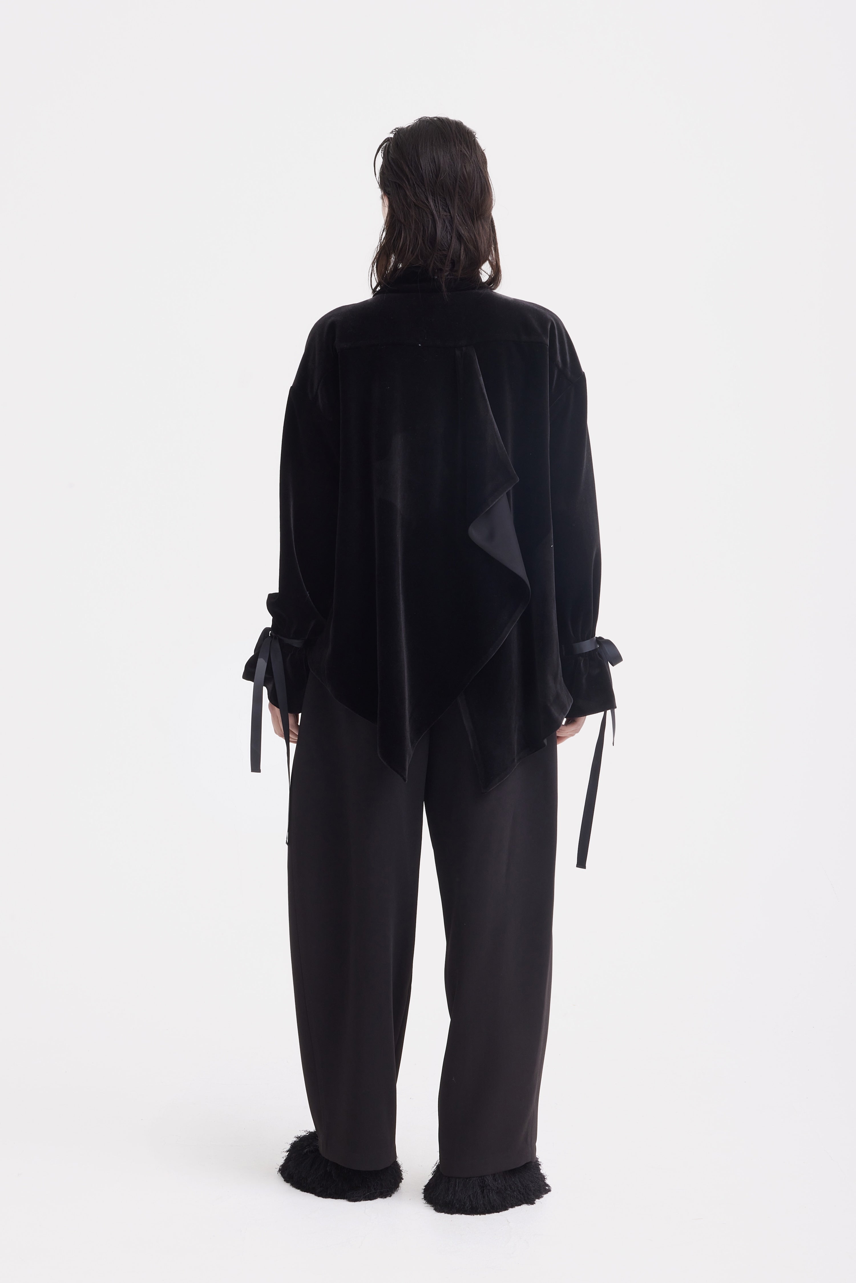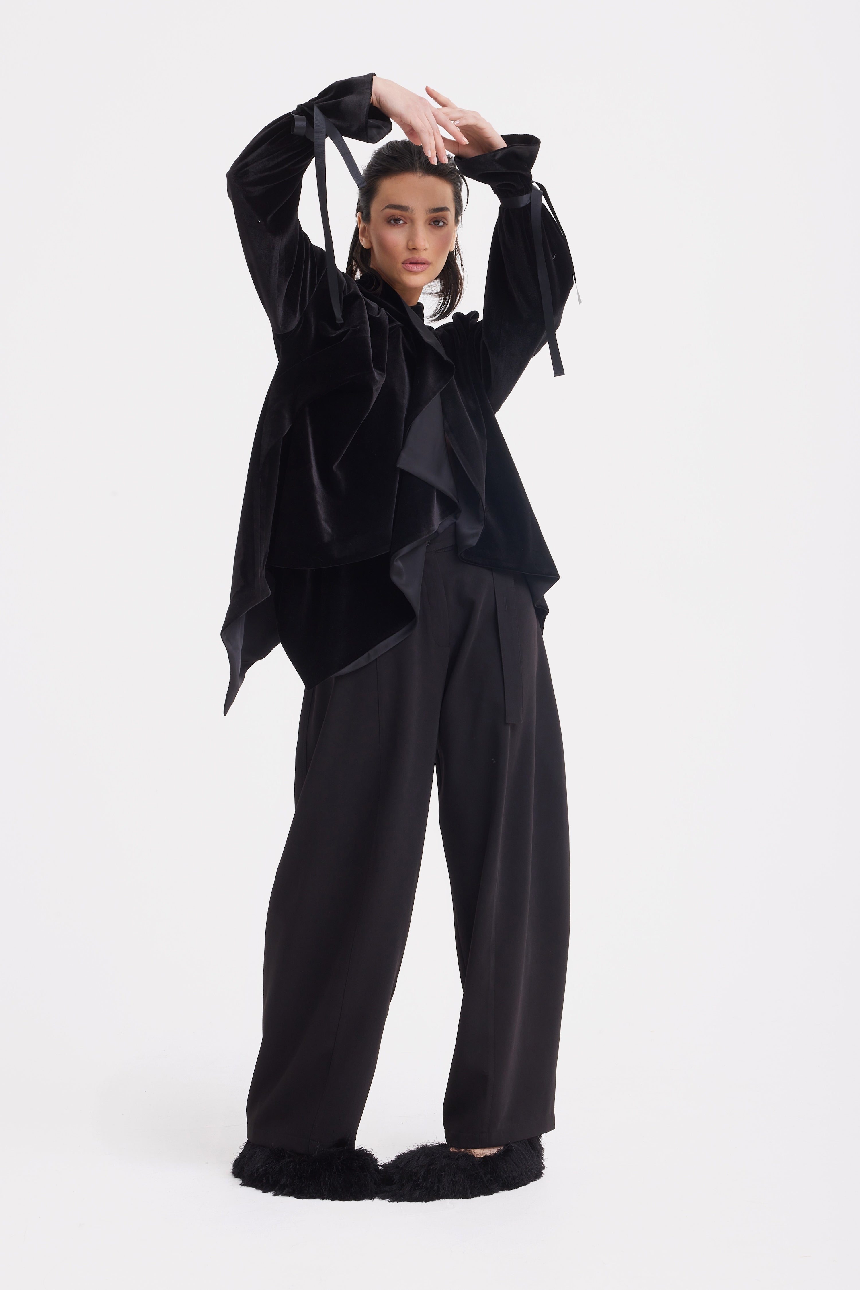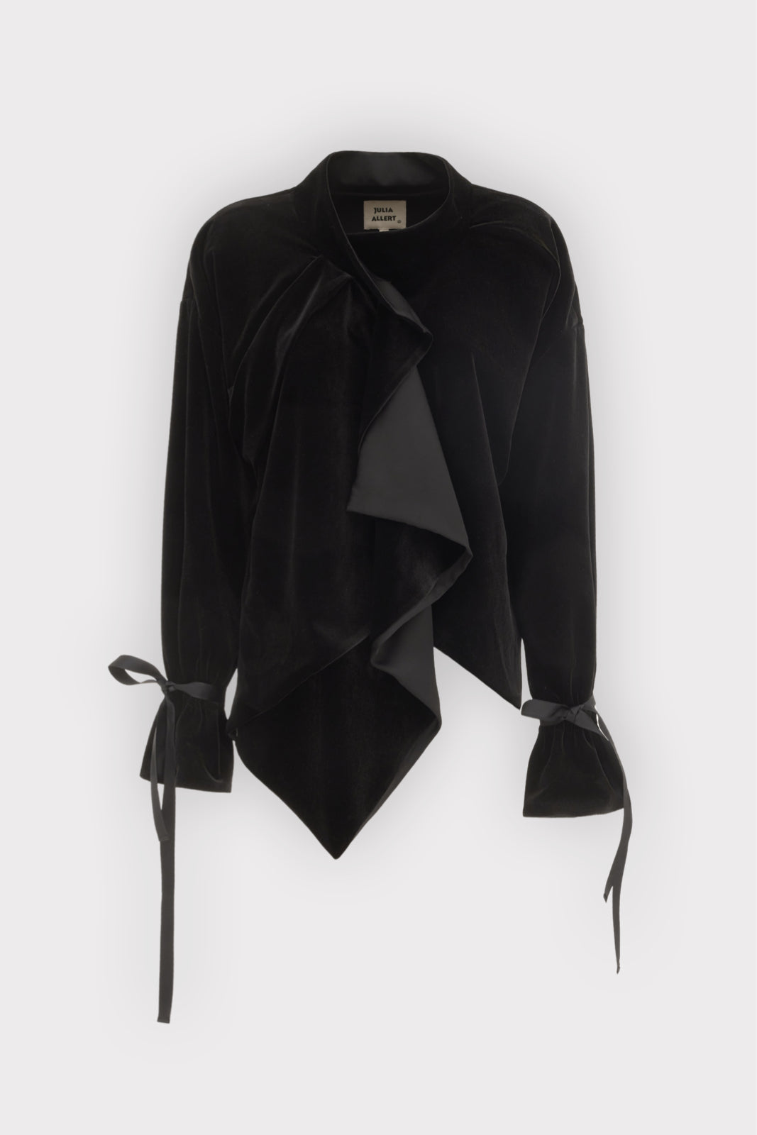 A fluid interpretation of evening tailoring. This wrap jacket is crafted from deep black velvet that captures light with a soft, luxurious sheen. The asymmetrical front drape creates a sculptural cascade, forming a pointed hem that adds movement and architectural depth.
