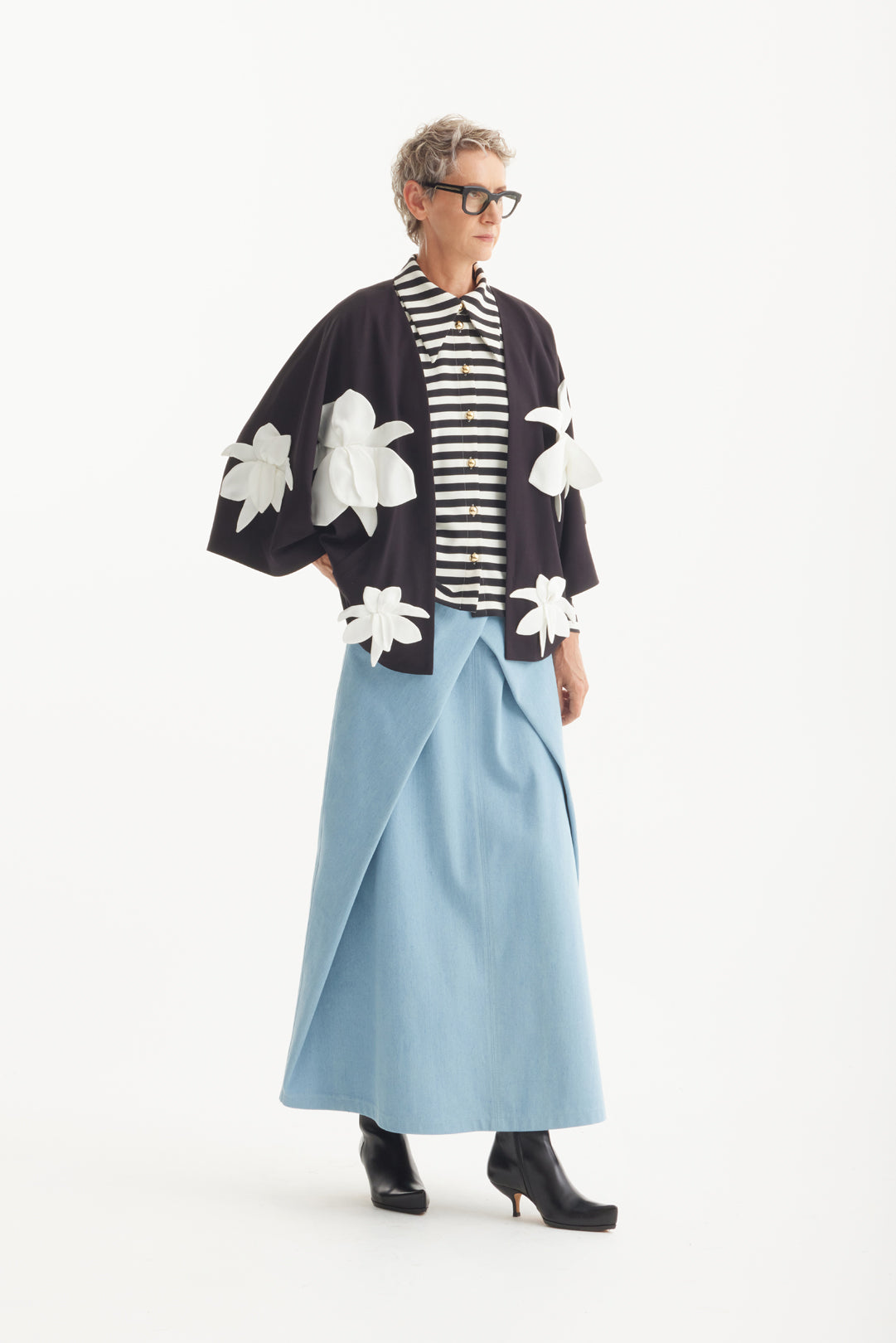 Discover our exquisite wrap-style jacket, designed to blend comfort and elegance effortlessly. This sophisticated piece features a relaxed, dropped sleeve silhouette, crafted from a premium blend of viscose for a luxurious feel. The interior is lined with sumptuous silk, offering a touch of opulence against the skin. The wrap design allows for a customizable fit, accentuating your waistline and providing a flattering shape. Adorning the jacket are unique, designer-crafted silk flowers, adding an artistic and fashionable flair that stands out. The floral embellishments not only enhance the aesthetic but also provide a distinct, statement-making look. Perfect for layering, this versatile jacket can elevate any outfit, making it ideal for both casual and formal occasions.