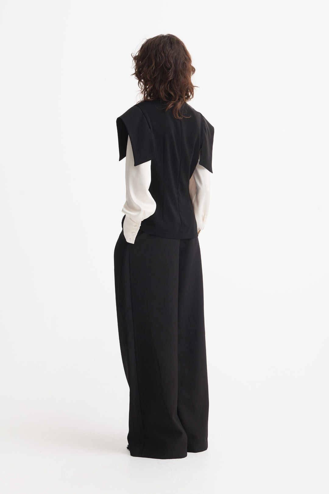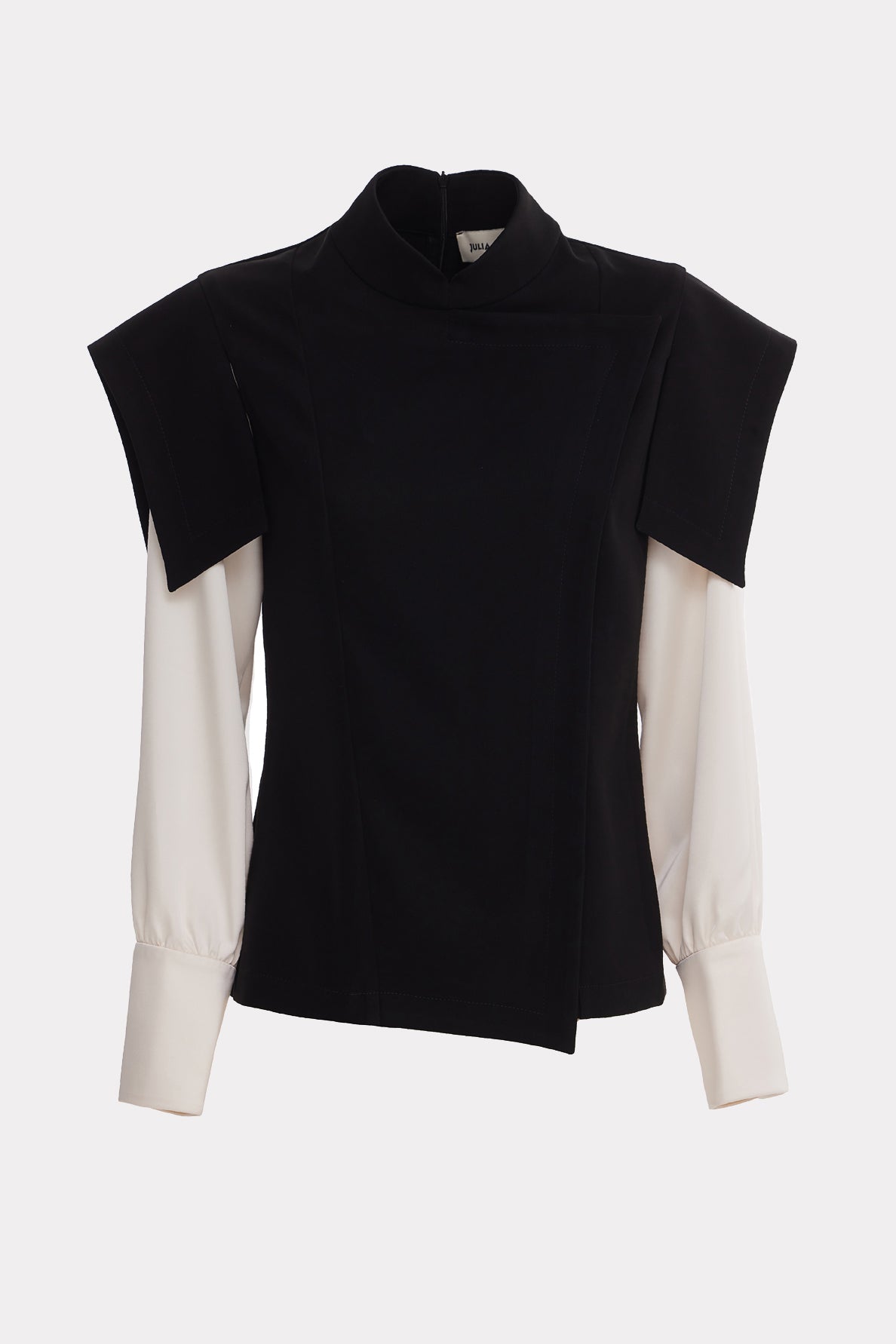 Beneath the structured top sits an attached ivory under-blouse with long sleeves and elongated button cuffs, adding softness, fluidity, and a refined two-in-one effect. The minimal stand collar and clean asymmetric front lines emphasize geometry, while the concealed back zipper keeps the finish sleek and uninterrupted.