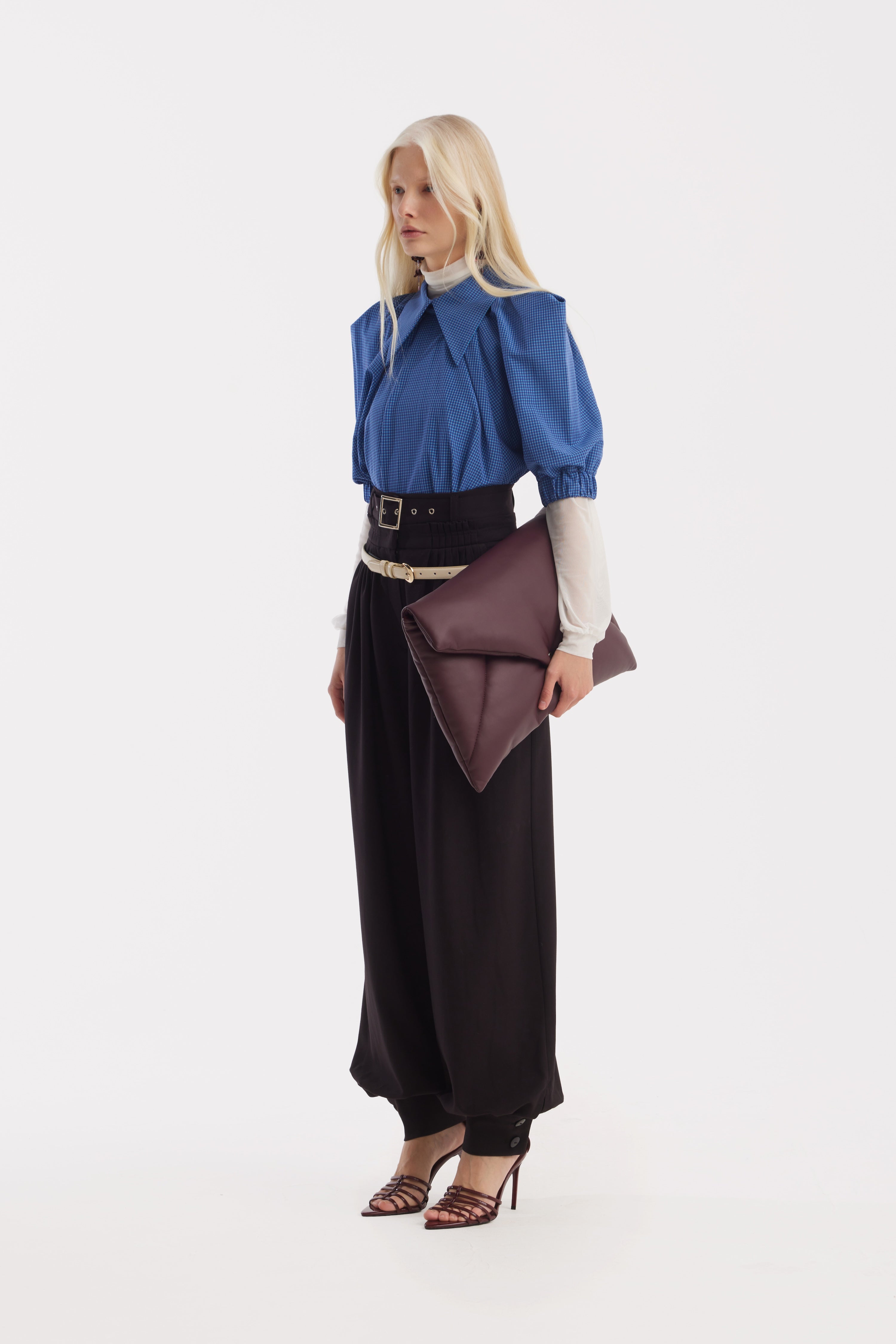 This blue plaid blouse reinterprets a timeless check through a distinctly structured silhouette. The fine grid pattern adds subtle texture, while the tailored body keeps the line clean and composed.
