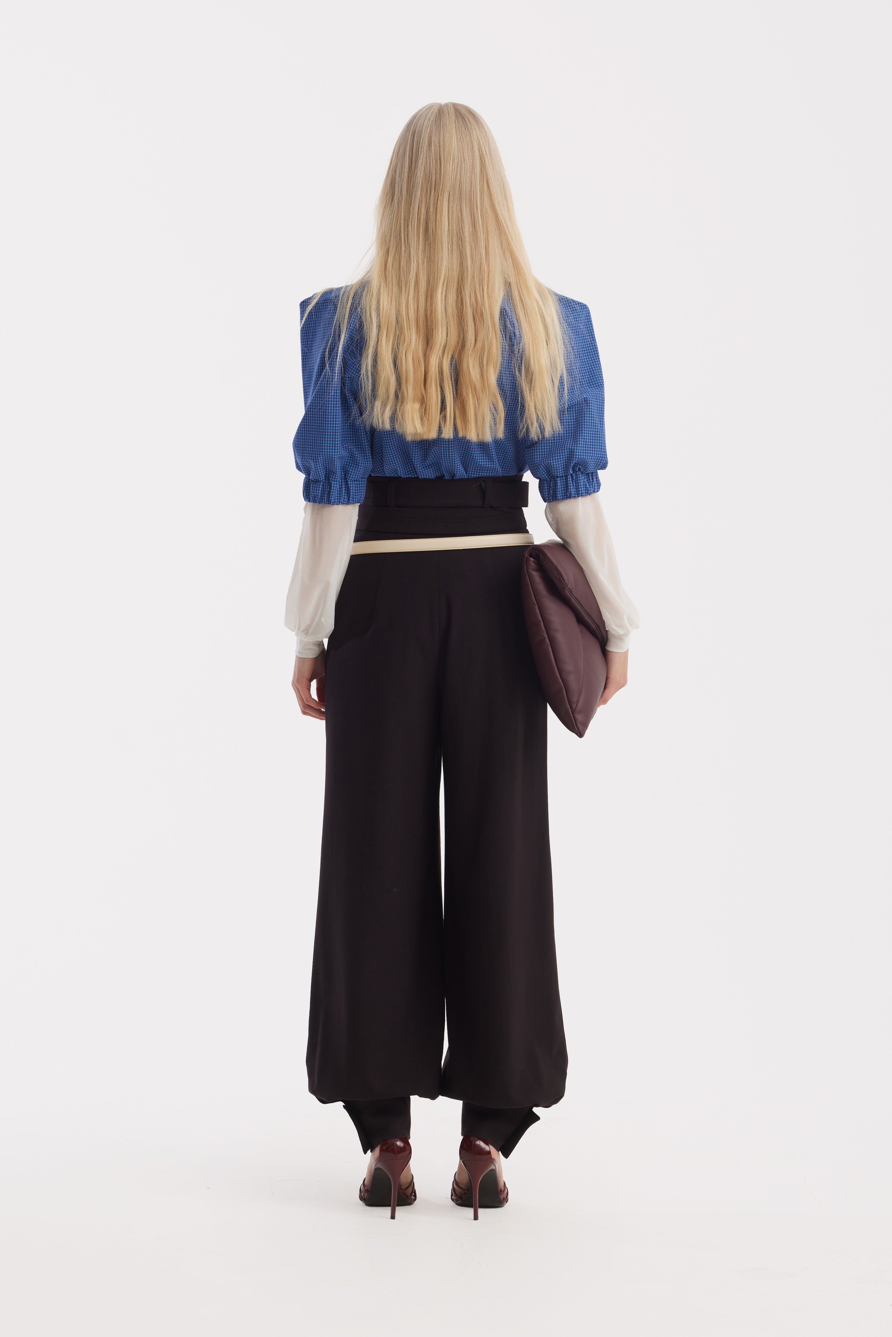 Voluminous puff sleeves introduce architectural drama, gathered with precision to create depth without losing balance. The sharp collar anchors the design, adding a refined, almost tailored contrast to the softness of the sleeves.