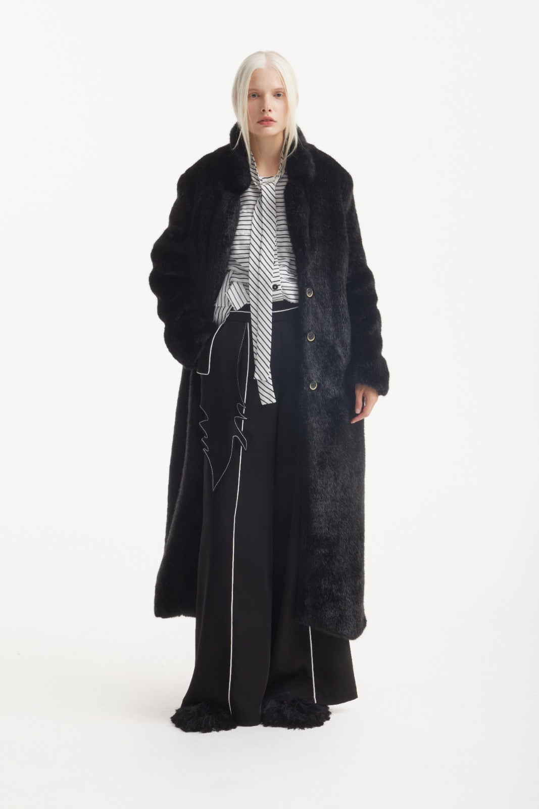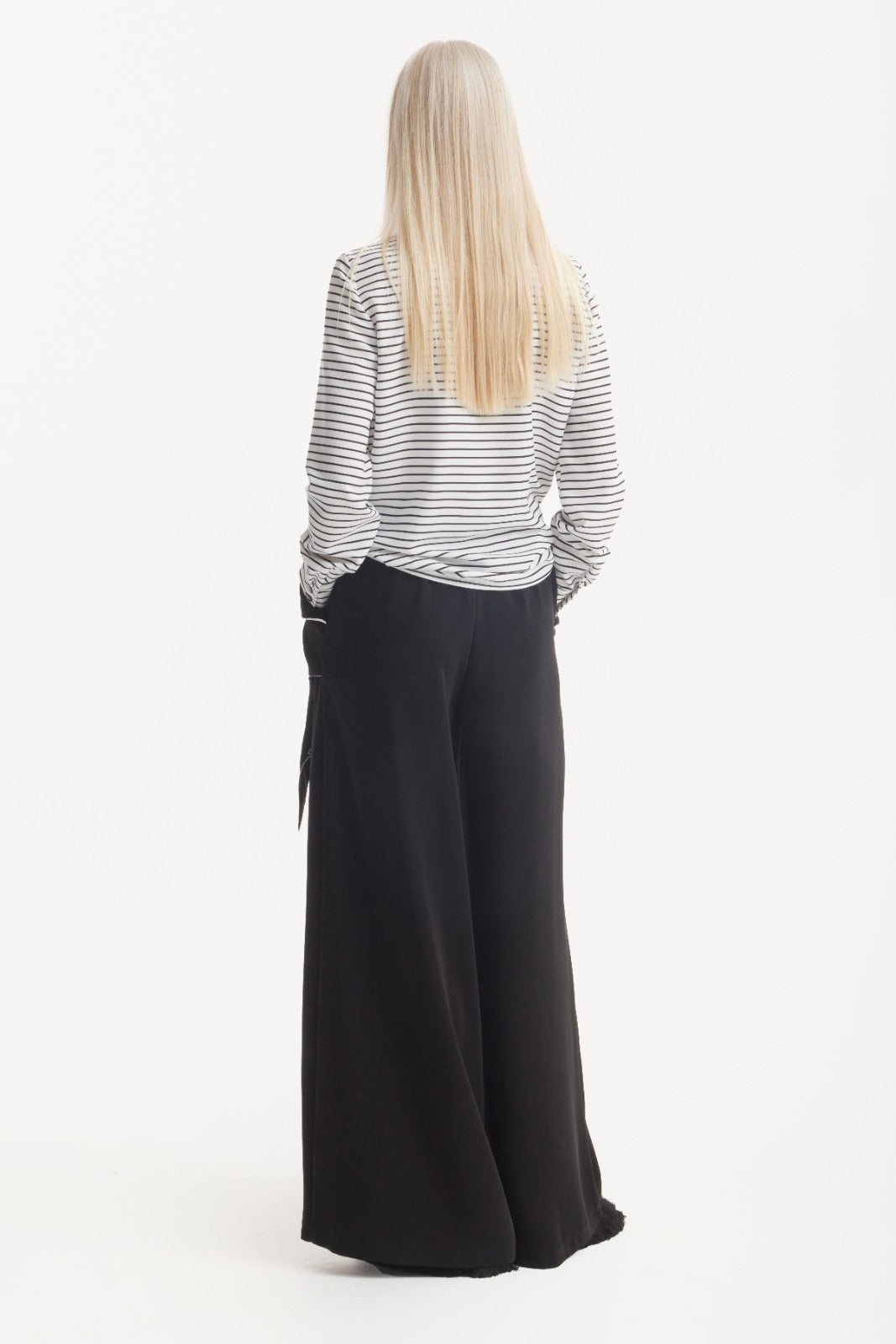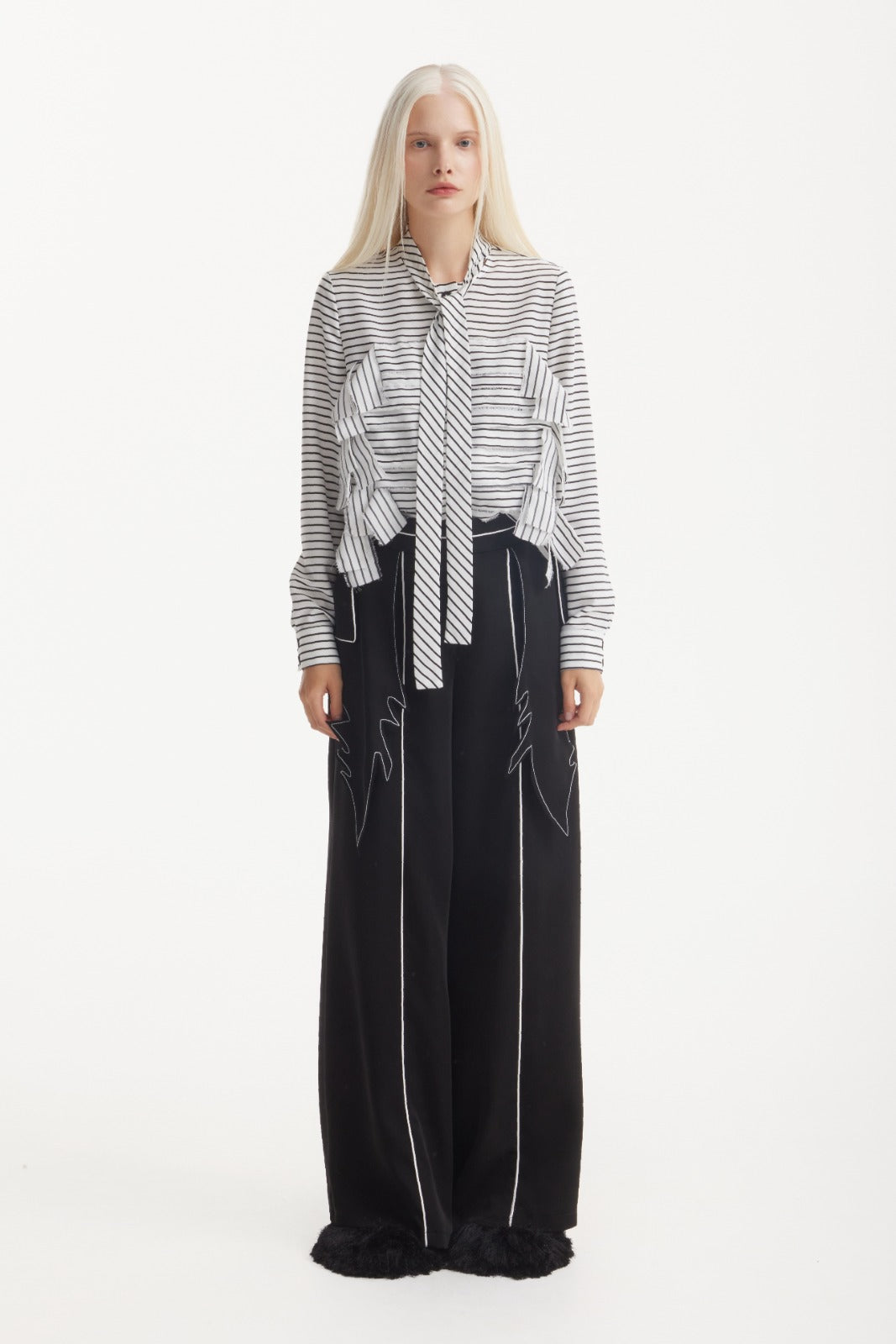 This Black & White Striped Viscose Shirt by Julia Allert redefines everyday elegance with its airy texture and statement detailing. Crafted from ultra-light, breathable viscose, the blouse features classic horizontal stripes paired with cascading front ruffles and a chic tie-neck detail for added dimension.