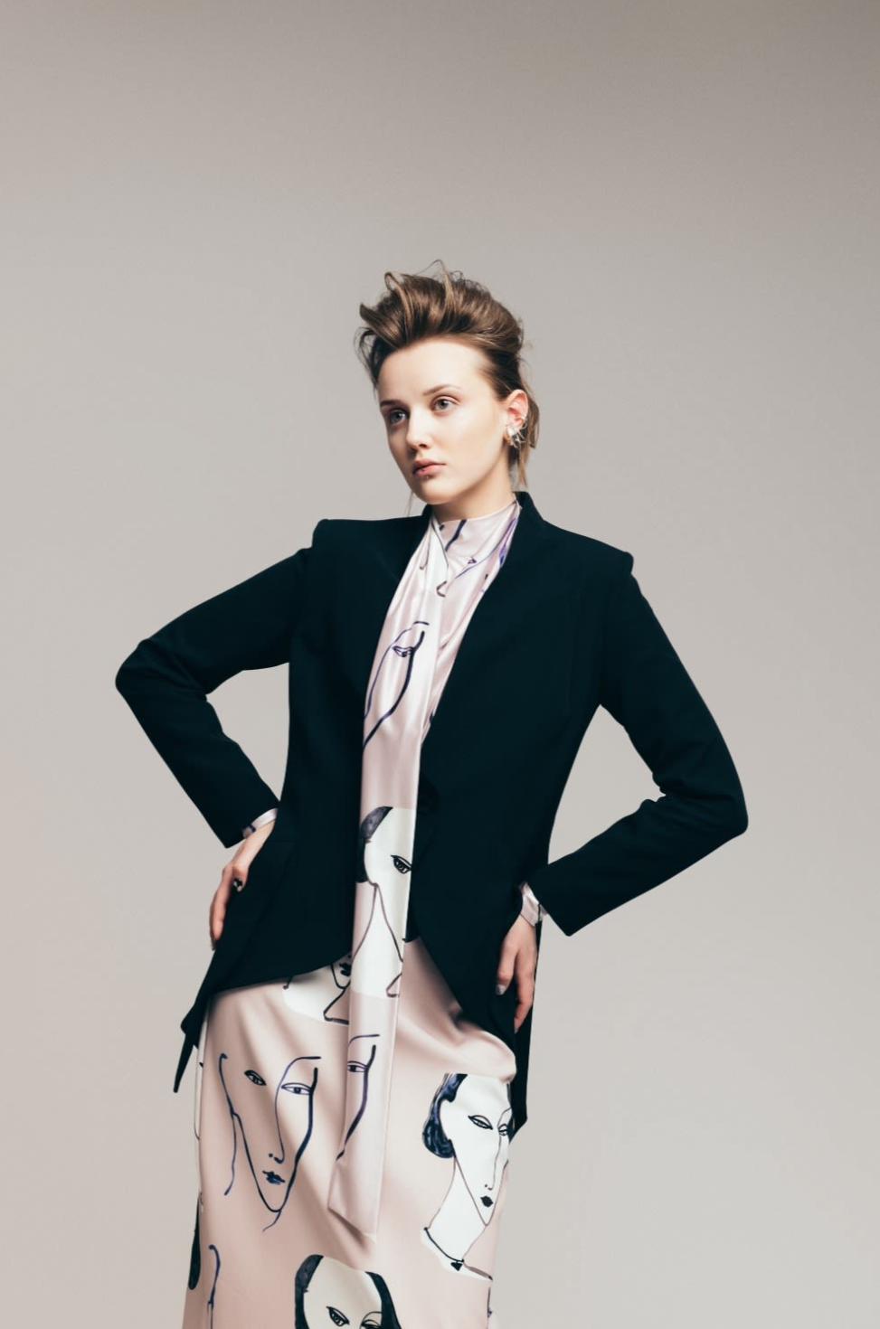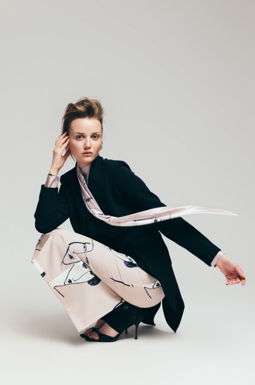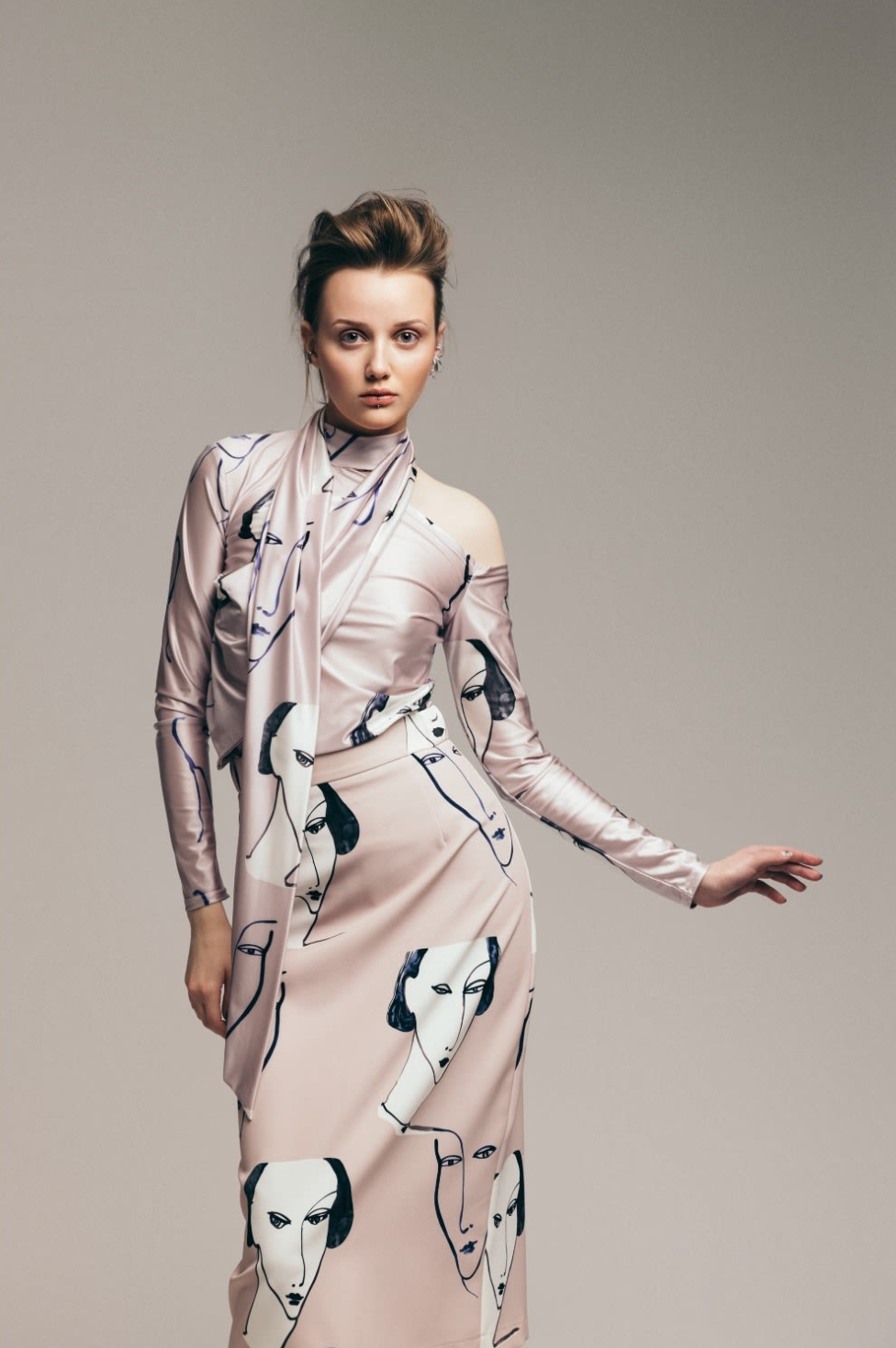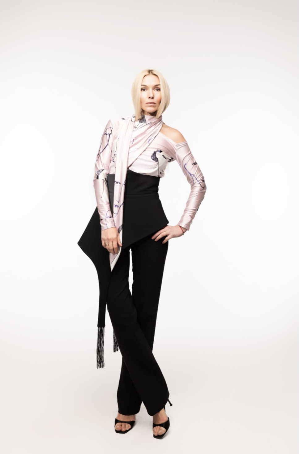 Art meets wearability in this pale pink long-sleeve blouse featuring Julia Allert’s signature face-art print. Crafted from ultra-stretchy biflex fabric, it offers exceptional comfort and flexibility while maintaining its shape. The softly draped collar fastens with two buttons, forming an elegant scarf-like neckline, while the asymmetric exposed shoulder adds a confident, avant-garde touch. Designed for expressive, modern wardrobes — pair it with tailored trousers, midi skirts, or denim for effortless statement dressing. A creative essential that merges comfort, structure, and artistic identity.