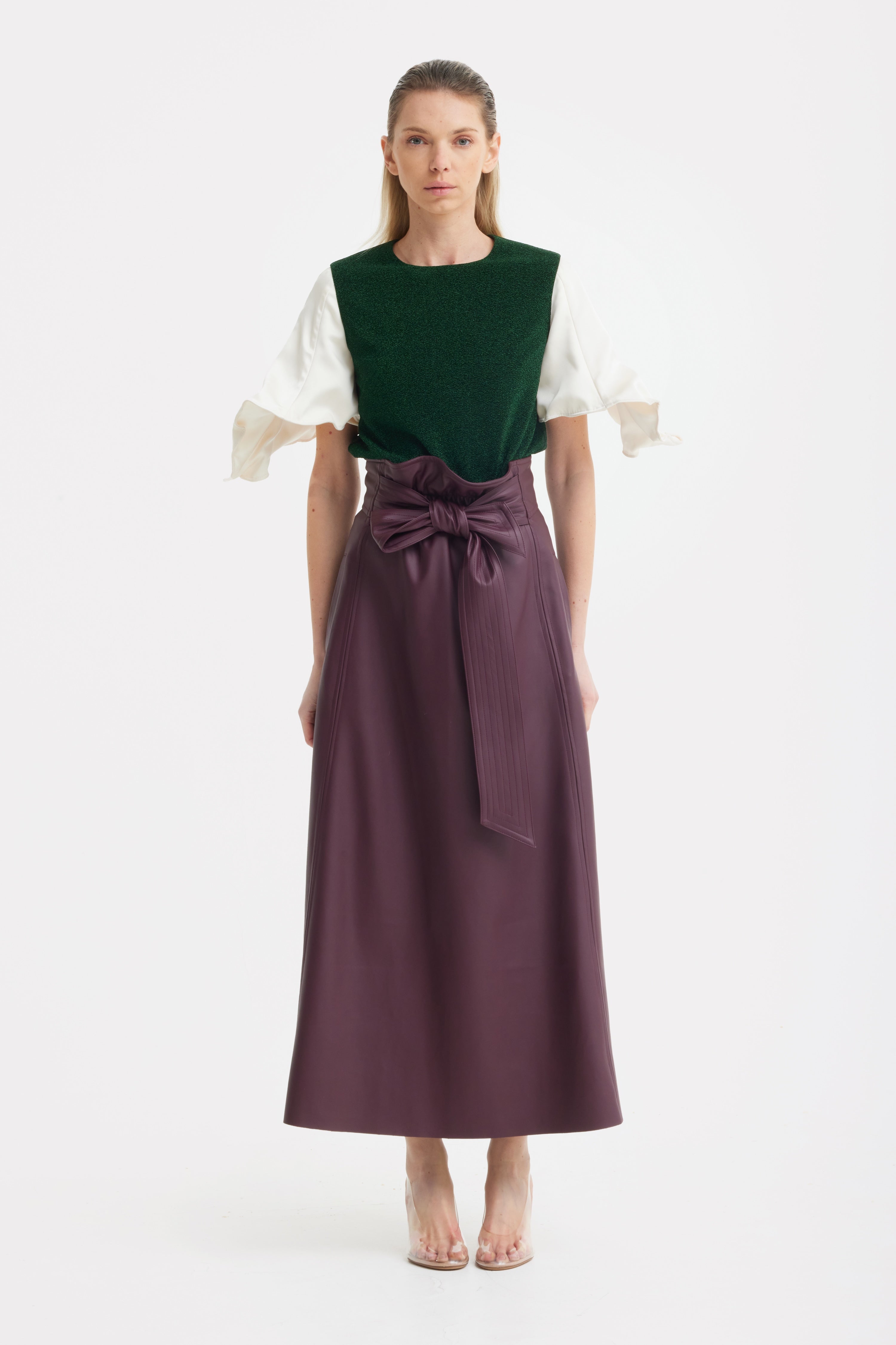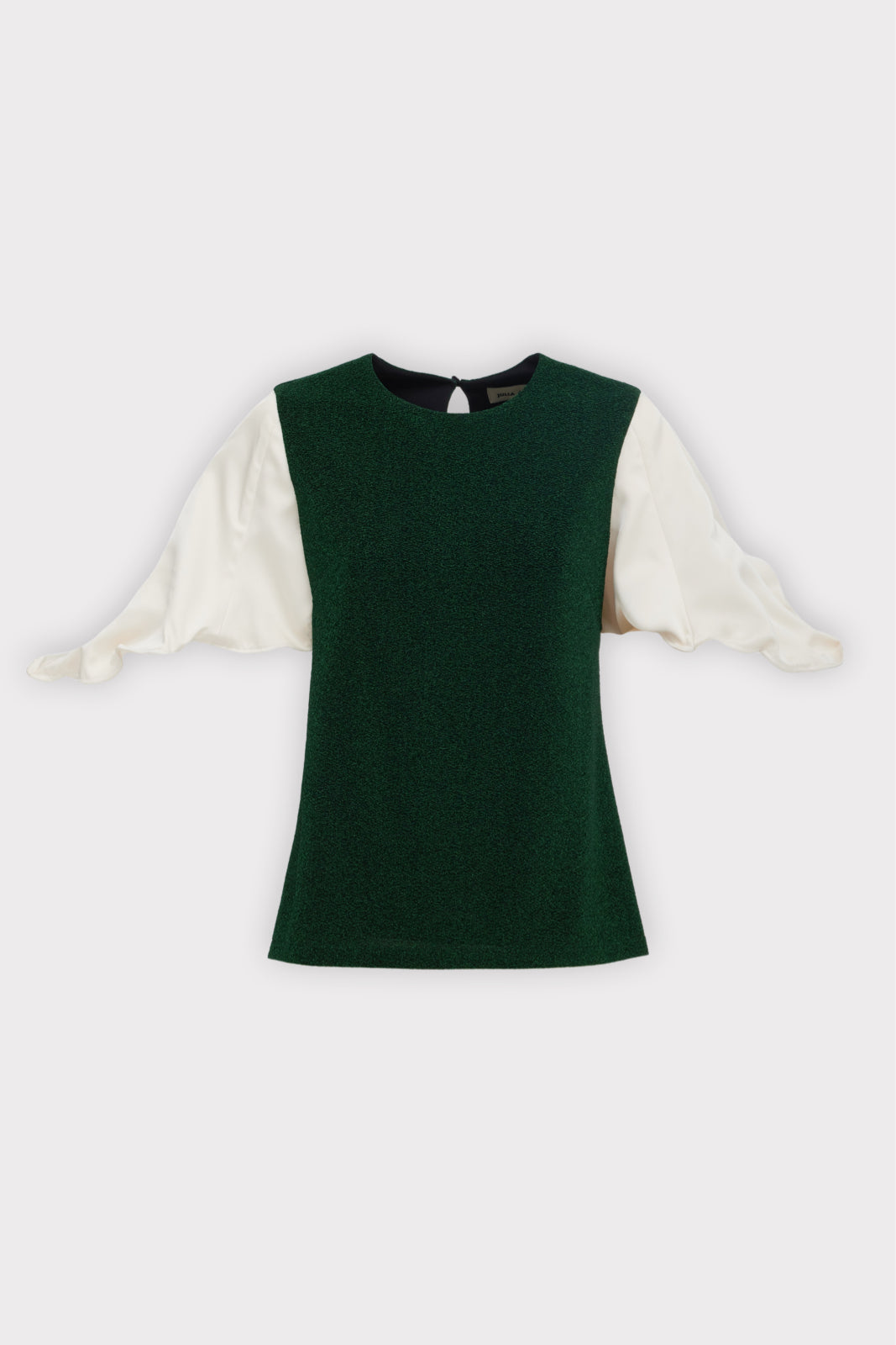Straight silhouette · Lurex knit fabric · Adjustable satin sleeves with ties · Textured green with ivory contrast · Back keyhole closure