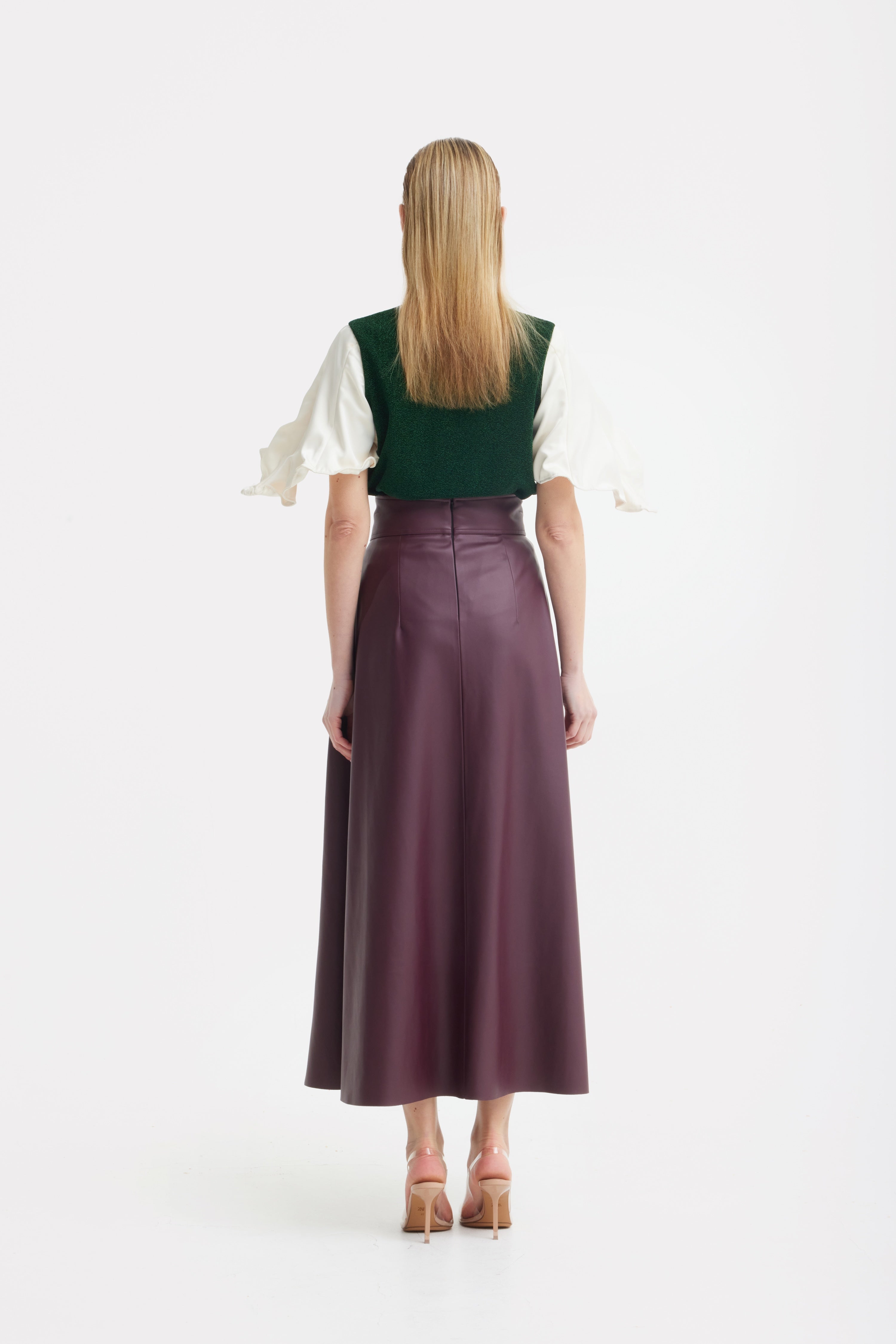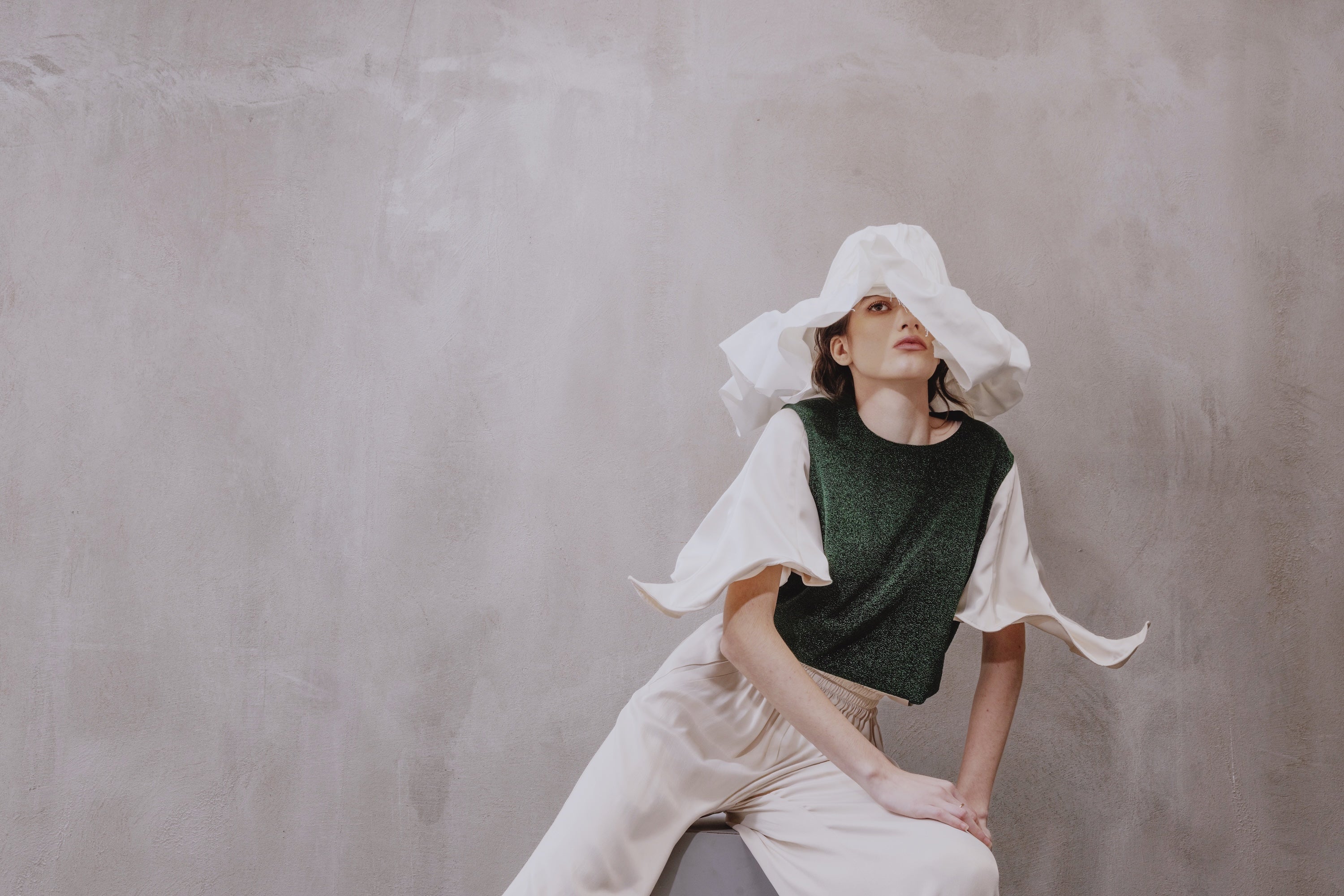 The contrasting ivory satin sleeves introduce softness and fluidity. Designed with adjustable ties, they allow subtle styling variations while maintaining the integrity of the shape. The gentle drape of satin against the structured knit creates a harmonious dialogue between strength and delicacy.