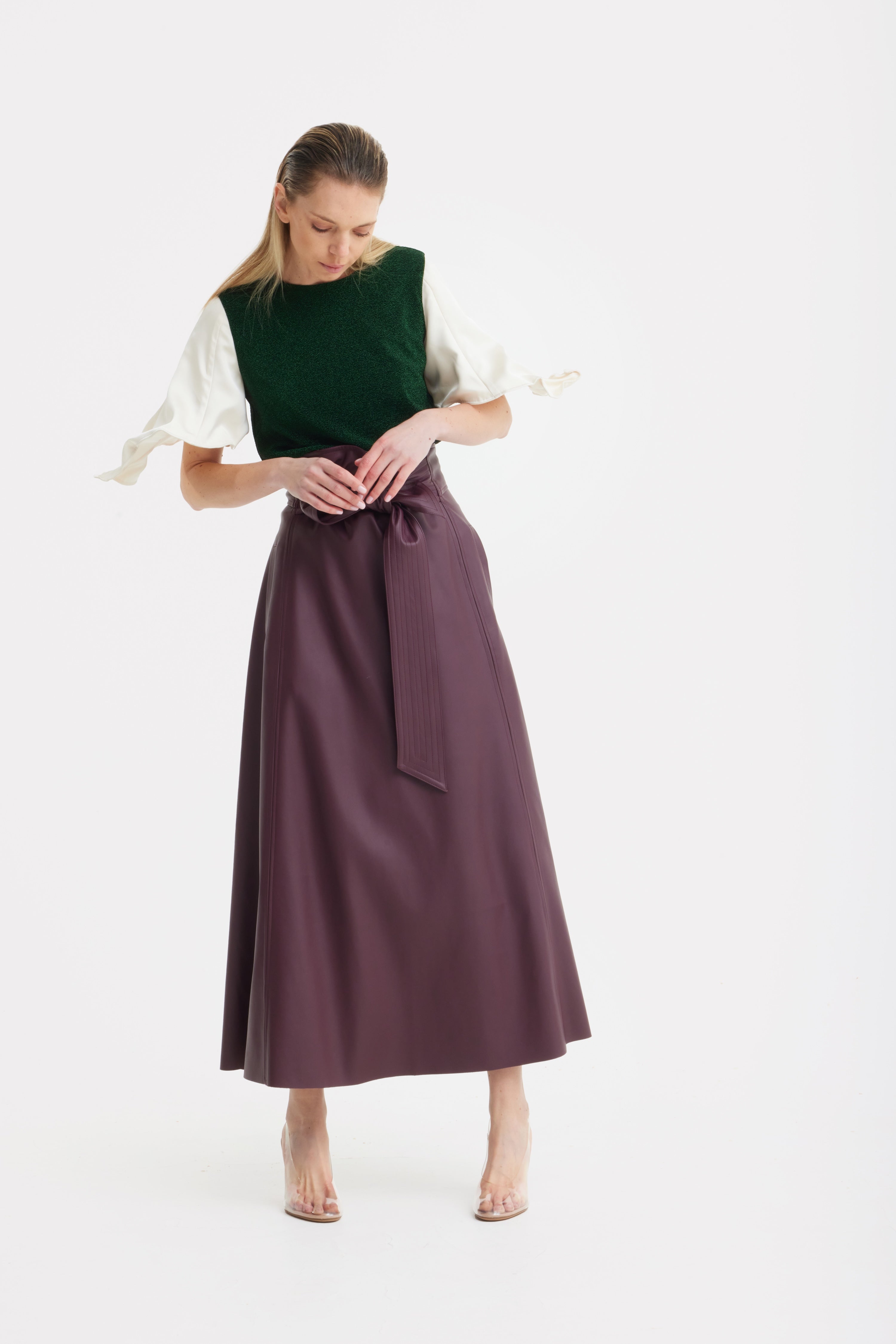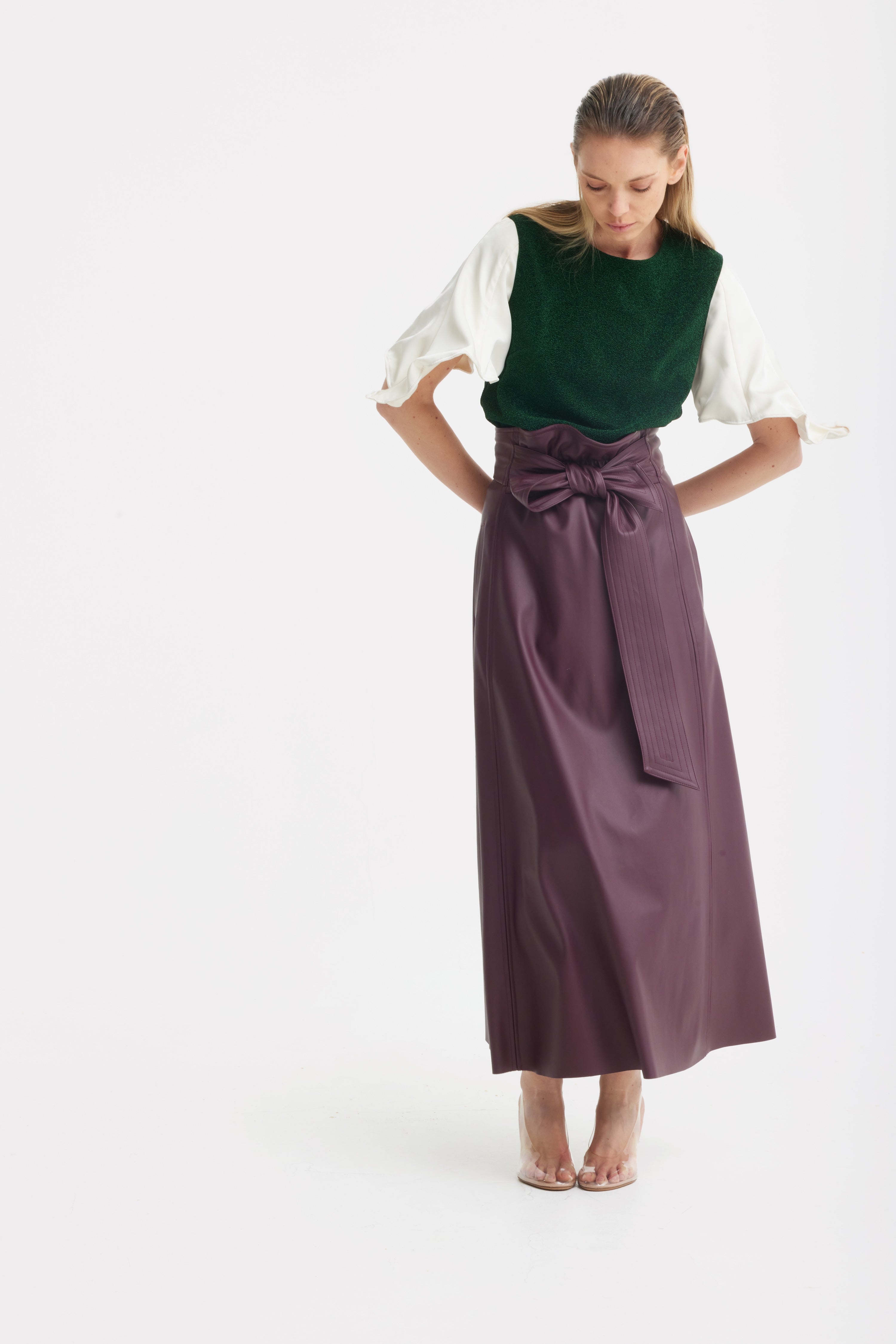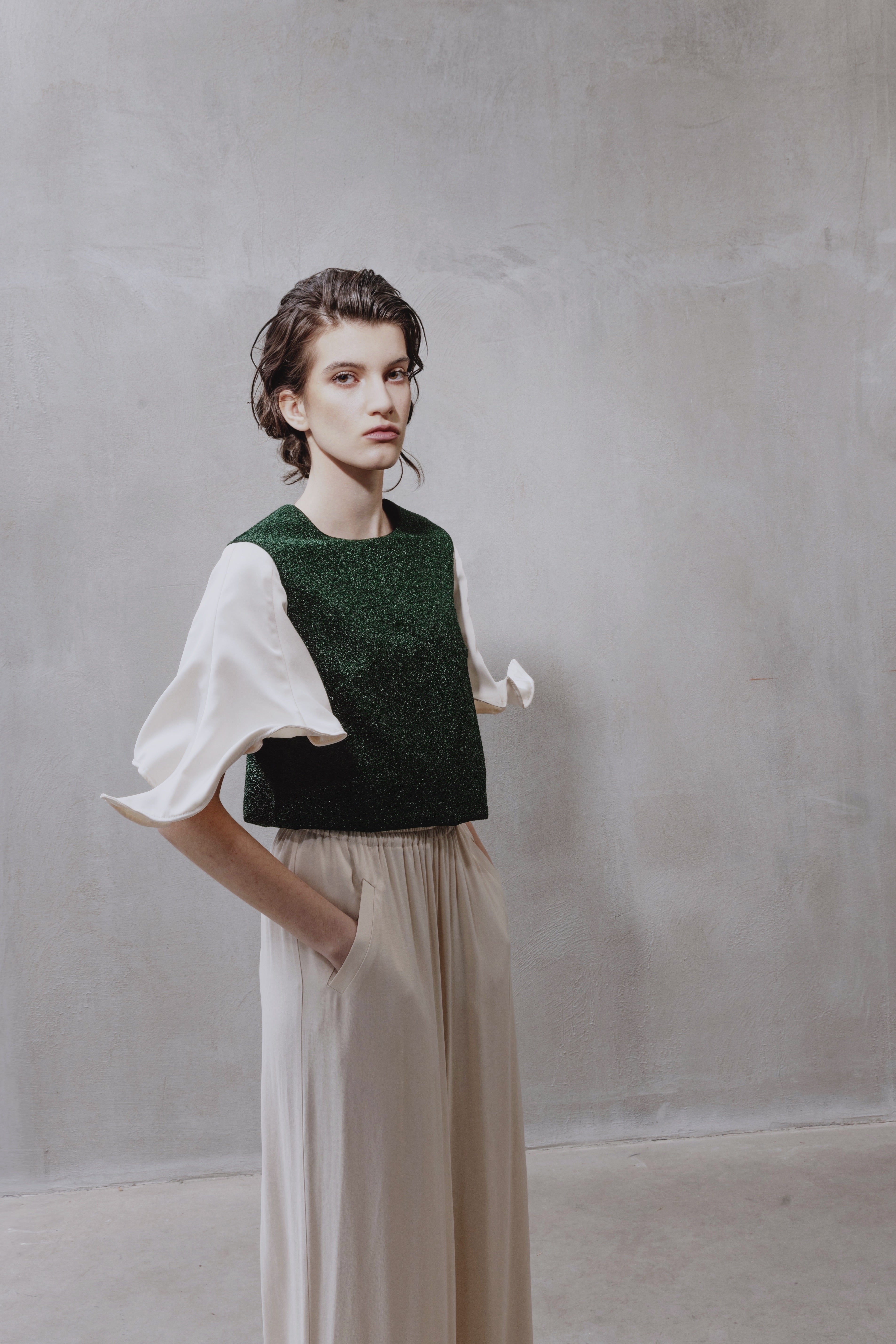 A refined interplay of texture and light. This top is crafted from shimmering green lurex knit that subtly catches the light, creating depth and dimension within a clean, structured silhouette. The straight cut and balanced proportions make it both versatile and polished.