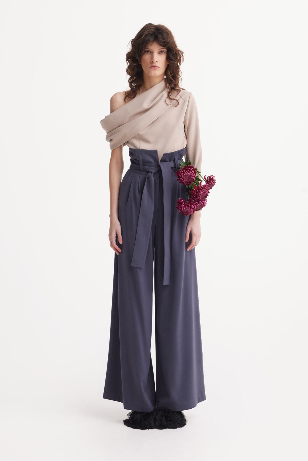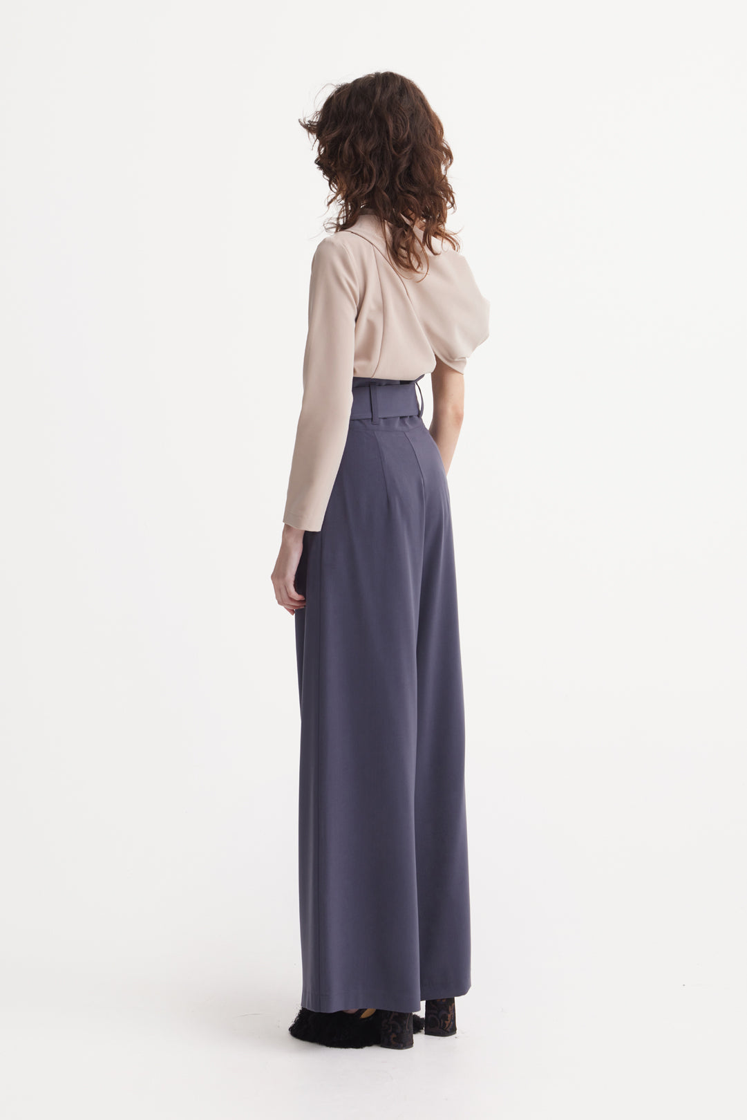 The trousers boast expertly engineered pleating, adding a sophisticated and detailed element to the design. A corset feature at the waist, along with a matching belt, work together to beautifully sculpt the waistline, emphasizing the tailored silhouette. The fabric's exquisite drape contributes to the trousers' elegant movement, making them a standout piece in terms of both aesthetics and functionality.
