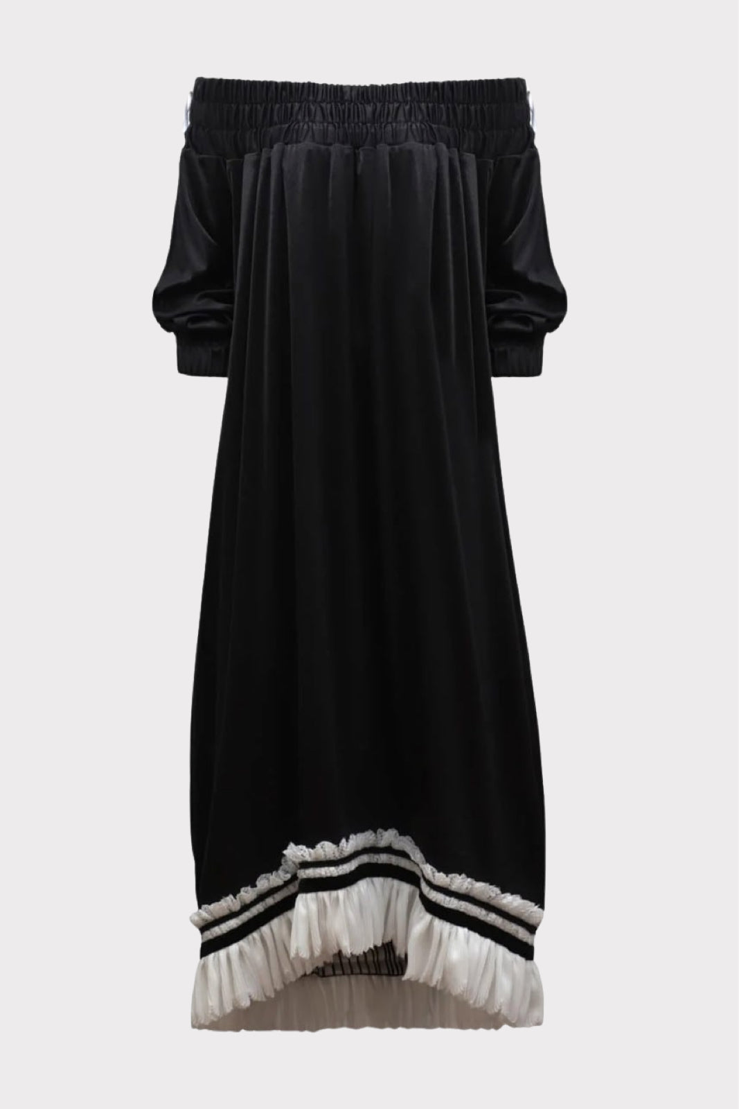 Turn heads in this Black Knit Bare Shoulder Midi Dress, a perfect blend of elegance, romance, and comfort. Crafted from high-quality soft knit fabric, this dress gently hugs the figure while offering all-day ease. The elasticized off-shoulder neckline and cuffs ensure a secure yet relaxed fit, while the asymmetrical hemline adds graceful movement.