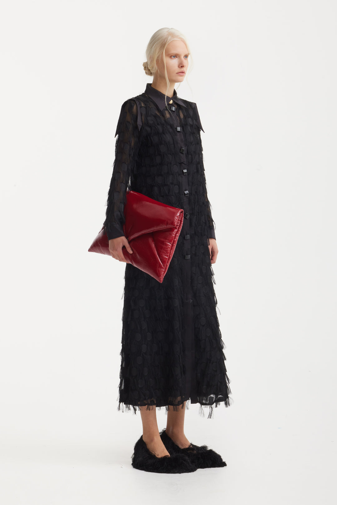 The included cape elevates the outfit to new heights of elegance. Crafted from translucent fabric, the cape imparts an airy and mysterious quality to the overall image. In a shirt dress style, the cape is partially adorned with fringe, creating a magnificent and spectacular appearance.