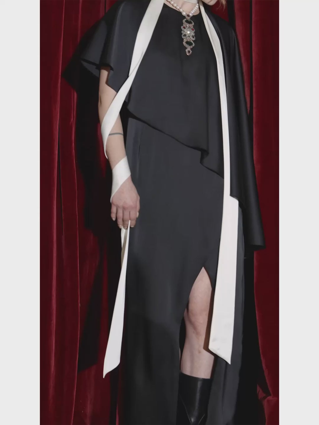 Command attention with this sculptural Black Satin Cape Dress, where elegance meets avant-garde form. The design features a fitted, sleeveless inner dress with a soft round neckline, creating a minimalist base for bold styling. Draped asymmetrically over one shoulder, the fluid satin cape adds movement, contrast, and architectural grace.