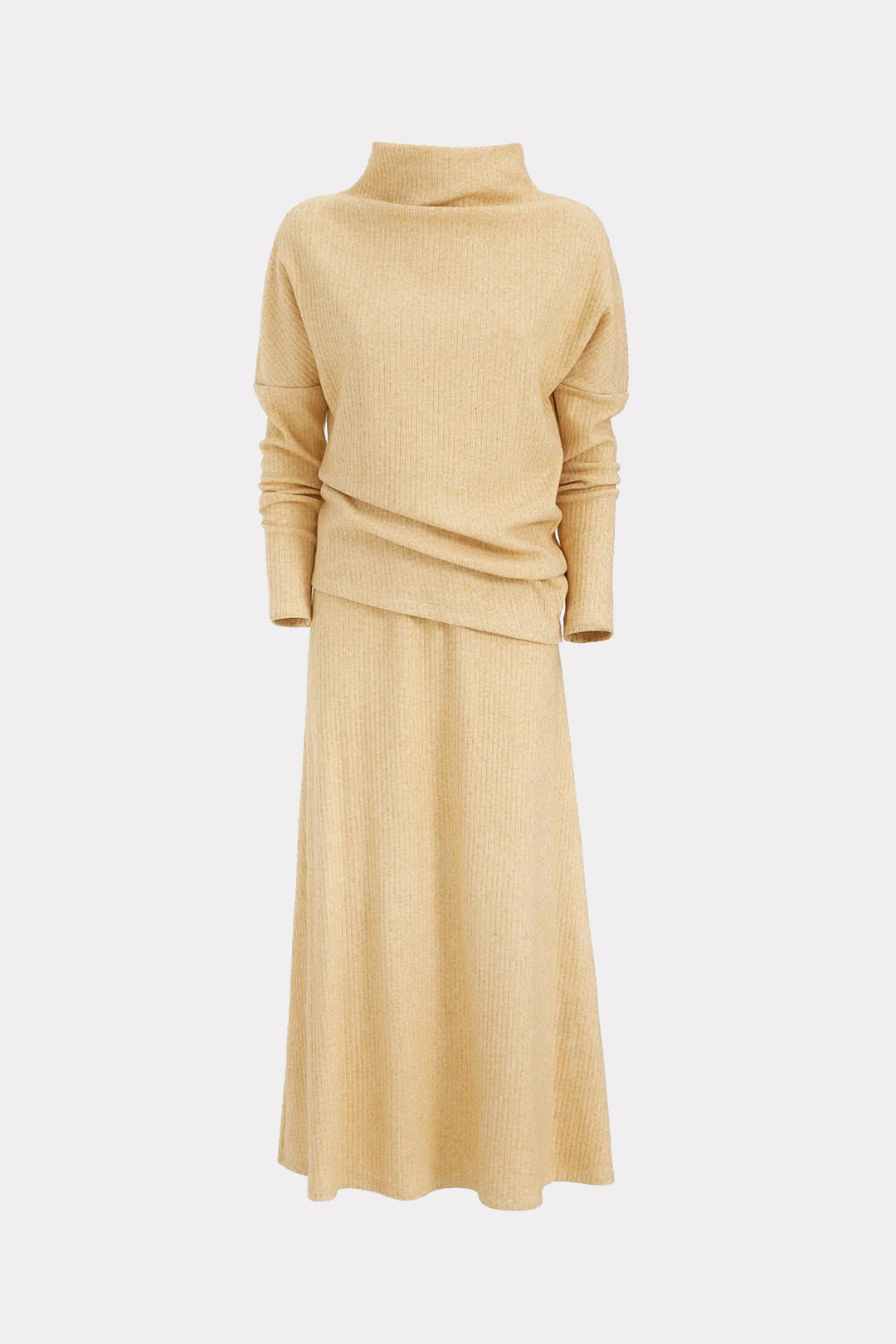 This yellow and orange rib knit suit, featuring an asymmetric blouse and a classic midi skirt, is more than just a fashion statement. It embodies a sophisticated blend of modern style and undeniable comfort. Whether you choose to wear it as a complete suit or as separate pieces, this ensemble is a striking addition to any fashion-forward wardrobe.