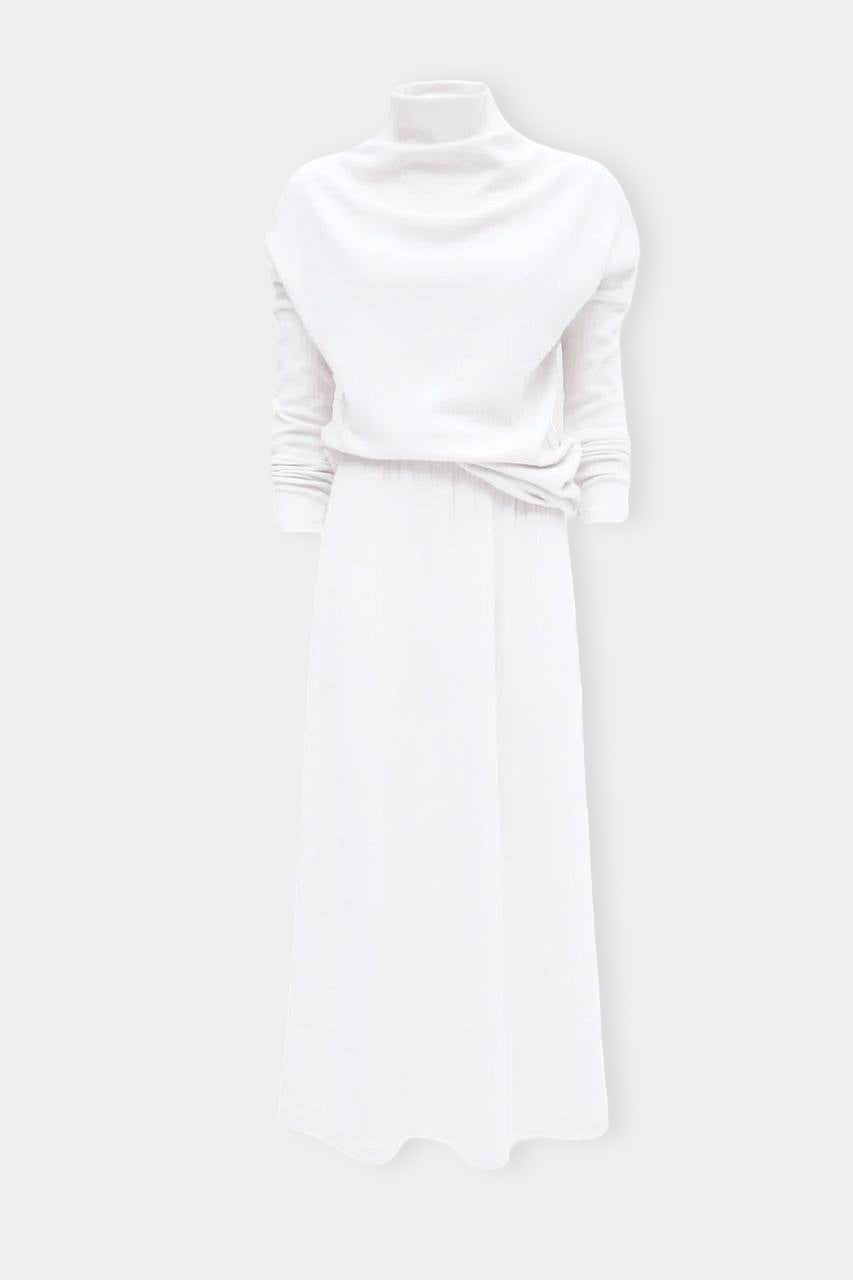 Complementing the blouse is the basic skirt, crafted in a midi-length silhouette that exudes comfort and romance. This skirt's design is both timeless and versatile, making it an ideal choice for a variety of occasions. The inclusion of an elastic band in the waist ensures a secure and adaptable fit, accommodating different body shapes with ease. Our white rib knit suit is a must-have addition to your wardrobe, offering endless styling possibilities while keeping you comfortable and chic in every situation.