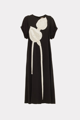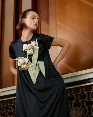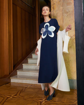Silky Touch Midi Dark Blue Dress With Handmade Floral Appliqué