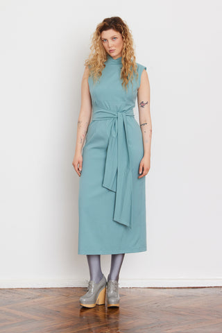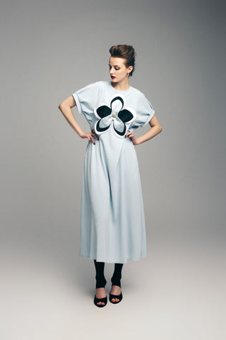 Silky Touch Midi Light Blue Dress With Handmade Floral Appliqué
