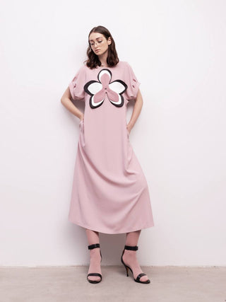 Silky Touch Midi Pale Pink Dress With Handmade Floral Appliqué