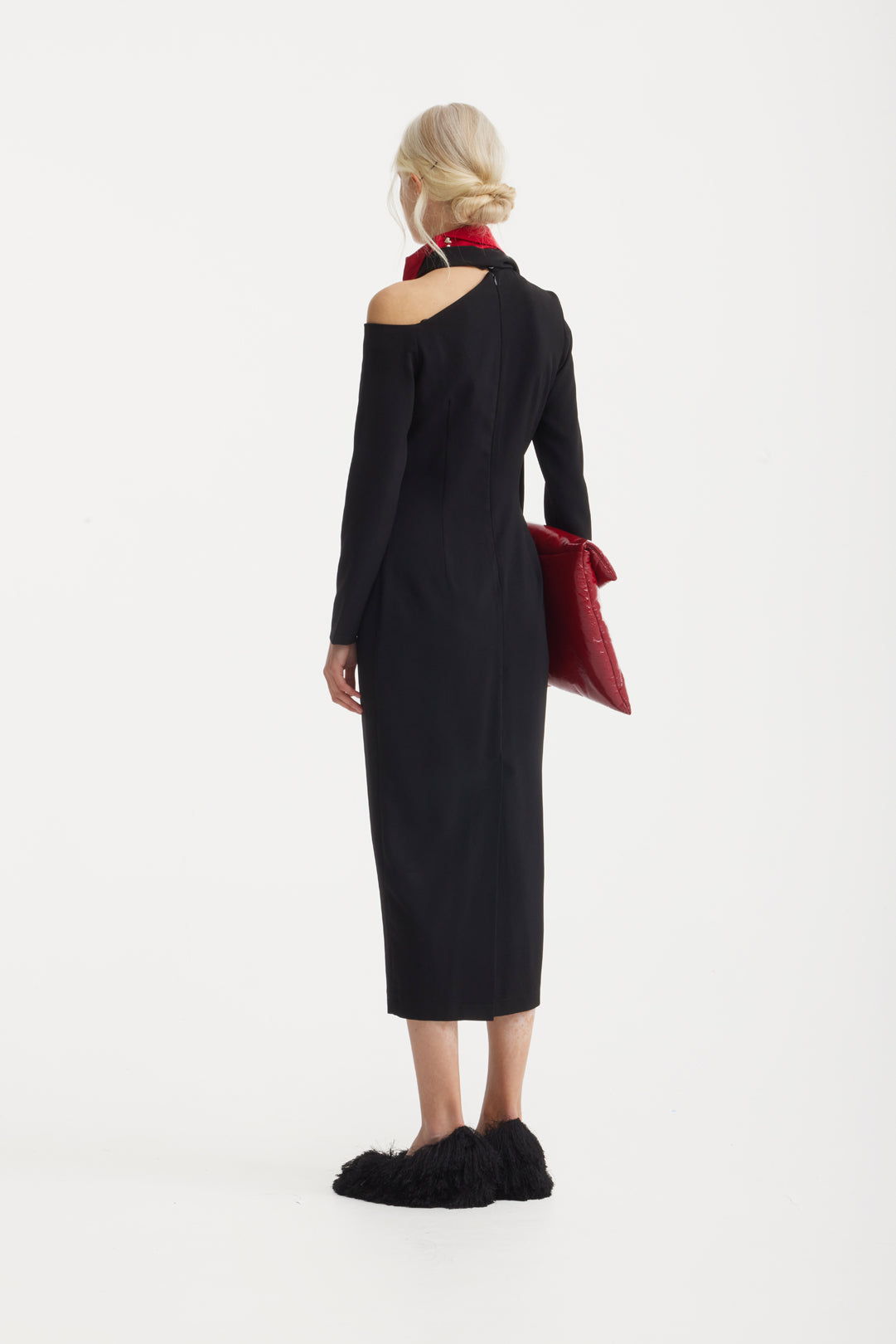 Elevate your evening wardrobe with this elegant black midi dress that blends modern allure with timeless sophistication. Featuring an asymmetrical design, the high neckline flows into a bold diagonal drape, leaving one shoulder strikingly exposed for an eye-catching look. The fitted silhouette, complemented by long sleeves, highlights your figure while ensuring comfort. Thoughtfully designed, it includes hidden side pockets for a practical touch and a discreet zipper for effortless wear. Made from premium fabric, this dress offers a luxurious feel and is perfect for formal occasions or special evenings. A true statement piece for the confident and stylish woman.