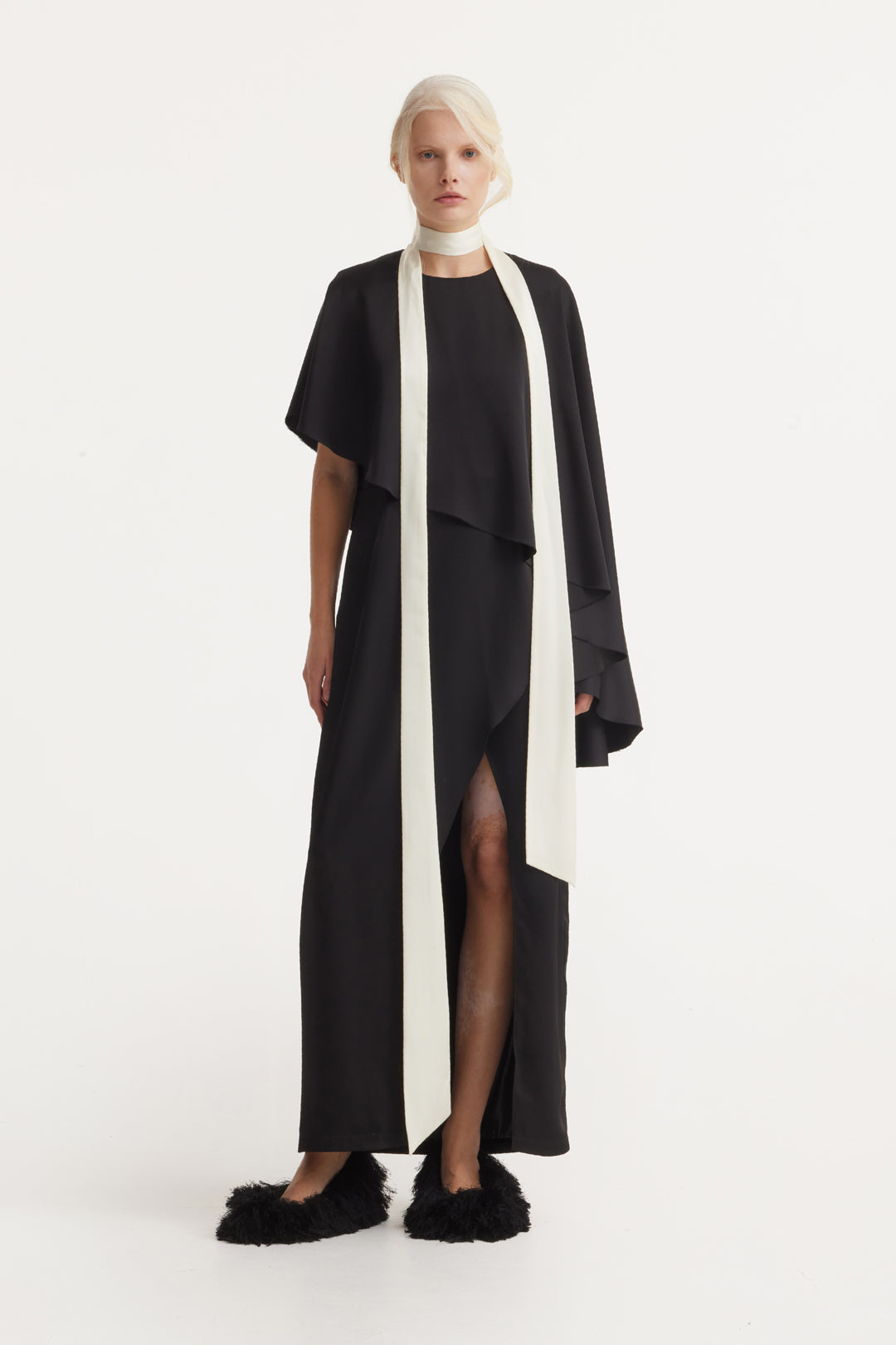 A front slit with a subtle wrap effect adds a touch of allure and ease of motion. The look is finished with a detachable contrast scarf that can be styled around the neck, draped over the shoulder, or worn loose for a personalized, editorial finish.