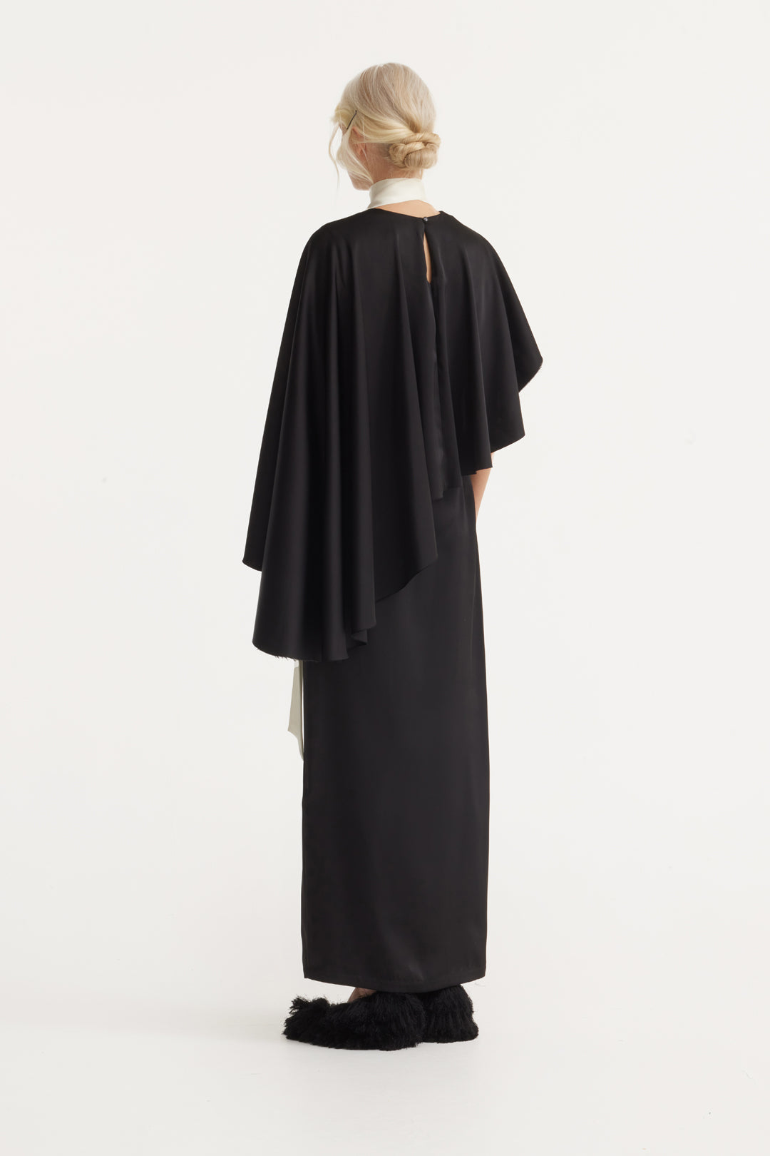 Command attention with this sculptural Black Satin Cape Dress, where elegance meets avant-garde form. The design features a fitted, sleeveless inner dress with a soft round neckline, creating a minimalist base for bold styling. Draped asymmetrically over one shoulder, the fluid satin cape adds movement, contrast, and architectural grace.