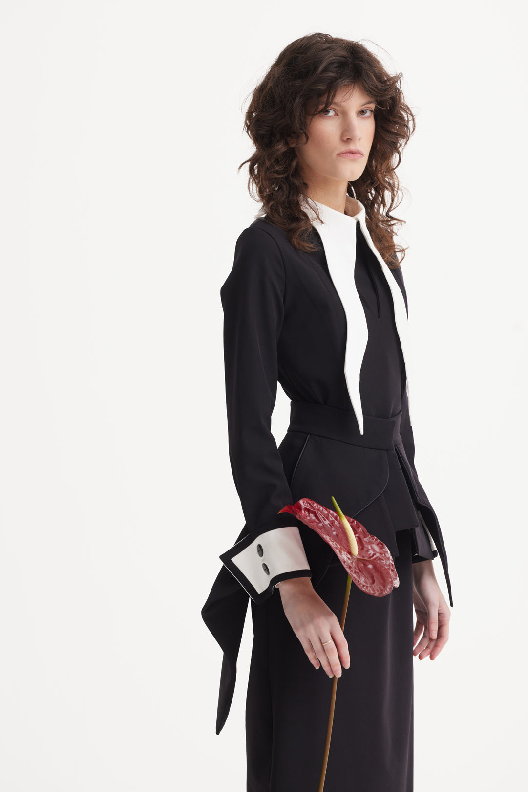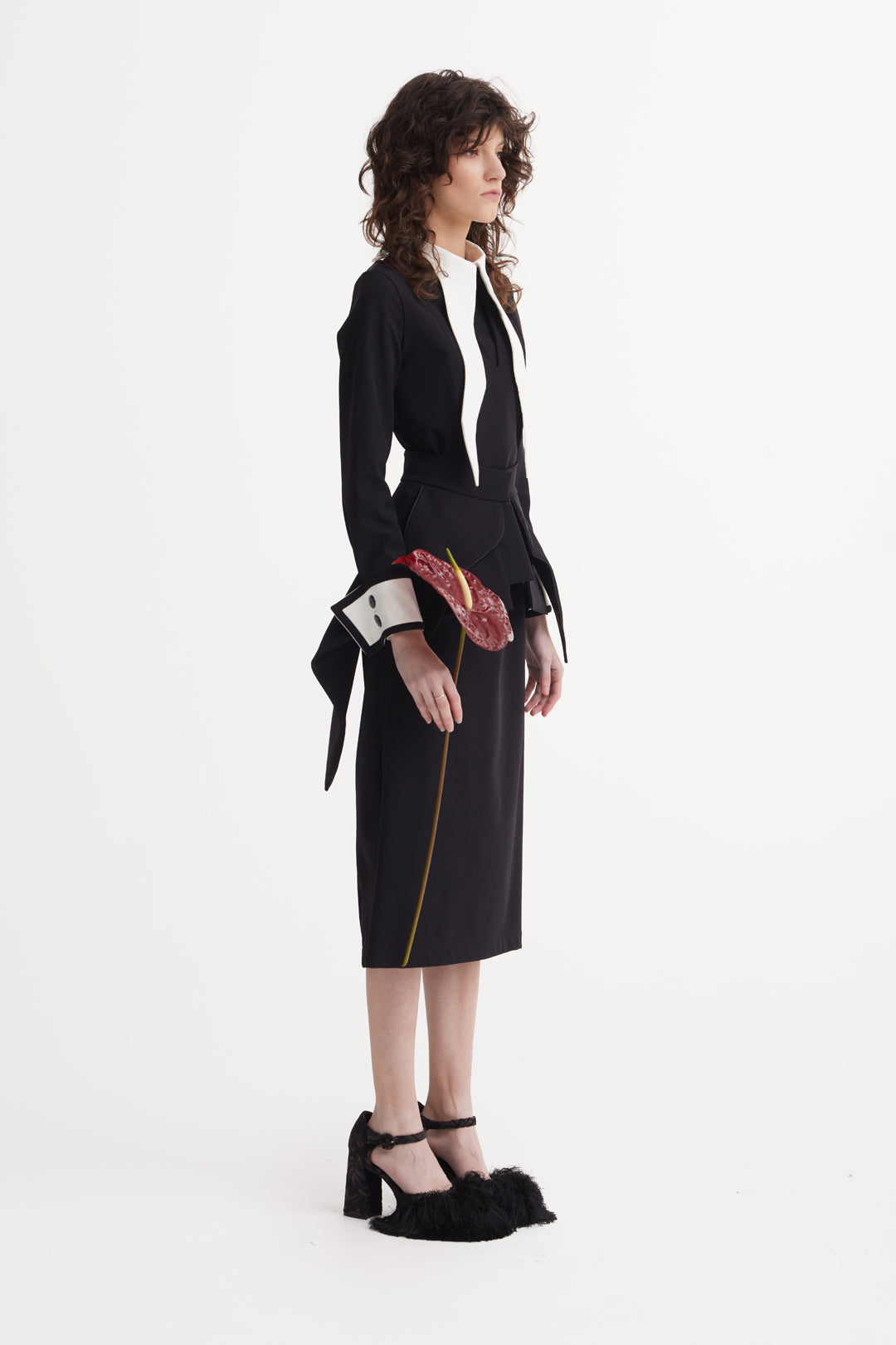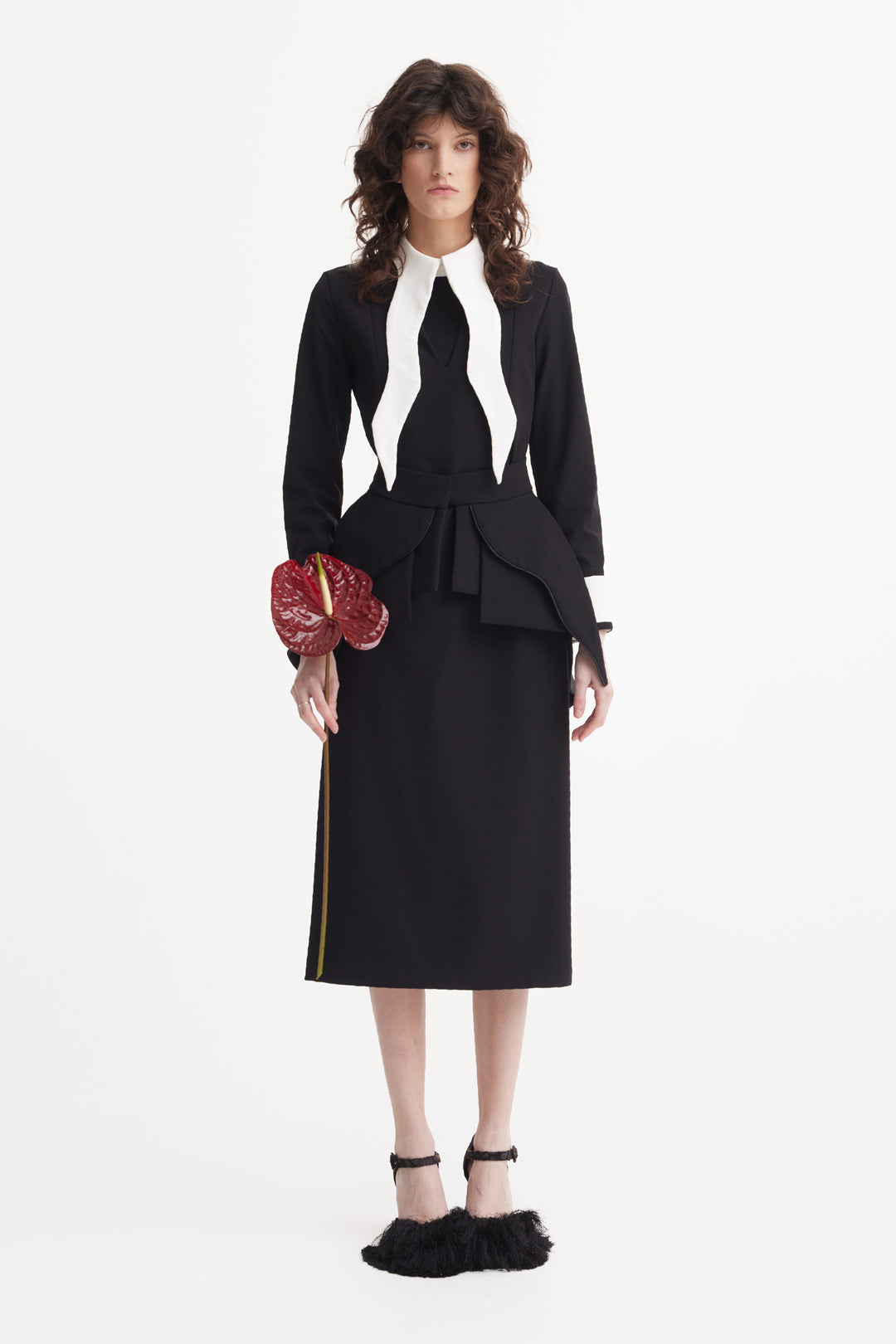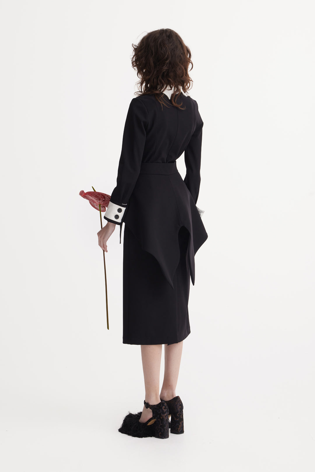 This two-piece set redefines elegance with a sophisticated silhouette and modern details. The midi-length dress is designed with a sculptural peplum that accentuates the waist, offering a striking yet refined look. Long sleeves provide coverage, making it perfect for transitional weather or formal occasions. Crafted from breathable, high-quality fabric, it balances comfort and style effortlessly. The adjustable belt adds a tailored touch, allowing for a customizable fit, while the timeless black hue ensures versatility. Whether for professional settings, evening events, or upscale celebrations, this dress delivers understated glamour with contemporary edge.