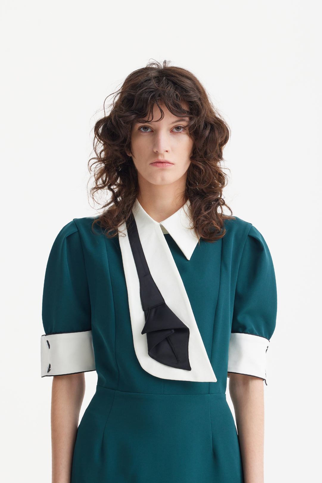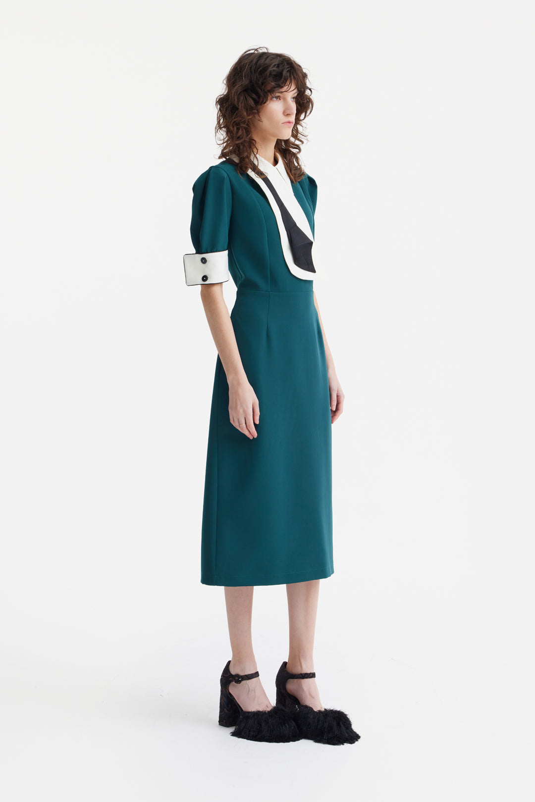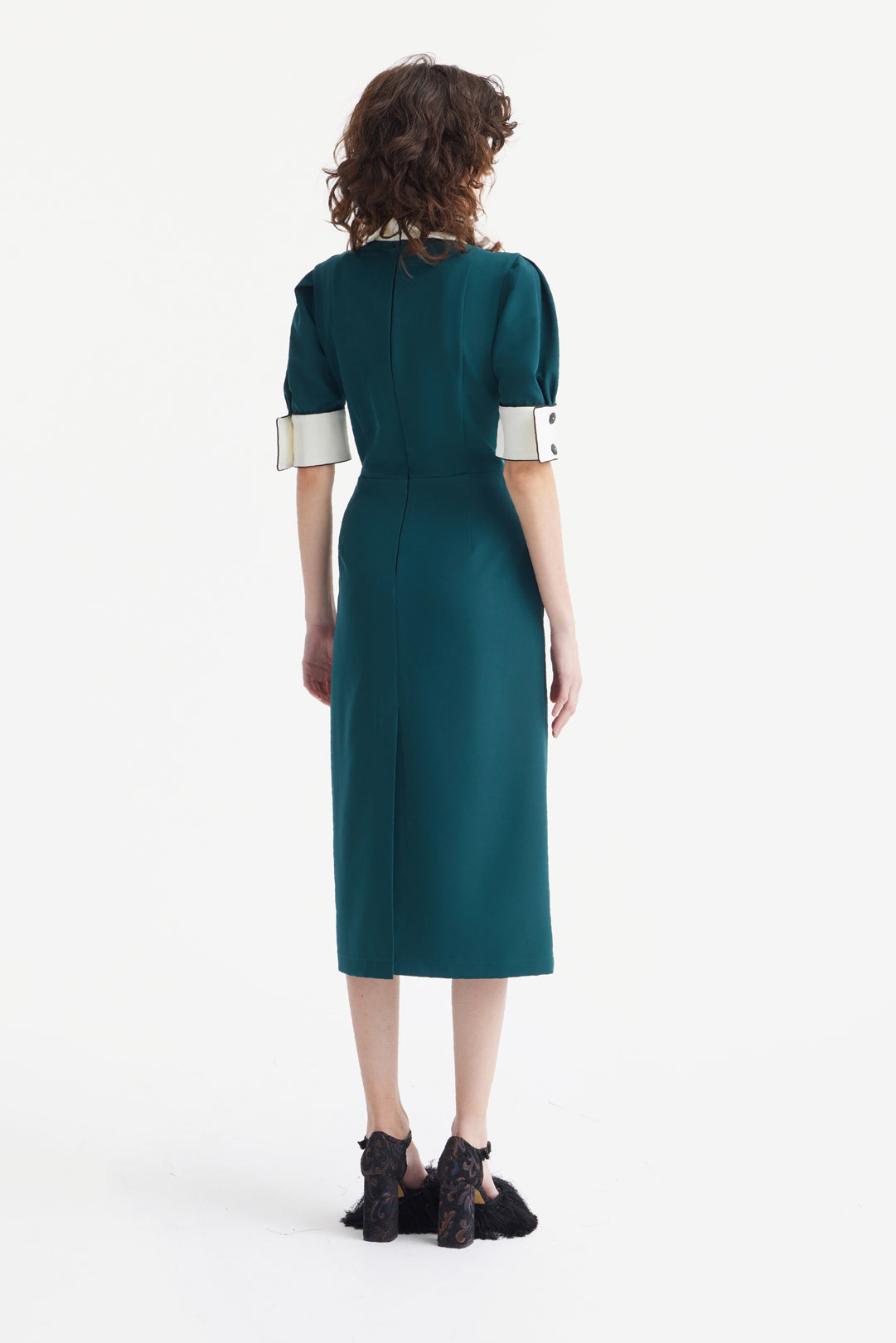 This green midi dress combines classic tailoring with bold contrast. Cut from a high-quality viscose blend, it offers structure with a soft hand for all-day comfort. A crisp white collar and layered front detail add graphic precision, while short sleeves with wide white cuffs and button accents enhance the refined finish. The tailored silhouette is shaped with precise seams and a hidden back zipper for a clean look. Ethically made in Europe, it’s a versatile piece designed for office wear, formal occasions, or evening edits.