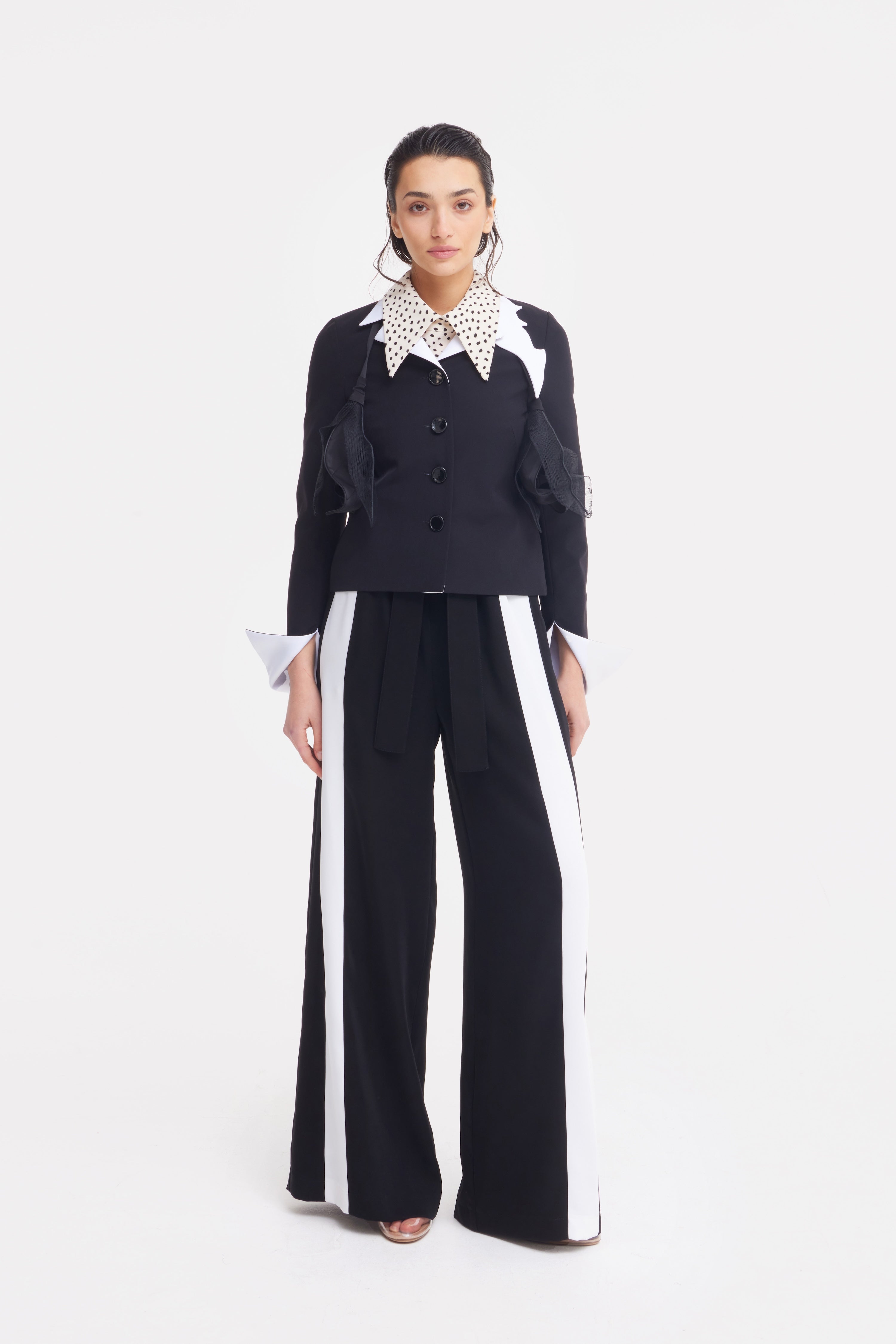 Elevate your style with this tailored black cropped blazer, featuring a striking white collar with an artistic design for a bold, modern twist. Made from a soft, stretchy blended fabric, it offers a sleek finish and a structured fit that maintains its shape. Fully lined for added comfort and durability, this blazer is designed with long sleeves, a buttoned front, and a slightly cropped silhouette that exudes contemporary elegance. Perfect for professional settings or evening outings, this versatile piece pairs effortlessly with tailored trousers, skirts, or high-waisted jeans for a chic, statement-making ensemble.