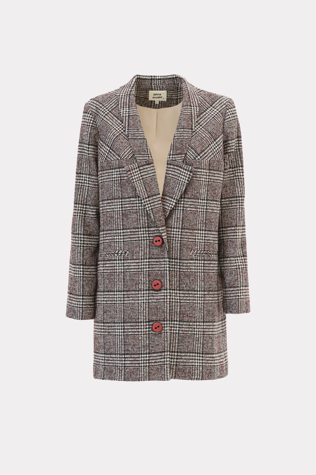 A plaid blazer that combines heritage style with modern sophistication. This oversized single-breasted blazer, crafted from a lightweight wool blend, features a classic plaid pattern that brings timeless appeal. The tailored fit subtly accentuates the waistline, while the fully lined interior ensures all-day comfort. With notched lapels, functional front pockets, and a three-button closure, this blazer effortlessly blends practicality with style. Whether paired with matching trousers for a coordinated look or styled with jeans for casual elegance, this blazer is a versatile wardrobe essential.