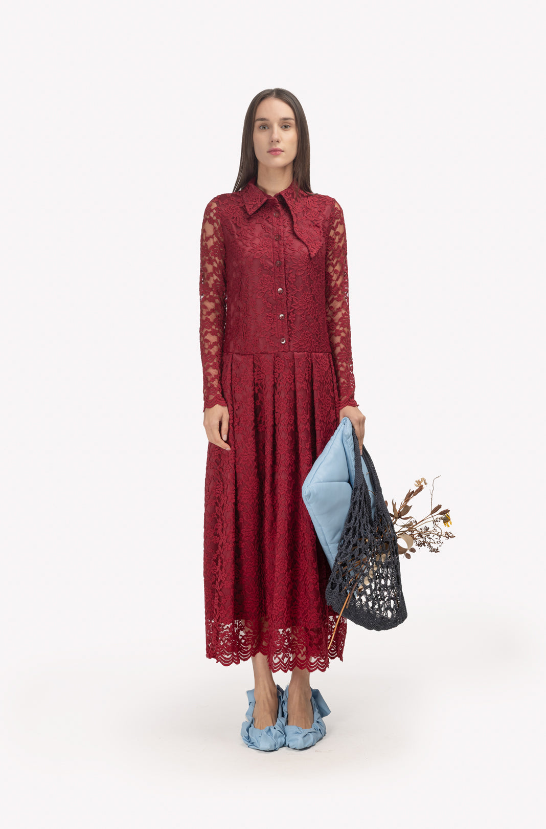 Step into graceful sophistication with this Burgundy Feminine Lace Shirt Dress, a refined midi-length piece crafted from intricate floral lace and luxuriously lined with satin. The deep burgundy hue enhances its timeless appeal, while the straight, loose silhouette flatters every figure with ease and elegance.