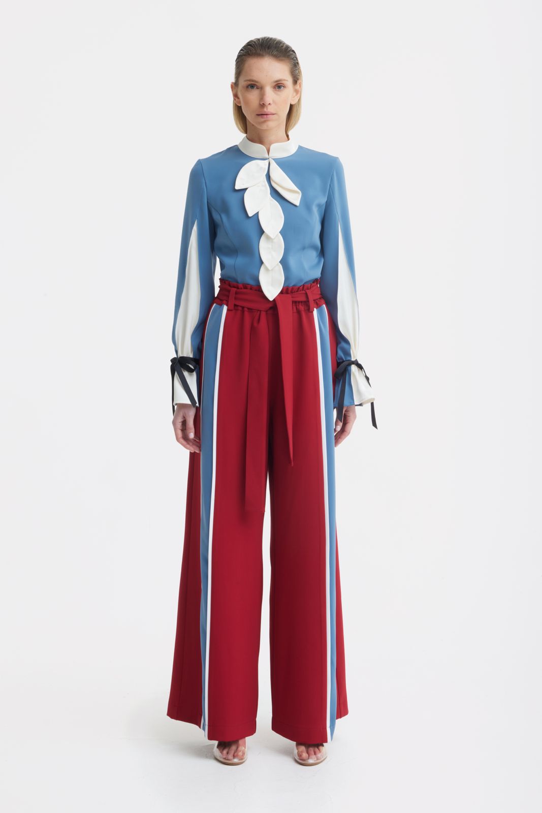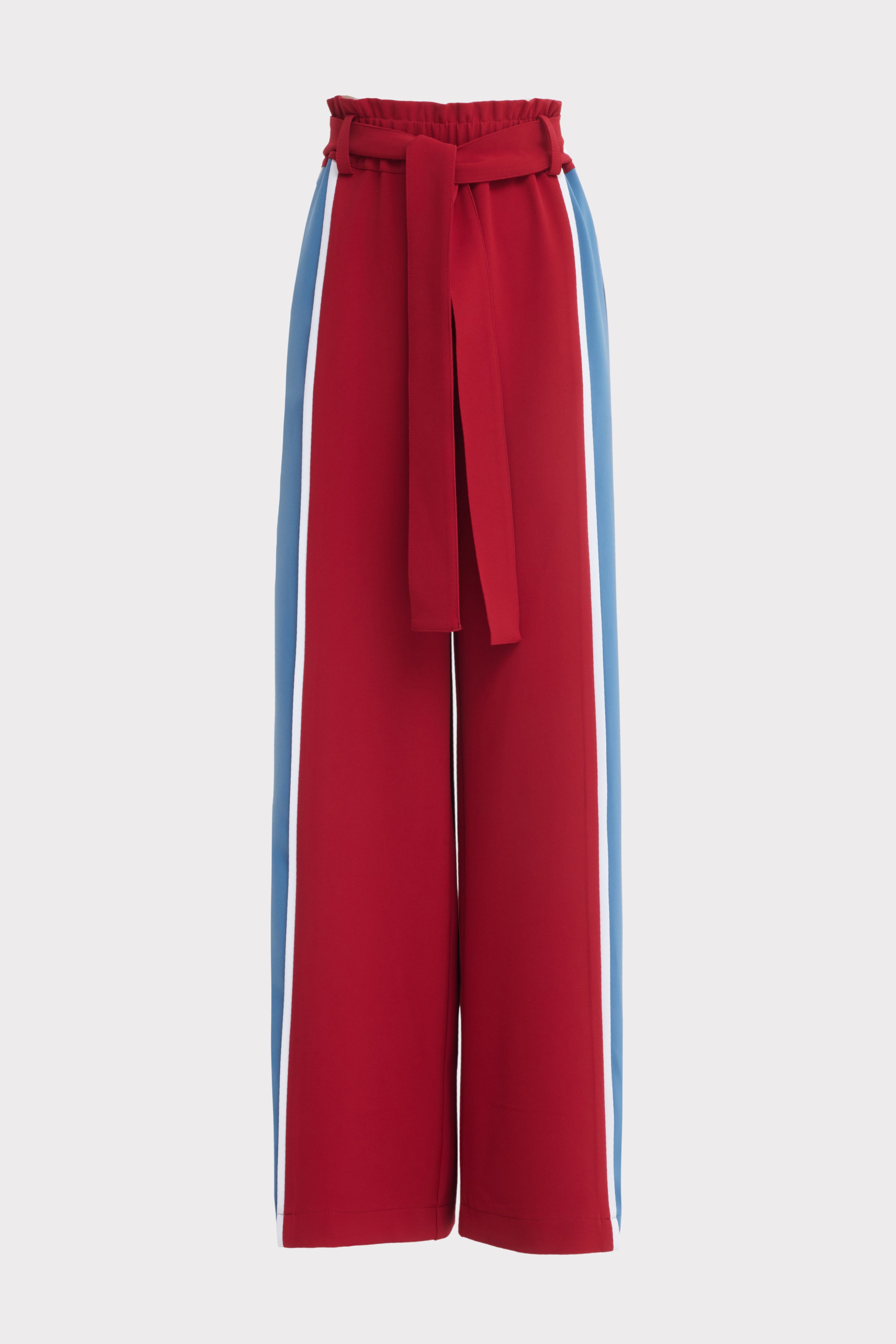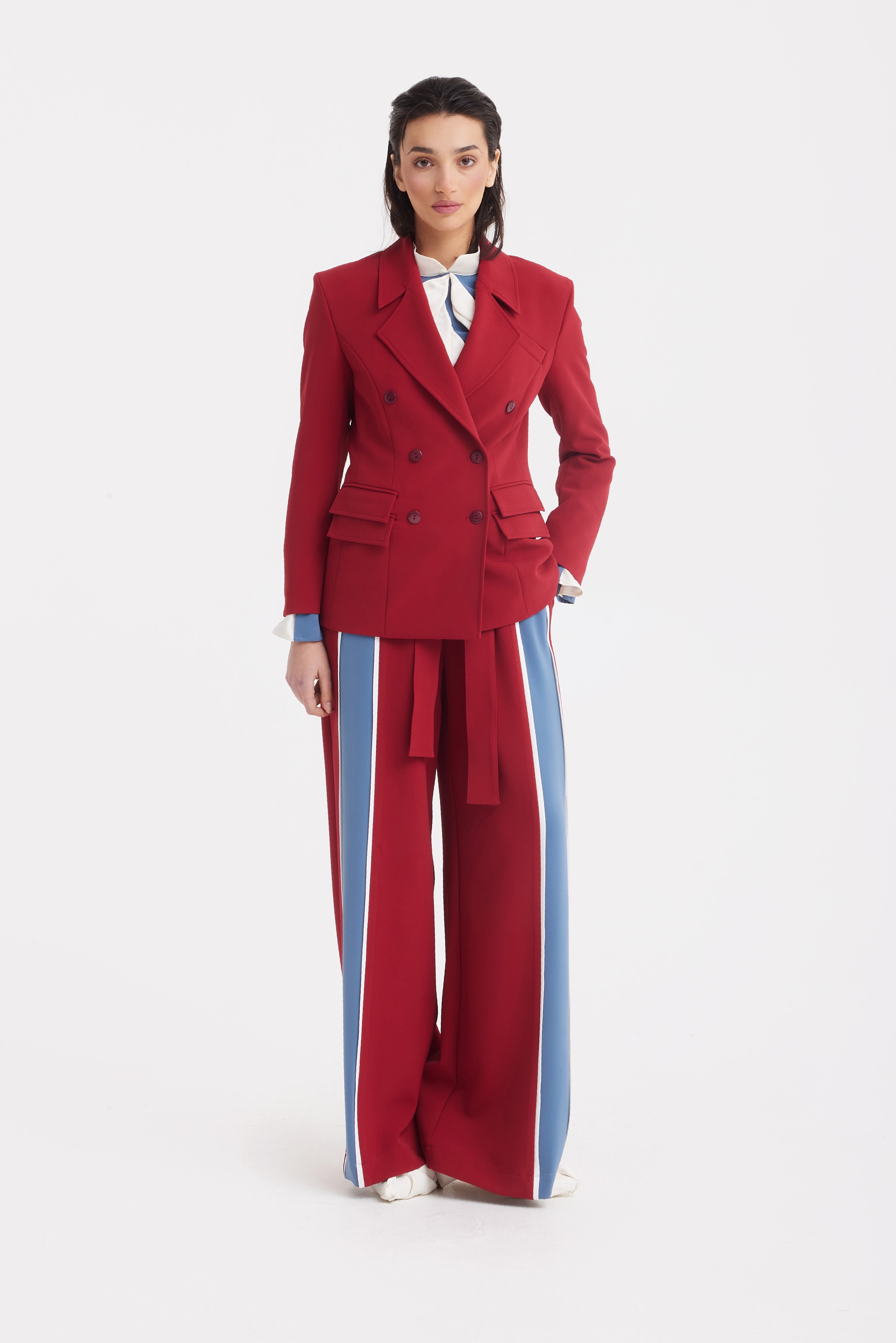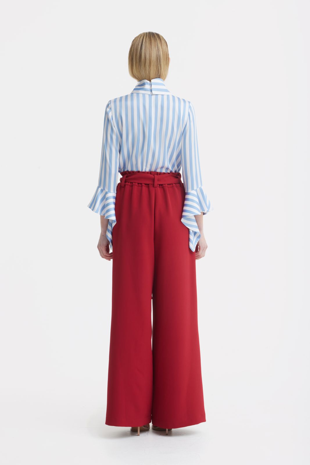 Designed with a strong yet elegant silhouette, these high-waist wide leg pants bring architectural precision to a timeless form. The sculpted waistband sits high on the waist, enhancing proportions, while the wide leg cut creates a fluid, elongated line. An integrated self-tie belt allows for a defined and adjustable fit, adding a refined detail to the waistline. Contrasting vertical stripes introduce a graphic accent and visually lengthen the legs. Crafted from smooth, structured fabric with a clean drape, these pants retain their shape and sophistication throughout the day. A statement piece for modern tailoring, suited for elevated business looks, evening ensembles, or confident everyday styling.