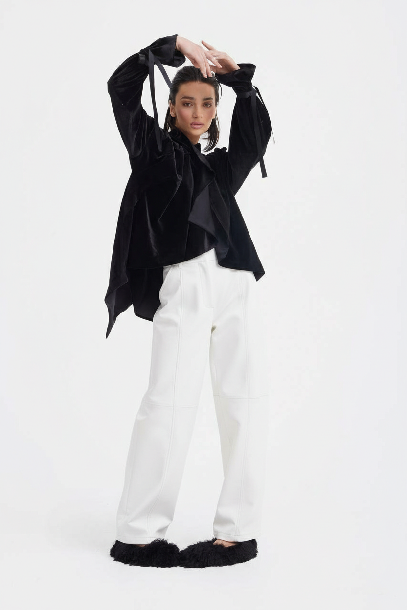 These high-waisted barrel-leg pants are designed to create a refined, sculptural silhouette. The softly curved leg shape brings volume and movement, while the clean vertical seams elongate the figure and emphasize the architectural lines of the design.