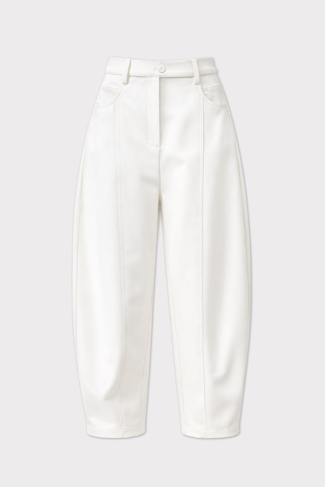 High-waisted design · Barrel-leg silhouette · Vertical seam detailing · Side pockets · Structured waistband with belt loops · Clean white finish