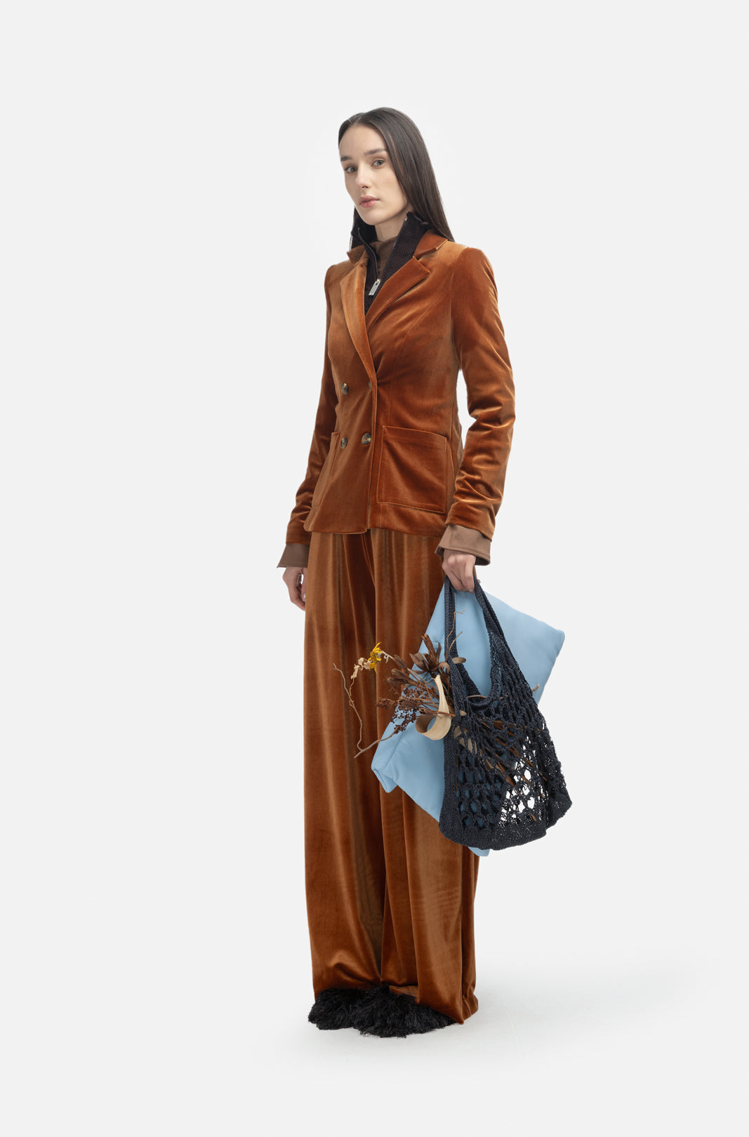Crafted from smooth burnt sienna velvet, this Julia Allert jacket blends sharp tailoring with vintage warmth. The double-breasted cut, structured shoulders, and soft sheen create an instantly elevated silhouette. Perfect over matching trousers or styled with jeans for a chic statement, it’s a versatile piece that bridges sophistication and individuality.