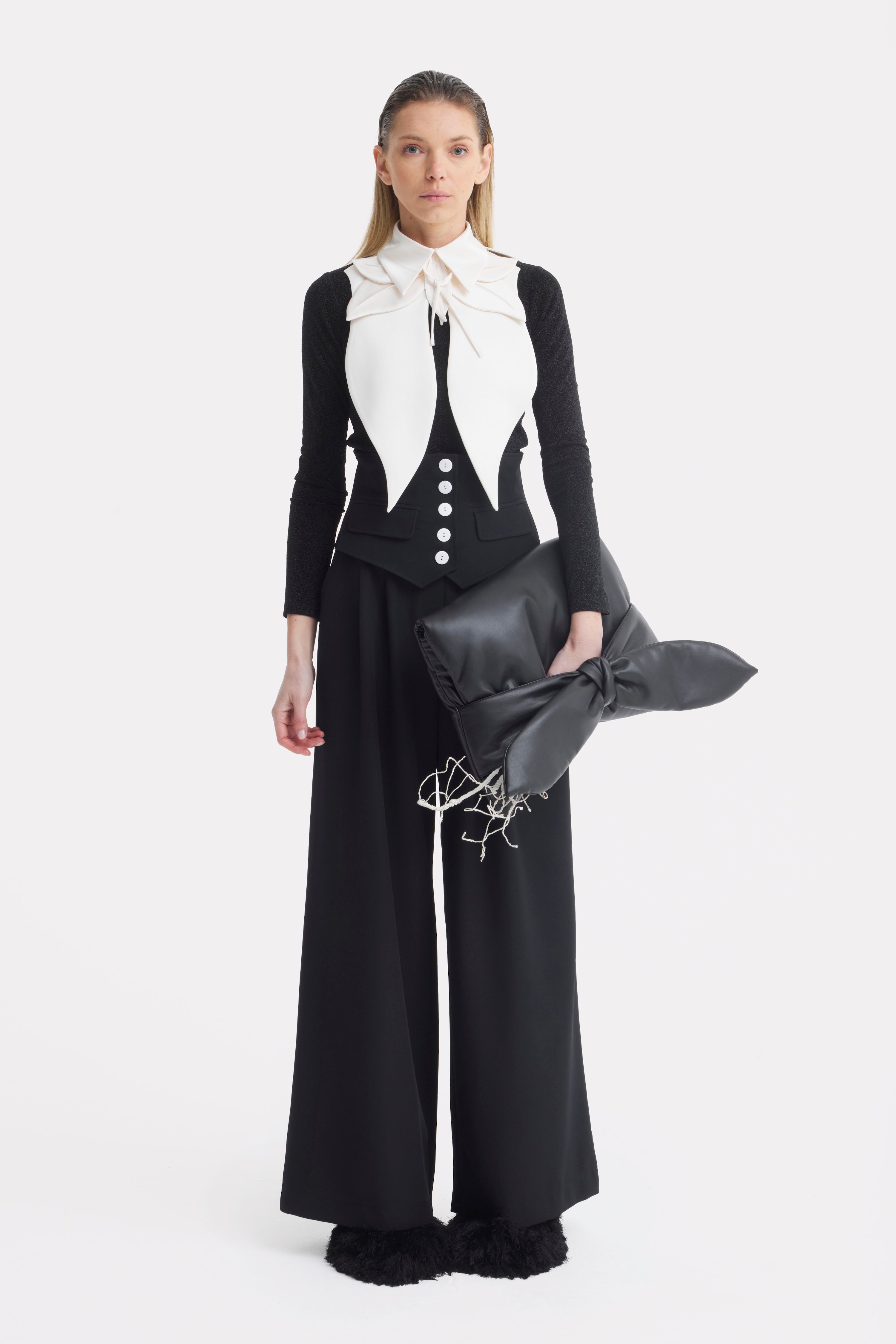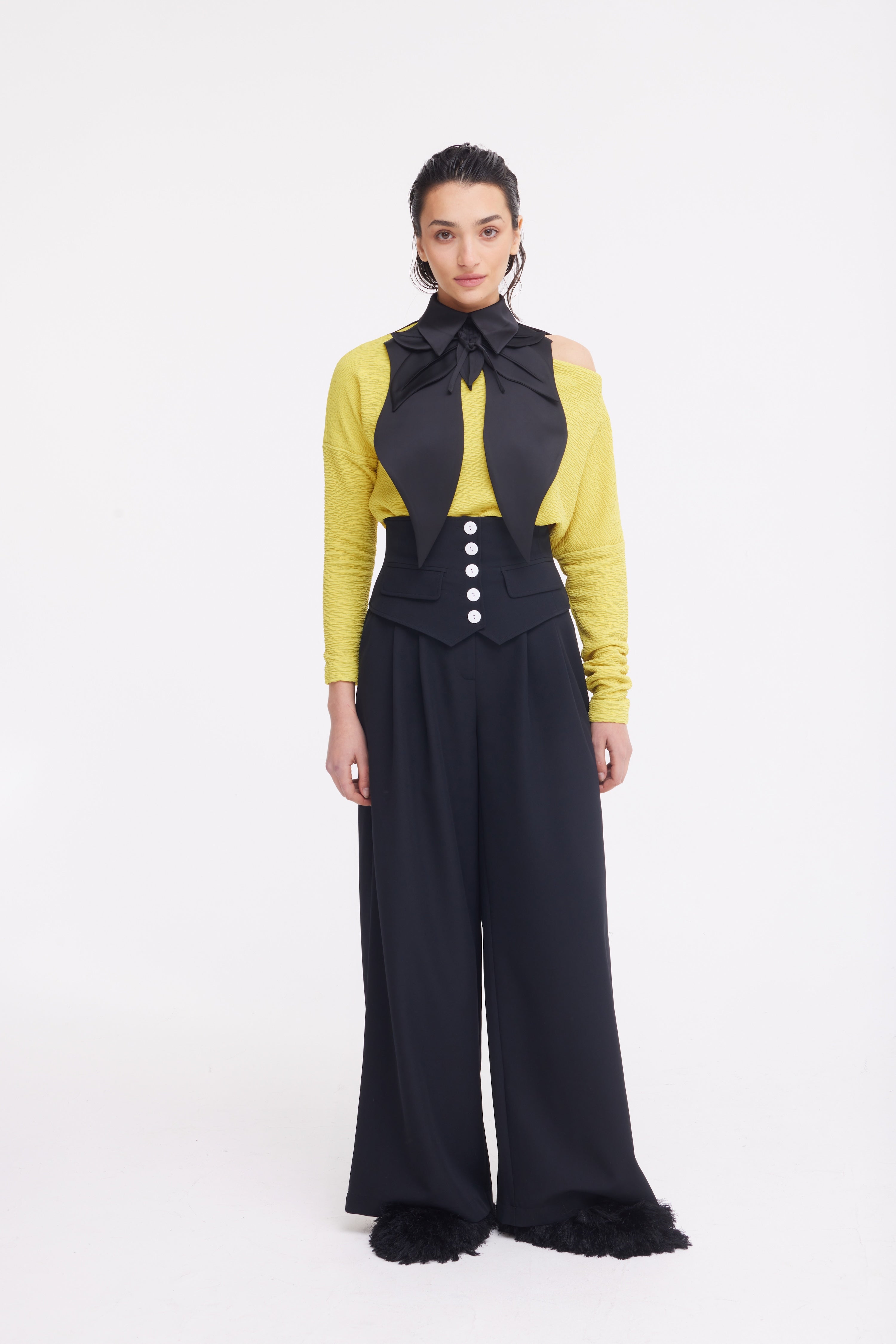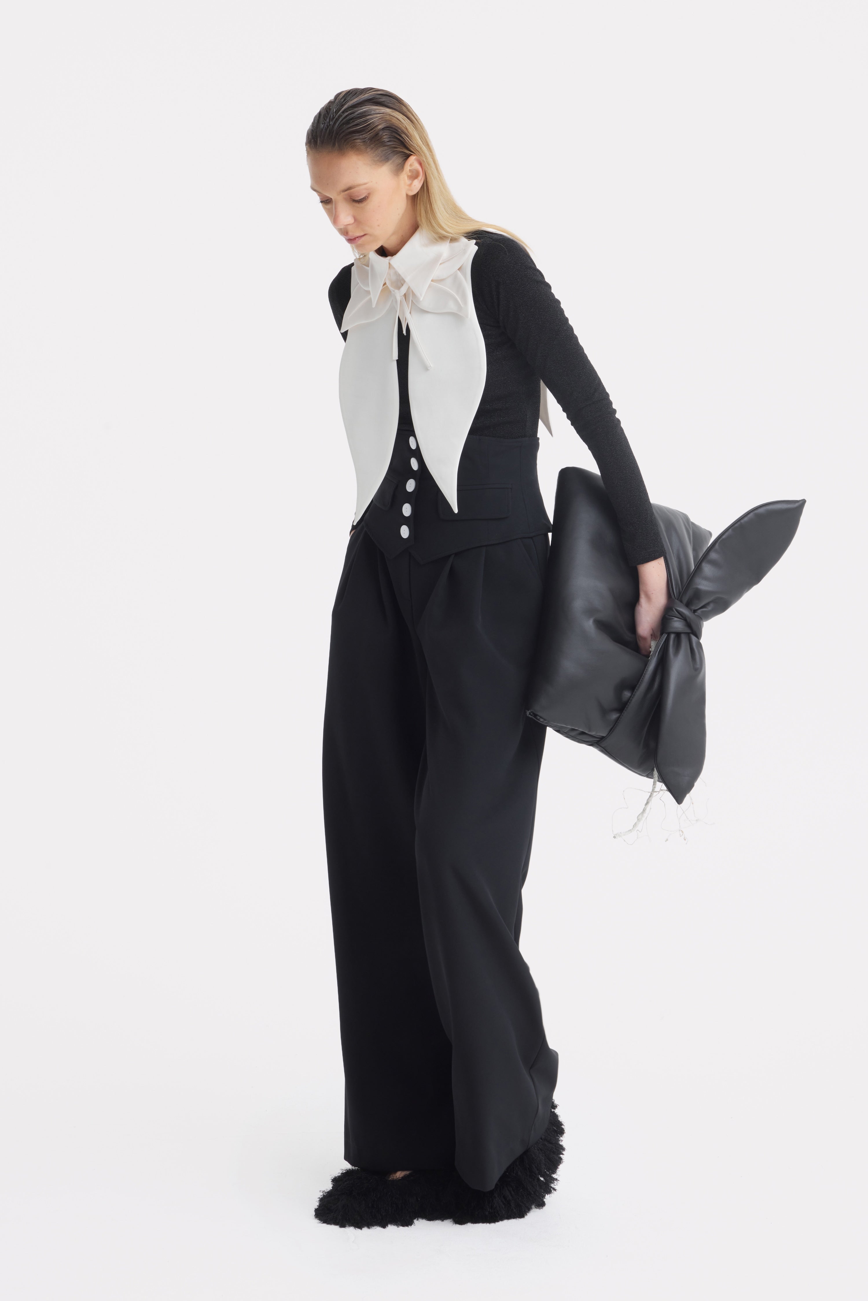 The structured waistband is detailed with decorative buttons and sculptural faux pocket flaps, drawing inspiration from classic tailoring and uniform aesthetics. Integrated boning within the waist provides subtle support, ensuring the trousers maintain their precise form and flattering fit. A front zipper closure allows for ease of wear, while the wide-leg cut elongates the silhouette and balances the strong waistline.