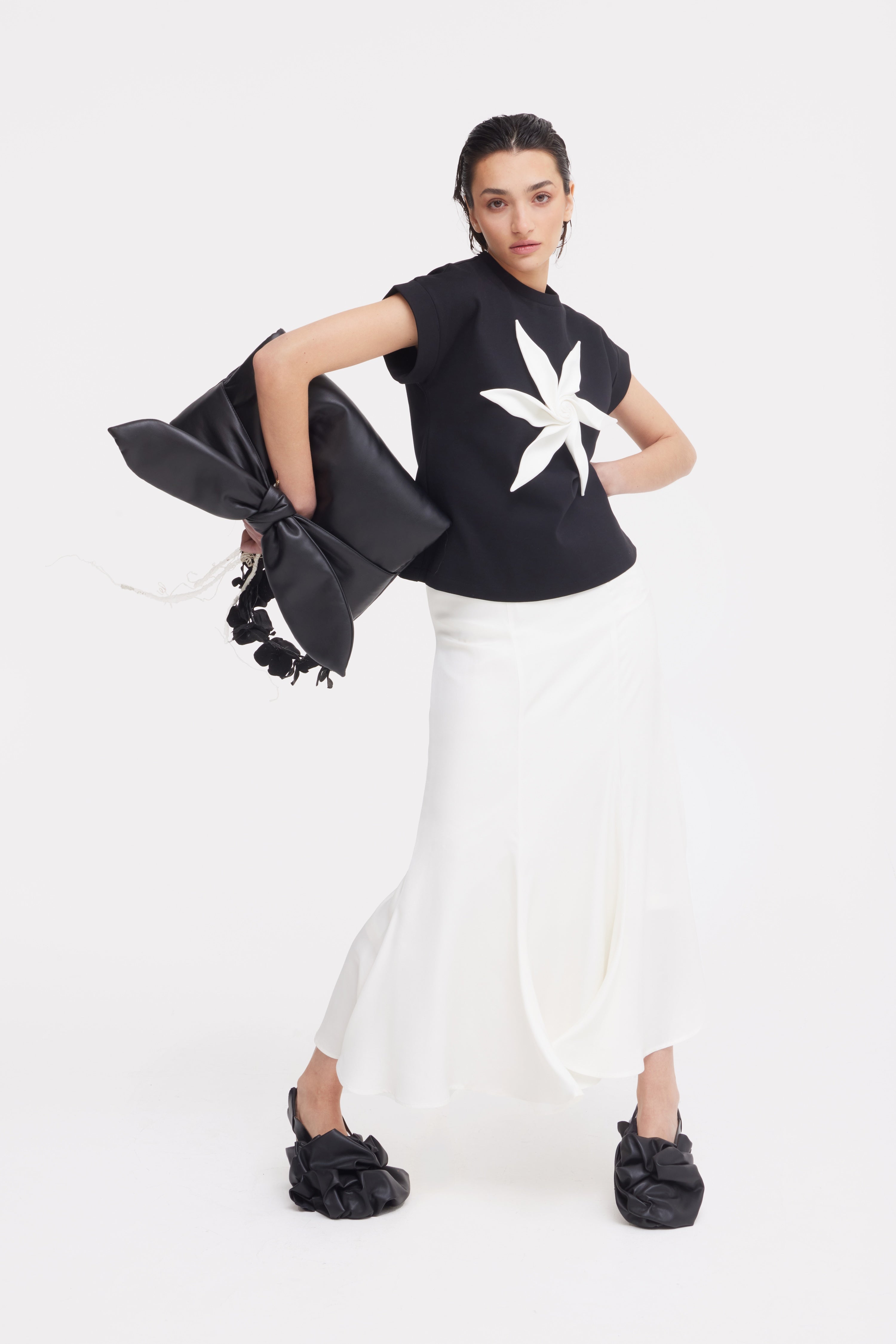 At the center, a three-dimensional ivory flower transforms the piece into wearable art. The sculpted petals, arranged in a dynamic spiral, introduce movement and architectural depth against the minimalist black base. The contrast is bold yet timeless, making it equally suited for day styling with tailored trousers or evening pairing with statement pieces.
