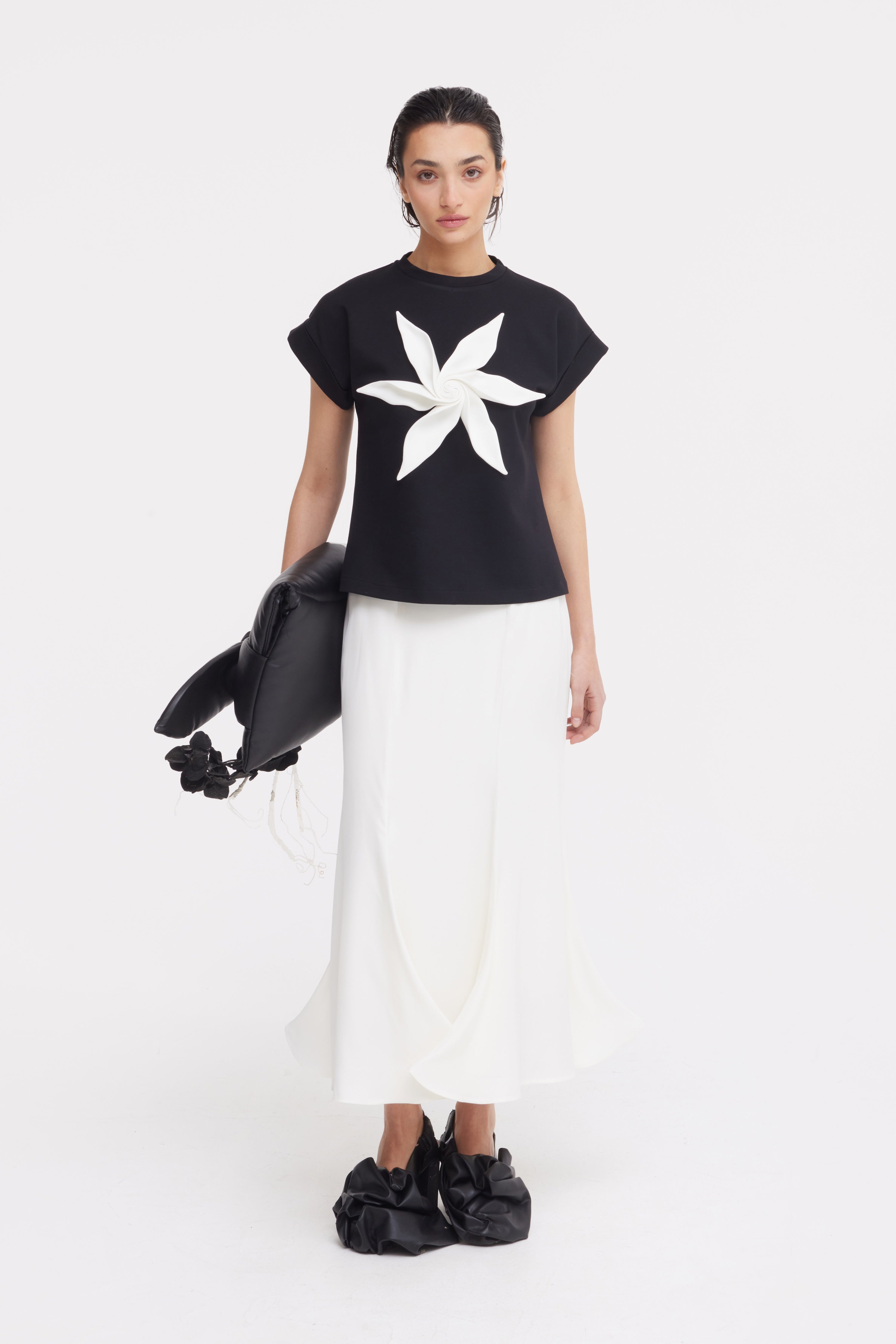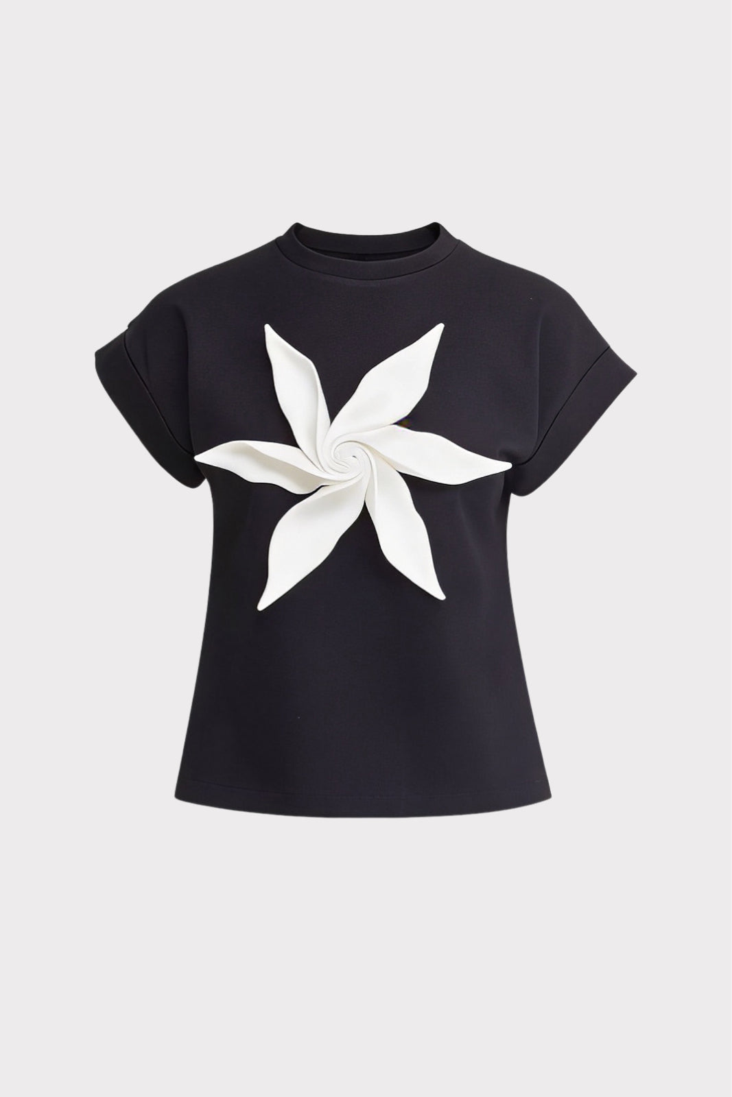 Regular fit · Crew neckline · Short sleeves · 3D floral appliqué · Structured jersey fabric · Black with ivory detail
